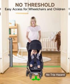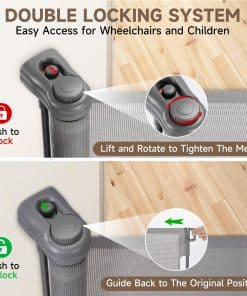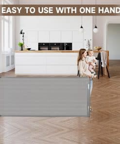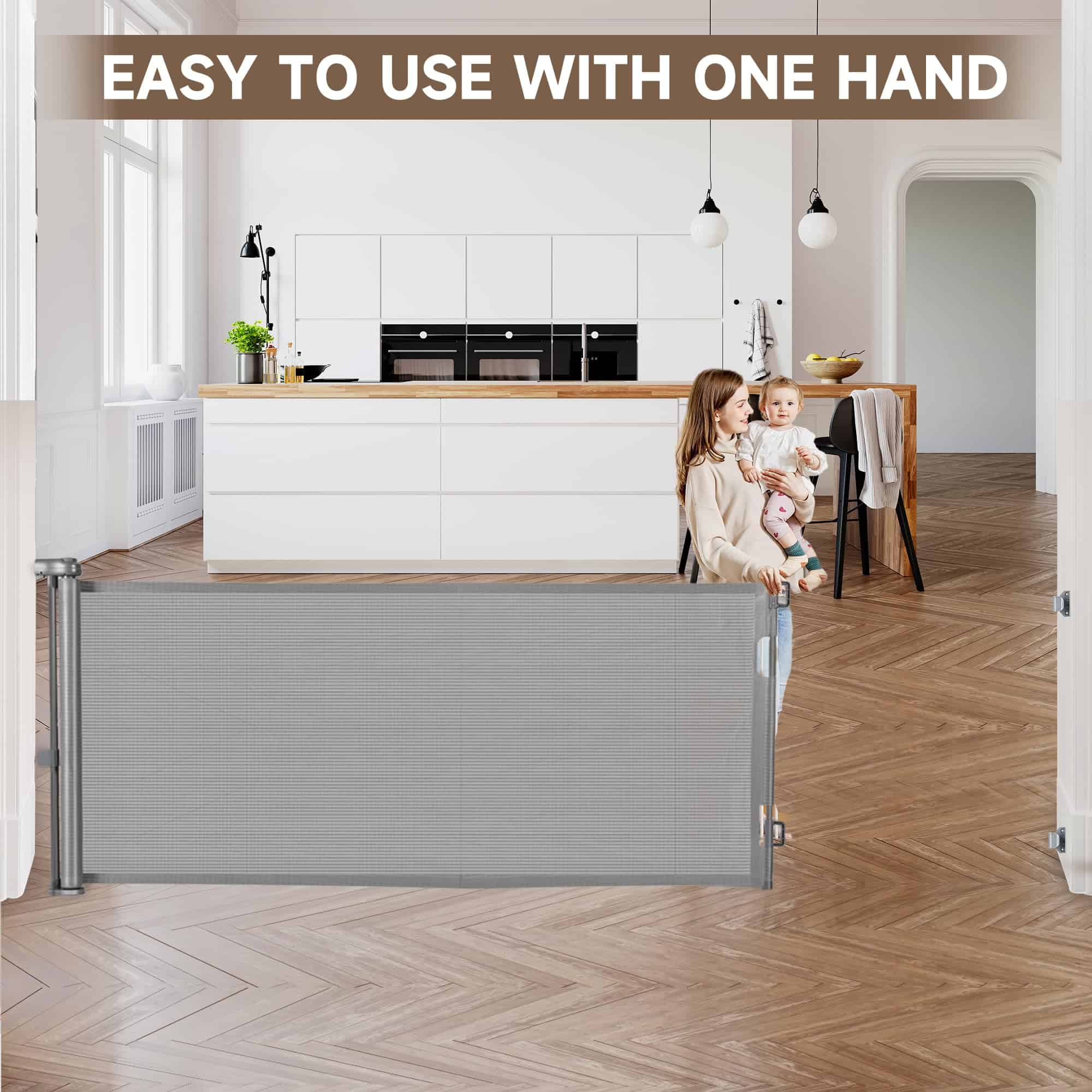 3. Cierre de seguridad: Esta puerta retráctil para bebés fácil cuenta con una función de cierre de seguridad para garantizar que los niños o las mascotas no puedan abrir la puerta de bebé retráctil por sí mismos, pero los adultos pueden sostener al niño y abrir y cerrar la puerta fácilmente con una mano, facilitando la creación de un ambiente independiente y seguro para su hijo.