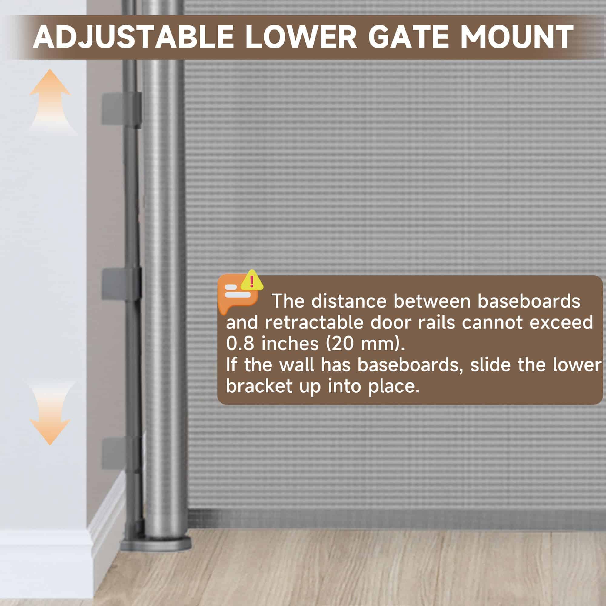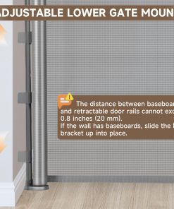 5. Diseño detallado: Esta puerta de perro retráctil tiene un soporte debajo de la puerta ajustable que es adecuado para placas base de diferentes alturas, lo que hace que la instalación sea más fácil y rápida; La puerta tiene dos anillas de tracción fijas para reducir el movimiento y evitar que los bebés y perros se arrastren por debajo de la puerta de malla, que es la demarcación efectiva de áreas seguras.