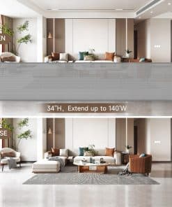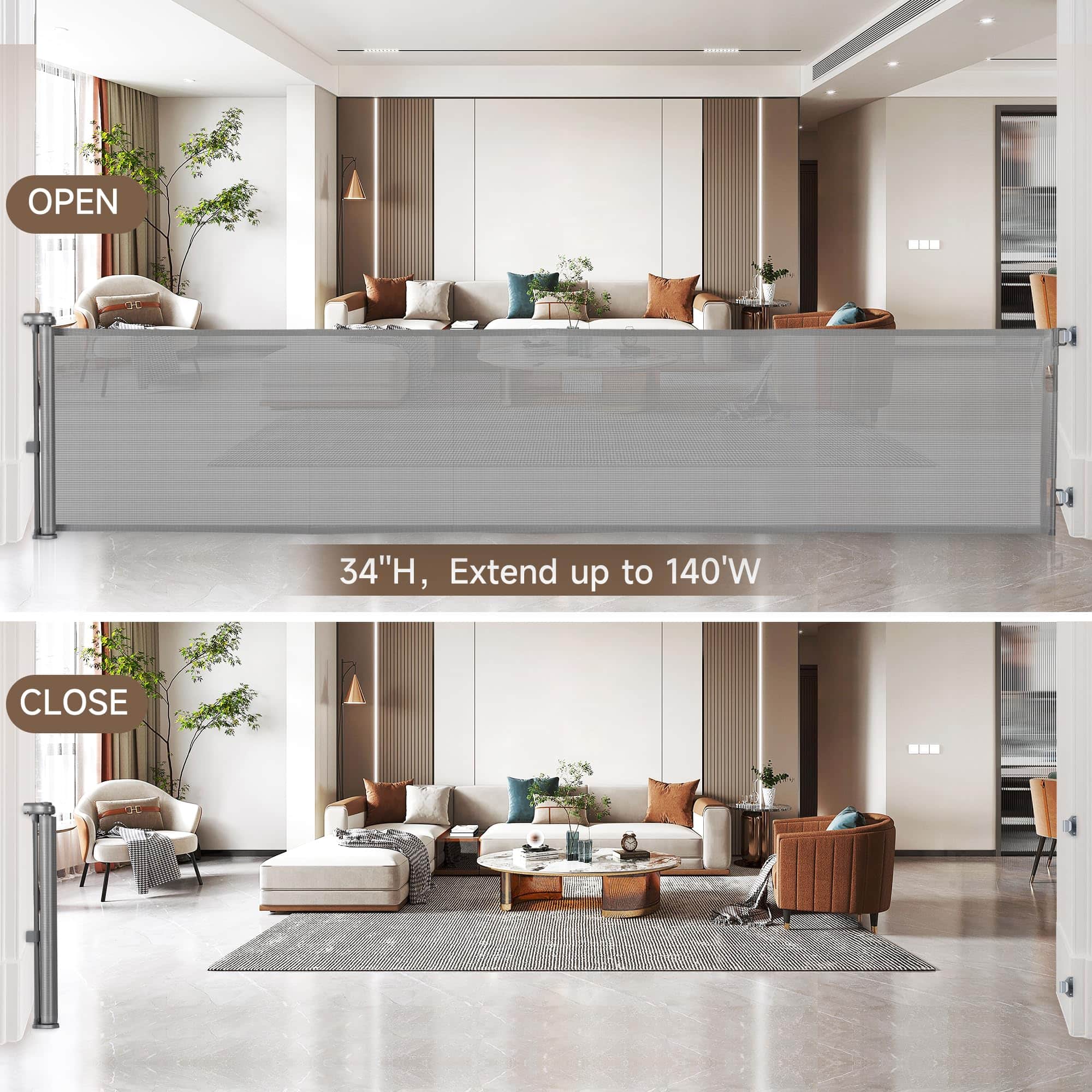 1. Puerta de bebé retráctil extra ancha de 140 pulgadas: Nuestra puerta de bebé retráctil mide 34 pulgadas de altura y es ajustable hasta 140 pulgadas de ancho, ajustable para adaptarse a su apertura según sea necesario, se enrolla ordenadamente para ahorrar espacio cuando no está en uso, y el esquema de color simple se combina perfectamente con el estilo de su hogar.