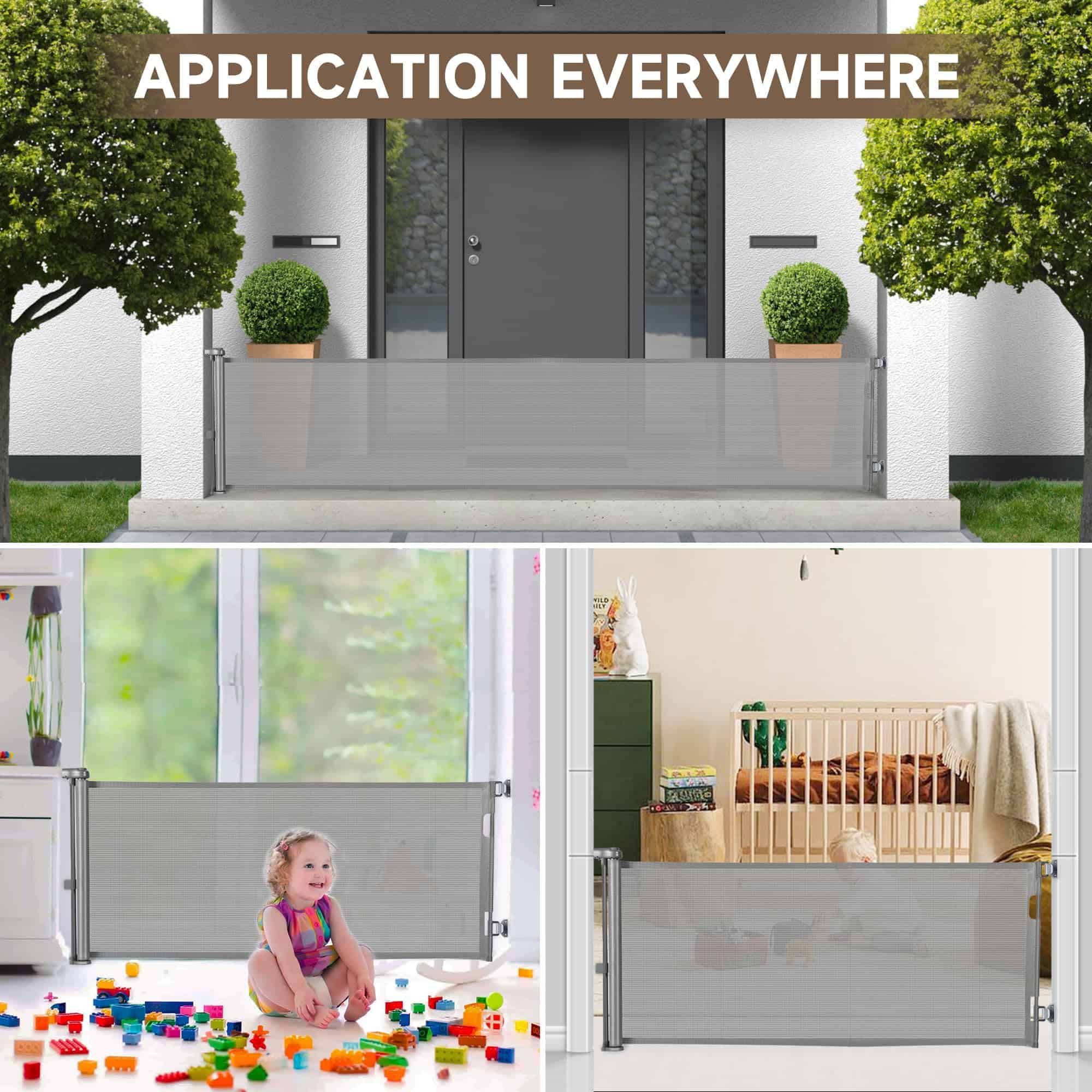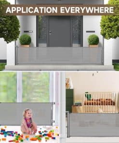4. Aplicable en múltiples escenarios: Nuestra puerta de bebé retráctil de malla se puede utilizar en diversos entornos, adecuada para interiores, exteriores, escaleras, puertas y otros escenarios; Ya sea que esté en la puerta de la habitación de los niños, cocina abierta, parte inferior de las escaleras o puerta de la casa del perro, puede ser utilizado para proporcionar un amplio espacio de juego para los niños y garantizar la seguridad de los niños y mascotas.