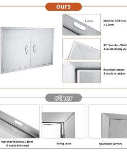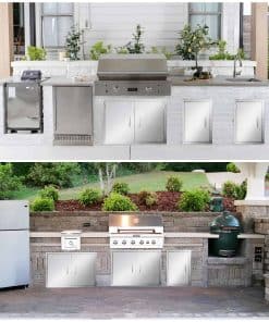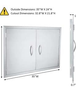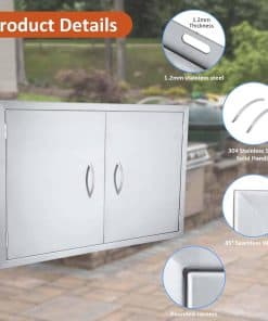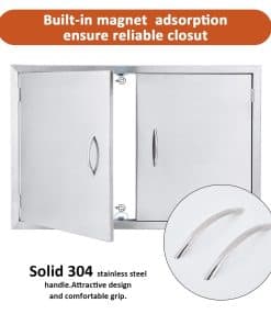 Esta puerta de acero inoxidable para barbacoa al aire libre está fabricada con lámina de acero inoxidable 304 cepillado, con un grosor de 1,2 mm, la superficie cepillada es hermosa y fácil de limpiar. El diseño desmontable con bisagras permite quitar los paneles de la puerta de acero inoxidable sin herramientas, para un fácil almacenamiento de objetos grandes, limpieza y mantenimiento. La parte inferior del marco de la puerta de acero inoxidable para parrilla está equipada con un bloque magnético integrado, que facilita el cierre de la puerta y mejora el sellado de la misma, resistente al agua y al fuego. La poderosa adsorción magnética mantiene el gabinete ajustado y transpirable, previniendo la entrada de moscas. Las esquinas superiores de esta puerta de acero inoxidable están soldadas de forma impecable, sólidas y bellas. El mango sólido de acero inoxidable 304 proporciona un agarre cómodo. La puerta de cocina al aire libre está pulida en todo el cuerpo con esquinas redondeadas, para un uso seguro y confiable y evitar arañazos. Fácil de instalar, la puerta de acero inoxidable tiene orificios pretaladrados en el marco, para instalarla fácilmente en cualquier pared en minutos con montaje empotrado. Tamaño de la puerta de acero inoxidable: 35″ W X 24″ H, Tamaño de la Apertura Sugerido: 32.8″ W X 21.8″ H. Por favor, seleccione el tamaño correcto antes de comprar. Lea las instrucciones de instalación del producto antes de instalarlo. Perfectas para uso en interiores y exteriores, especialmente para cocinas al aire libre e islas de barbacoa. También son adecuadas para chimeneas, fregaderos, puertas de cajas eléctricas, cubos de basura, tanques de gas, despensas y cocinas de coche. Simplemente reserve el tamaño adecuado y podrá montar fácilmente estas parrillas al aire libre en cualquier gabinete o pared con un montaje al ras.