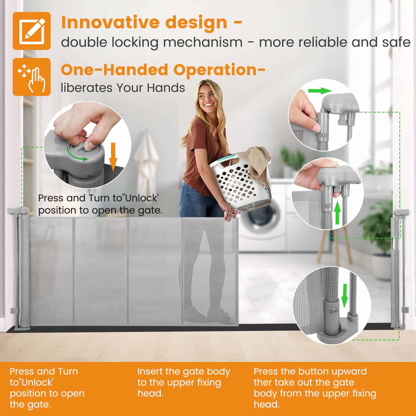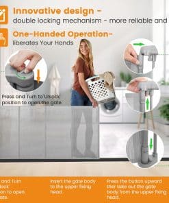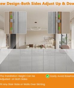 La instalación es pan comido con nuestras instrucciones completas y video de instalación. El ancho ajustable de 59-71-120-150-200 pulgadas y la altura de 35 pulgadas de la puerta permiten una instalación versátil en una variedad de espacios, incluyendo escaleras, puertas, pasillos, interiores y exteriores. El diseño innovador permite una fácil operación con una mano, dándote la libertad de moverte sin problemas.