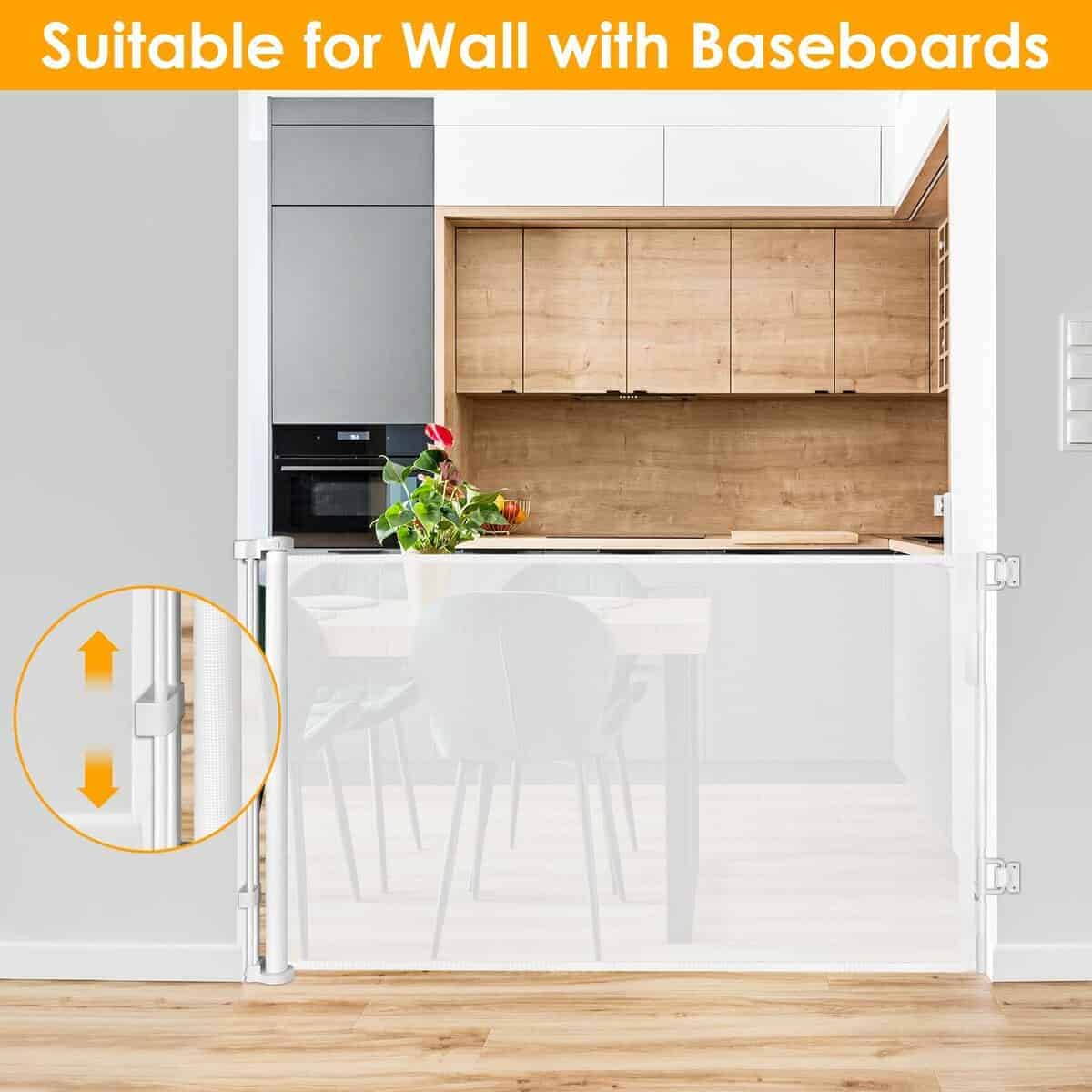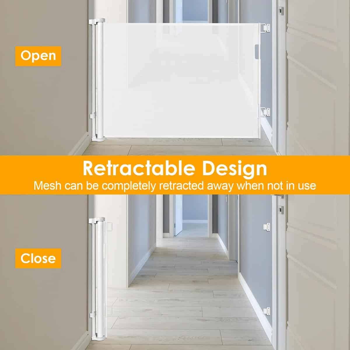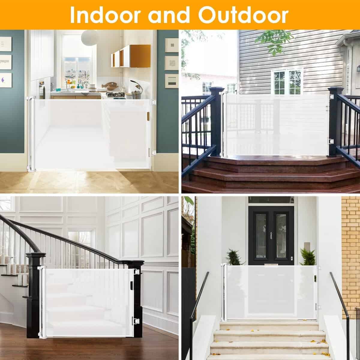 Puertas de seguridad retráctiles para bebés para escaleras 60� Amplia Puertas de malla para bebés para entradas Puerta retráctil para perros Puertas para niños para escaleras Puertas para bebés al aire libre Puerta para niños pequeños para seguridad en escaleras Puerta de seguridad para entradas Puerta de terraza. La puerta retráctil para bebés puede utilizarse en la sala de estar, cocina, lavandería, entradas, parte inferior de escaleras, terraza, porche, patio, puerta de garaje, interior, exterior y otros lugares. Las puertas de entrada para bebés son adecuadas para que los bebés y perros las utilicen y mantengan a tus hijos y mascotas en un ambiente seguro. La malla se puede retraer para adaptarse a aperturas de 0 a 60 pulgadas de ancho. Cuando tus bebés y mascotas no están en casa o cuando tienes amigos reunidos en casa, puedes enrollar la malla sin ocupar espacio. Los adultos pueden abrir la puerta de malla para bebés con una mano cuando estás sosteniendo a un bebé, mientras que los niños no pueden abrir la puerta para niños en las escaleras. La malla es suave y resistente para evitar que tu hijo trepe la barrera para bebés. La malla es resistente a los arañazos y duradera, evitando que las patas del perro rasguen la malla. No hay umbral en la parte inferior, por lo que no hay riesgo de tropiezos cuando estás pasando con las manos ocupadas. No es necesario comprar accesorios adicionales, nuestros accesorios de puertas para bebés al aire libre se deslizan hacia arriba y hacia abajo para adaptarse a una amplia variedad de rodapiés. Necesitas hacer agujeros para instalar la puerta retráctil, lo que es más seguro. Si tienes problemas de instalación, no dudes en contactarnos. Todas las líneas de puertas de malla se prueban según los estándares de seguridad, cumpliendo o superando los estándares ASTM o EN.