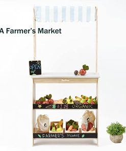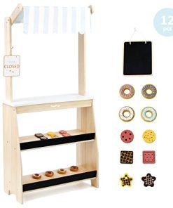 1. Tienda de comestibles de juguete – Un excelente conjunto de juegos de madera para que los niños jueguen a los juegos de simulación. Viene con accesorios de comida de juego que parecen galletas reales (5pcs) y donas (4pcs). Una pequeña pizarra con un lado de tiza.