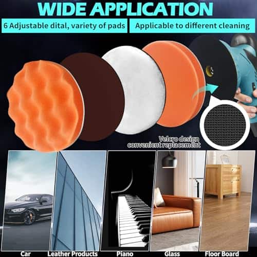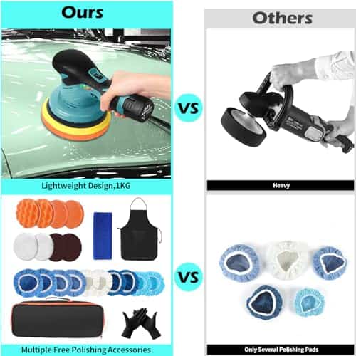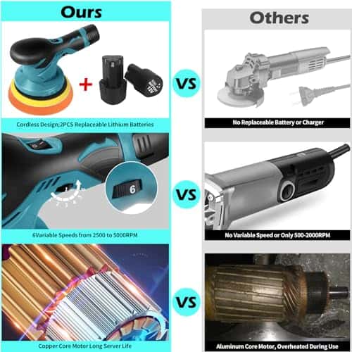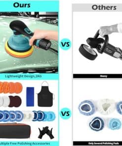 1. Inalámbrico y Potente: Movimiento libre sin restricciones de un cable. Puede pulir en cualquier lugar alrededor del vehículo con facilidad, incluso en áreas alejadas de un enchufe eléctrico. Nuestro pulidor de coche inalámbrico adopta un motor de cobre puro, un 20% más potente que las aleaciones estándar para velocidades más rápidas, mayor tiempo de ejecución y recargas más cortas.