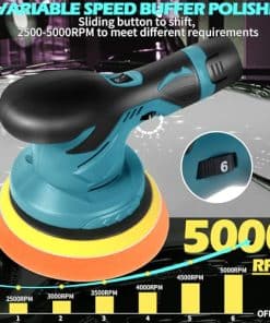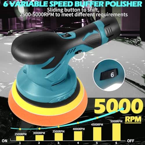 2. Control de Velocidad Variable: 1-3 Velocidades más lentas (alrededor de 1.500 a 3.000 RPM) son necesarias para pulir y encerar, mientras que las velocidades más altas de 4-6 (3.000 a 7.000 RPM) son mejores para corrección de pintura y pulido de defectos. La velocidad variable del pulidor inalámbrico le permite igualar el ajuste adecuado para su tarea.