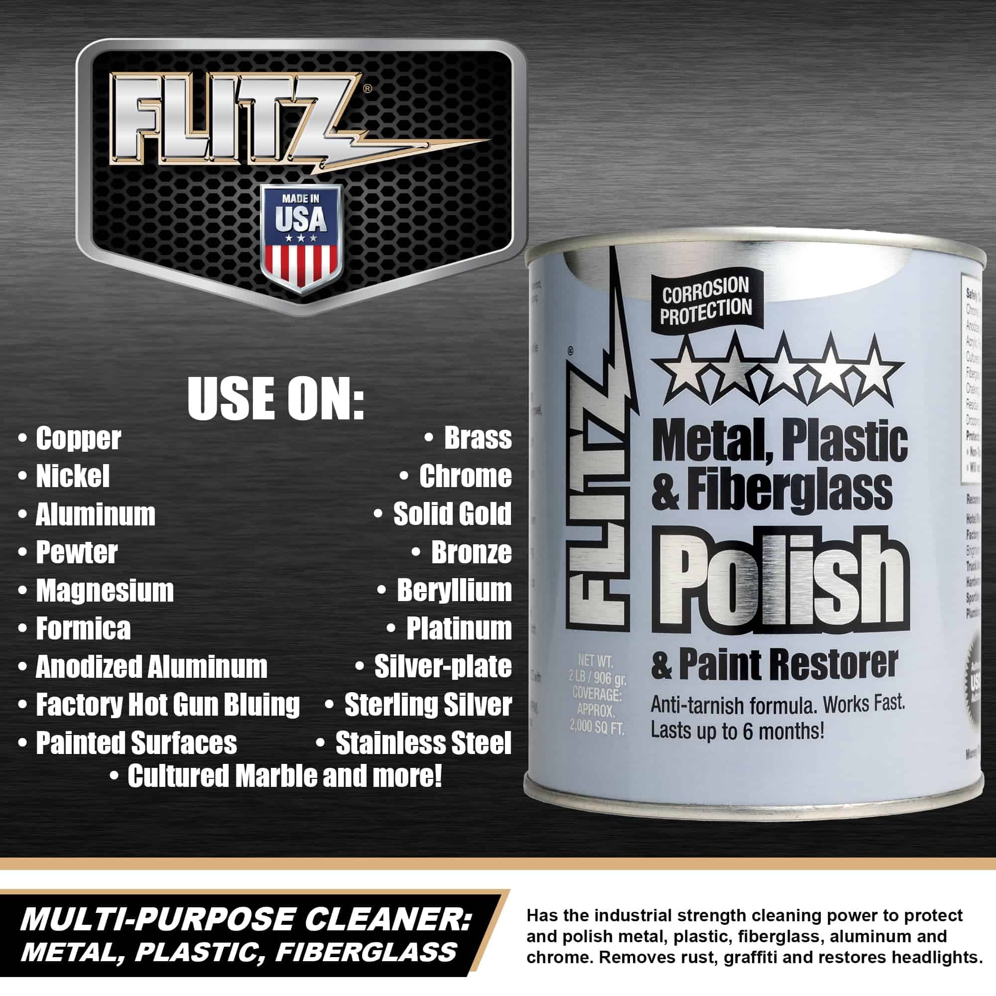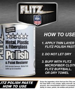 Una crema concentrada que es insuperable en su capacidad para limpiar, pulir, desoxidar y proteger. Este producto funciona más rápido y con más facilidad. Puede ser utilizado en: latón, cobre, plata plateada, plata esterlina, cromo, acero inoxidable, níquel, bronce, oro sólido, aluminio, aluminio anodizado, berilio, magnesio, platino, peltre, azul caliente de fábrica, superficies pintadas, fórmica, mármol de cultivo, corian, vidrio, plexiglás, plásticos, fibra de vidrio, eisenglass y armatel. Esto ayuda a eliminar el óxido, las manchas de agua, el chorreado, los depósitos de cal, la decoloración por calor, el plomo y los residuos de pólvora, la oxidación, los insectos, el alquitrán, el aceite, las huellas dactilares, la resina de los árboles, las heces de pájaros, los grafitis, los tintes, las rayas negras y las marcas de rozaduras. Esto es aprobado por el USDA y no es tóxico.