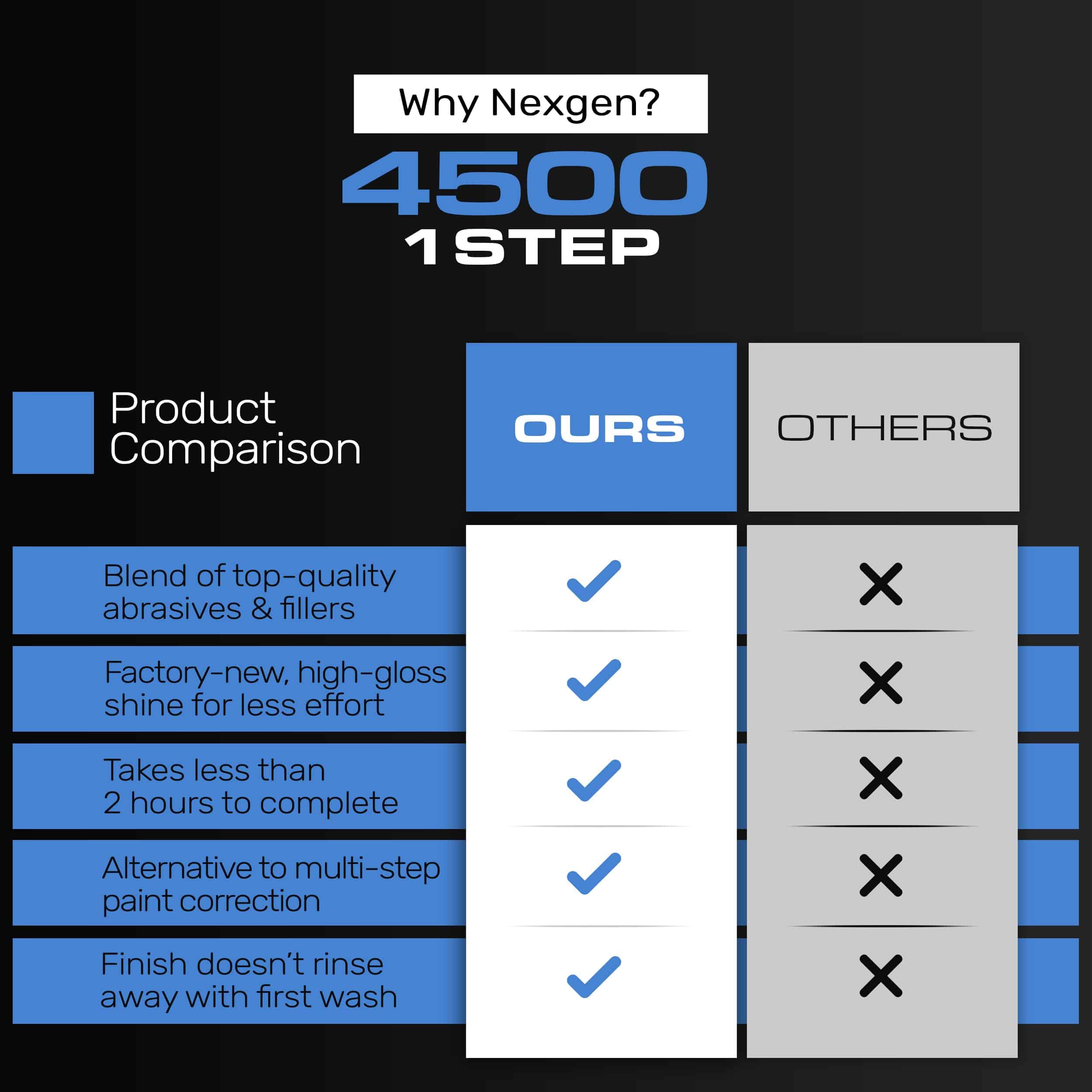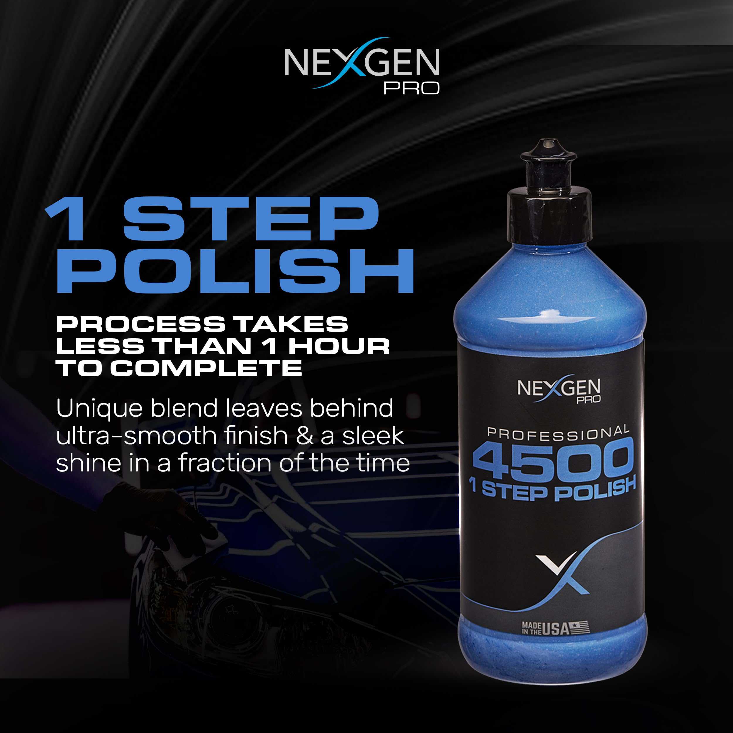 La mezcla especial de abrasivos y rellenadores de alta calidad de este compuesto para pulido de coche, elimina la apariencia de daños leves a moderados y deja un brillo reluciente y elegante que recuerda a la pintura recién salida de fábrica. El Pulidor de Coche Nexgen 4500 One-Step es la solución de élite para resultados impresionantes similares a una corrección de pintura con una fracción del esfuerzo y tiempo requerido. Tanto para detallistas independientes como para concesionarios de coches, nuestro Pulidor Nexgen 4500 One-Step elevará la experiencia del cliente y te ahorrará tiempo, esfuerzo y dinero. Este compuesto para pulido automotriz pule y corrige la pintura con marcas de remolino leves a moderadas y defectos en menos tiempo. Nuestro compuesto de pulido auto 4500 es la solución de un solo paso para cualquier trabajo de corrección de pintura que combina y pule en un solo paso. Diseñado para mejorar la apariencia de la pintura automotriz en un solo paso, el Compuesto de Pulido 4500 One-Step es ideal para usar en SUVs de tamaño mediano y vehículos similares, ayudando a restaurar el brillo y la suavidad con una aplicación rápida y sencilla. Puedes aplicar el pulidor Nexgen Pro 4500 1 Step a mano utilizando una almohadilla de microfibra y en todo tipo de máquinas incluyendo pulidoras rotativas, DA, rotación forzada, etc. No limitado al uso automotriz, este compuesto de pulido también se puede aplicar en acabados marinos y recubrimientos industriales.