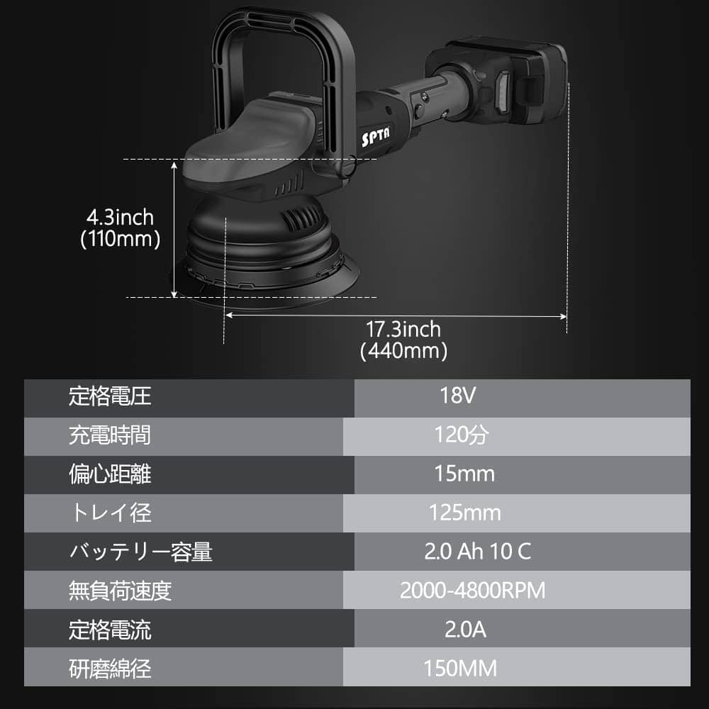 SPTA se especializa en productos de detallado de automóviles desde hace más de 10 años. La pulidora de coche cuenta con una potencia de entrada nominal de 800W, velocidad sin carga de 3000-5000 RPM, capacidad de batería de 20V, 4000mAh y órbita de 15 mm. El paquete incluye la pulidora de coche inalámbrica, 2 baterías de iones de litio, un cargador rápido, 3 almohadillas de pulido de esponja, una almohadilla de lana, 2 paños de microfibra, un guante de lavado. Las aplicaciones varían desde pulir automóviles, motocicletas, mármol, madera, metal, hasta limpiar hogares y muebles.