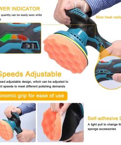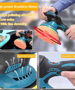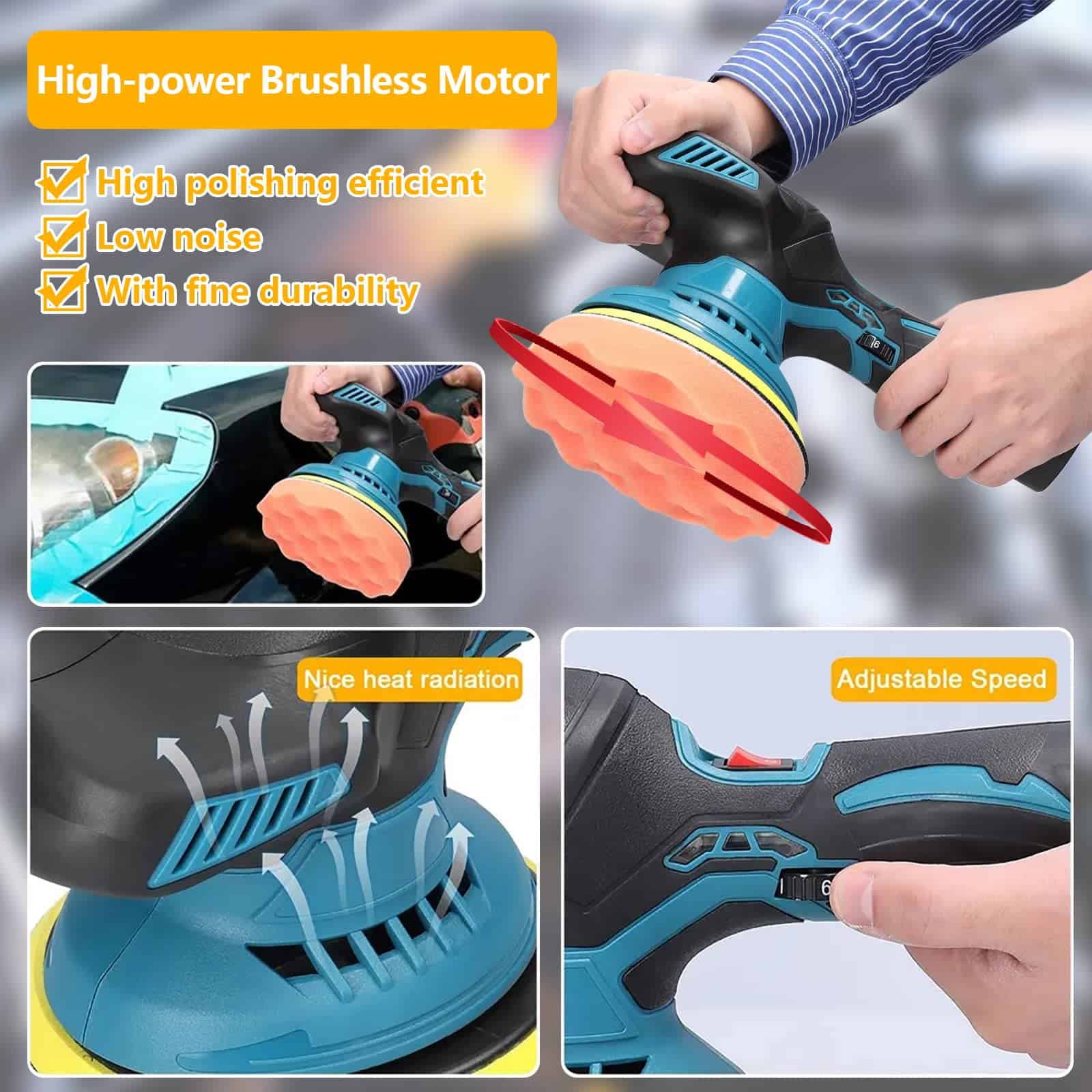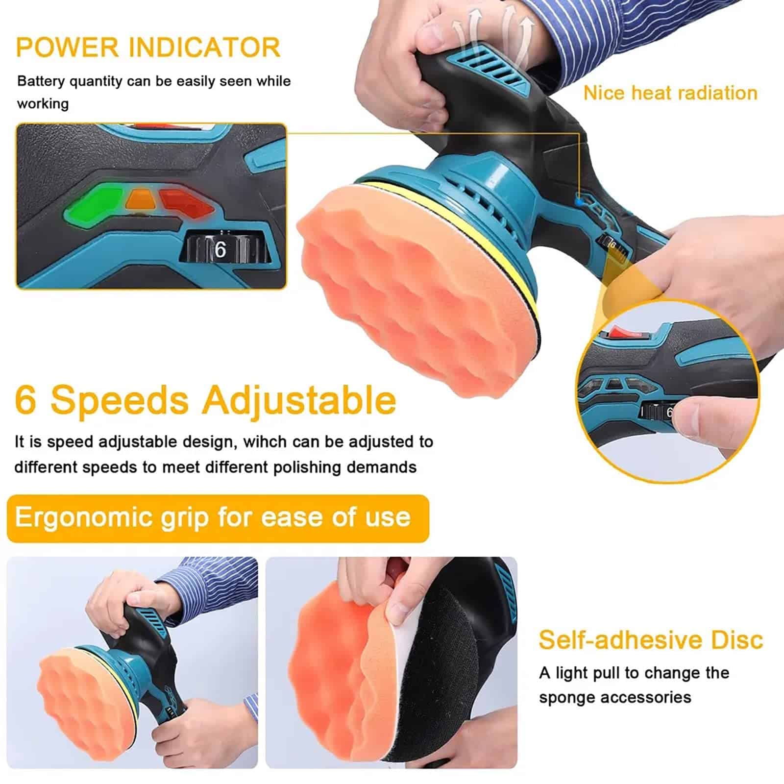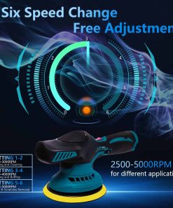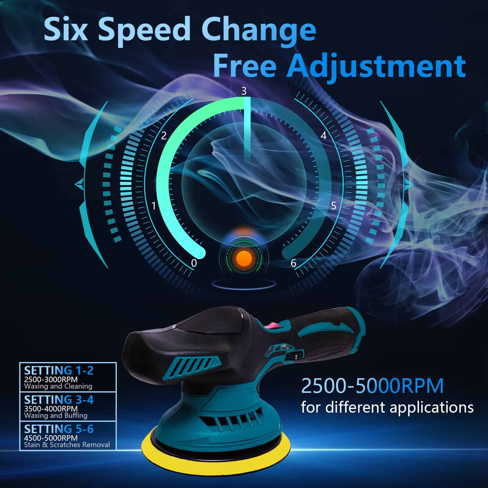 3. Motor sin escobillas premium incorporado y sin ruido: El motor de cobre puro y de 4 polos proporciona más potencia y acción dual mientras produce menos ruido. Velocidad ajustable de 1 a 6 niveles, completamente ajustable de 2500-5000 RPM Perfecto para el detallado de coches, lijado de gabinetes de cocina, pulido y encerado, haciendo que tu coche brille como un espejo.