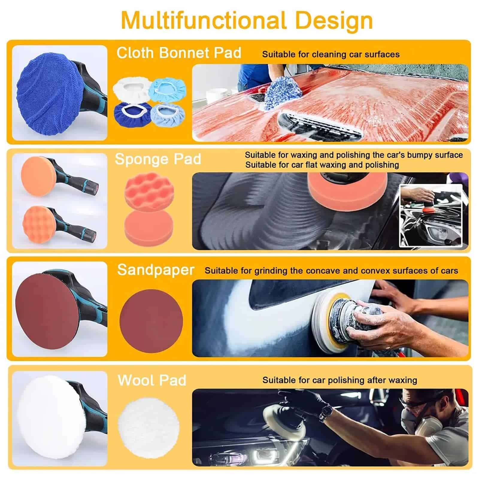 5. Función de recordatorio de batería y accesorio multifunción: Esta pulidora de parachoques inalámbrica tiene una función de recordatorio de estado de carga de la batería. El indicador luminoso tiene 3 colores: verde, amarillo y rojo. Se pondrá verde cuando la batería esté completamente cargada y roja cuando la batería necesite cargarse. Viene con hasta 17 piezas de varios accesorios de pulido. Estos accesorios son perfectos para cualquier trabajo de pulido, lijado o encerado.