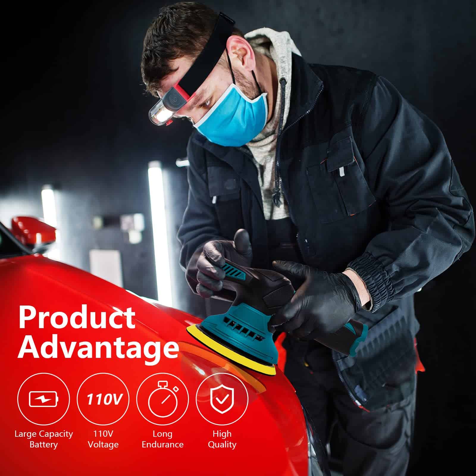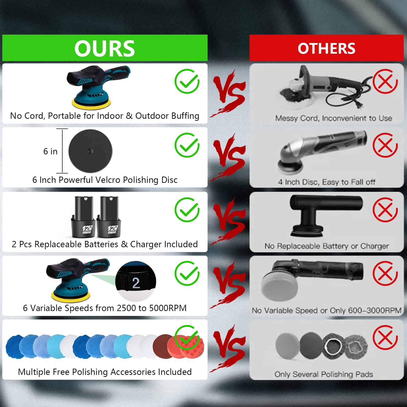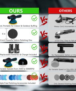 1. Pulidora portátil sin cables: Esta pulidora de 6 pulgadas, en comparación con la pulidora de coche tradicional con cable, pesa solo 1 kg (2.3 lbs, incluida la batería), esta pulidora de coche inalámbrica mejorada es más portátil de usar, ya no tendrás que preocuparte por que el coche se enrede con los cables, ni tropezar con los cables, ni la peligrosa combinación de electricidad y agua.