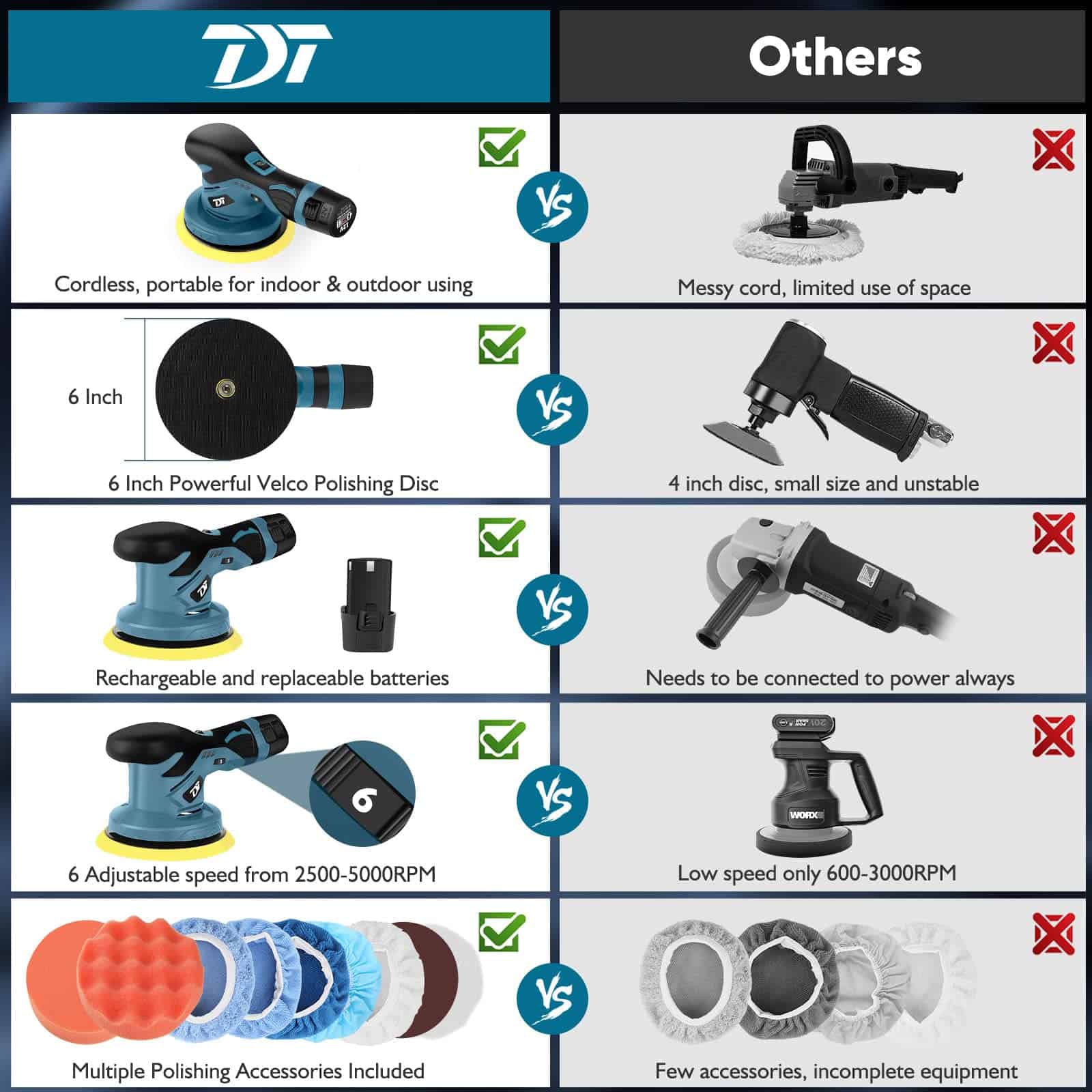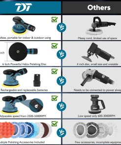 5. Motor sin escobillas potente y silencioso En el interior, hay un motor potente, que está hecho de todo cobre con antiinterferencia. El cobre puro y un motor de 4 polos brindan más potencia y doble acción mientras producen menos ruido. No molestará a los demás, y su entorno de trabajo ya no estará rodeado de ruido ruidoso. 6. Plato de respaldo de 6″ fuerte La pulidora de automóvil inalámbrica TDT está bien hecha, diseñada con un tamaño de pulido grande de 6 pulgadas, fácil de pegar con firmeza con la almohadilla de pulido y nunca separarse. Con superficie de gancho y lazo, puede cambiar rápidamente las almohadillas de pulido. le brinda un pulido más eficiente, ahorrando el doble de su tiempo y energía mientras realiza un trabajo de pulido de automóviles ocupado.
