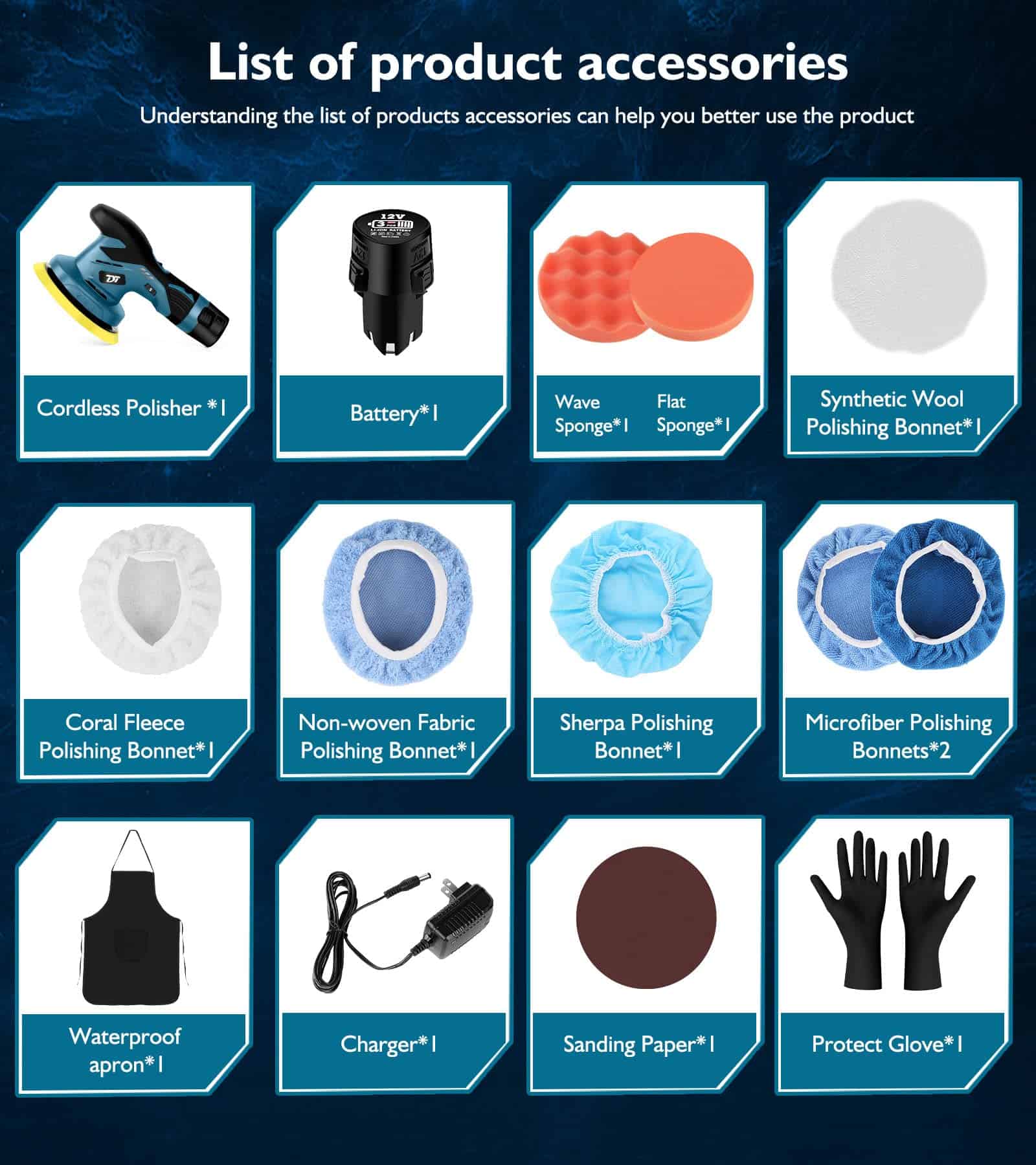 3. Batería reemplazable de gran capacidad El kit de pulidora de automóvil contiene una batería de litio eficiente de 2000mAh, que es suficientemente segura y de alto rendimiento, la batería puede proporcionar 50 minutos de detallado de automóvil. Y equipado con un cargador, la carga es simple, rentable y conveniente.