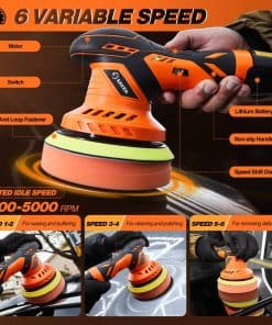 4. Control de Velocidad Variable: La pulidora de Saker ofrece una potente órbita aleatoria de doble acción con un ruido mínimo. Tiene 6 velocidades ajustables para satisfacer diferentes necesidad para un detallado efectivo de automóviles y una velocidad de ralentí de hasta 5000 rpm.