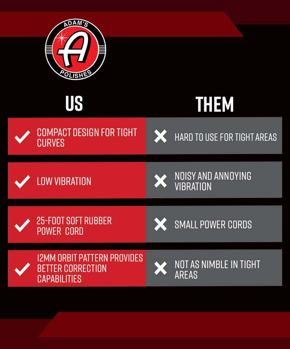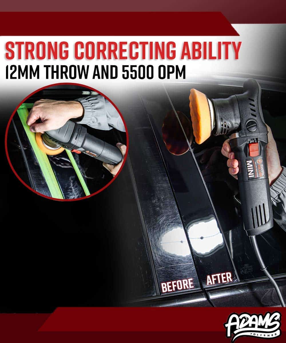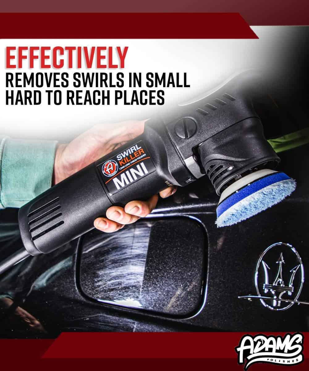 La Pulidora Orbital Adam’s Swirl Killer MINI 12mm fue diseñada pensando en nuestros clientes. Esta máquina pulidora de corrección de puntos será una herramienta imprescindible en tu proceso de corrección de pintura una vez que la pruebes. Encontrarás un uso para ella en casi cualquier vehículo que corrijas la pintura, donde una almohadilla más grande y nuestra Pulidora Swirl Killer no puedan adaptarse. El Swirl Killer MINI está diseñado para usarse en la corrección de áreas específicas de un vehículo donde una pulidora de máquina de tamaño completo no pueda adaptarse. No está diseñado ni destinado a usarse para corregir la pintura de un vehículo entero. La mayoría de las marcas de remolinos se pueden eliminar en la configuración de velocidad 3 o 4 en el dial de velocidad ajustable, y las velocidades más altas 5 y 6 se dejan para arañazos más pesados. La Pulidora Orbital Adam’s Swirl Killer MINI te permite terminar una superficie de manera sorprendente, lo más cercano posible a impecable con un esfuerzo mínimo. En algunos casos, esto se puede lograr en tan solo un paso de pulido, a diferencia de las pulidoras rotativas. Las pulidoras rotativas pueden dejar hologramas o rastros de pulido debido a la técnica incorrecta, el tipo de almohadilla o el compuesto, lo que luego requiere pasos de pulido adicionales para que la superficie quede libre de hologramas. El mayor desplazamiento del Swirl Killer MINI en comparación con otras pulidoras orbitales aleatorias tradicionales permite una corrección más fuerte y rápida, al tiempo que sigue siendo segura en la superficie. Por estas razones, las Pulidoras de Largo Alcance están reduciendo la brecha en cuanto a ahorro de tiempo en comparación con las Pulidoras Rotativas.