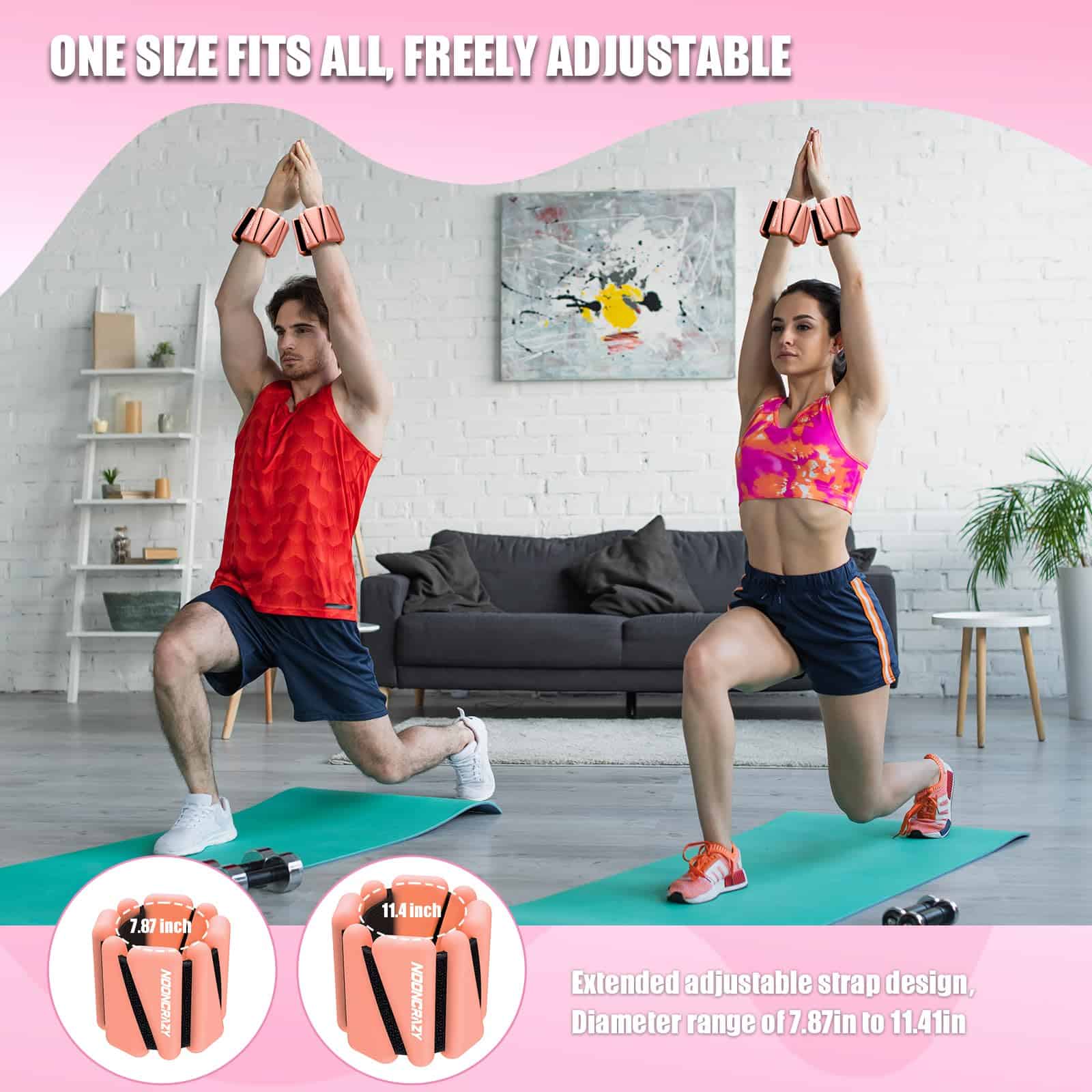 1. UN TAMAÑO PARA TODOS Nuestras pesas de muñeca de 2 lb cuentan con tiras ajustables de alta elasticidad y cierres resistentes para evitar resbalones durante el entrenamiento. El material de silicona amigable con la piel garantiza una comodidad durante todo el día para una amplia gama de actividades físicas. Estas pulseras con peso se ajustan a circunferencias de muñeca o tobillo desde 7.87 pulgadas hasta 11.43 pulgadas, para adaptarse a hombres y mujeres de todos los tamaños para un ajuste personalizado.