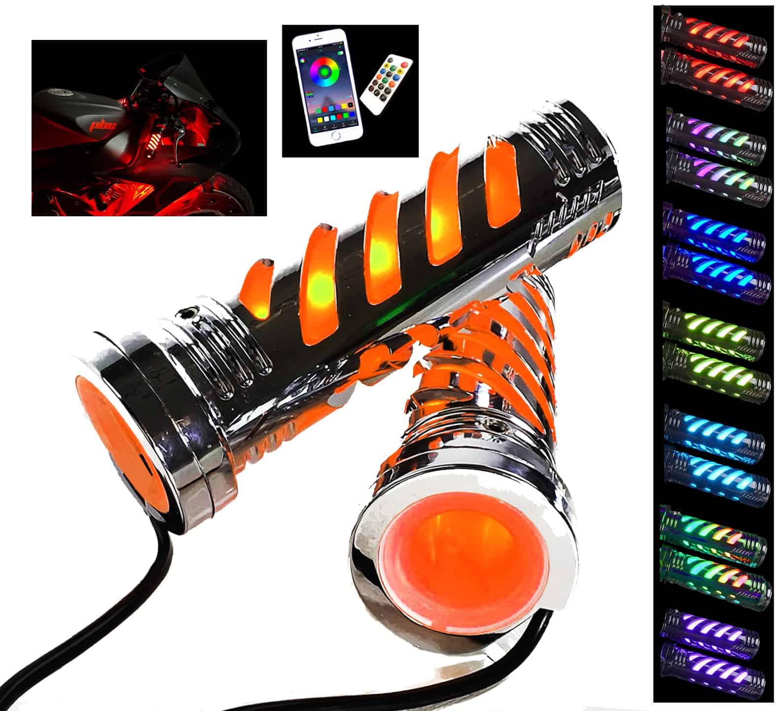1. Puños iluminados: Luces LED RGB multicolores integradas en los puños de la motocicleta que proporcionan una mayor visibilidad y un elegante brillo.