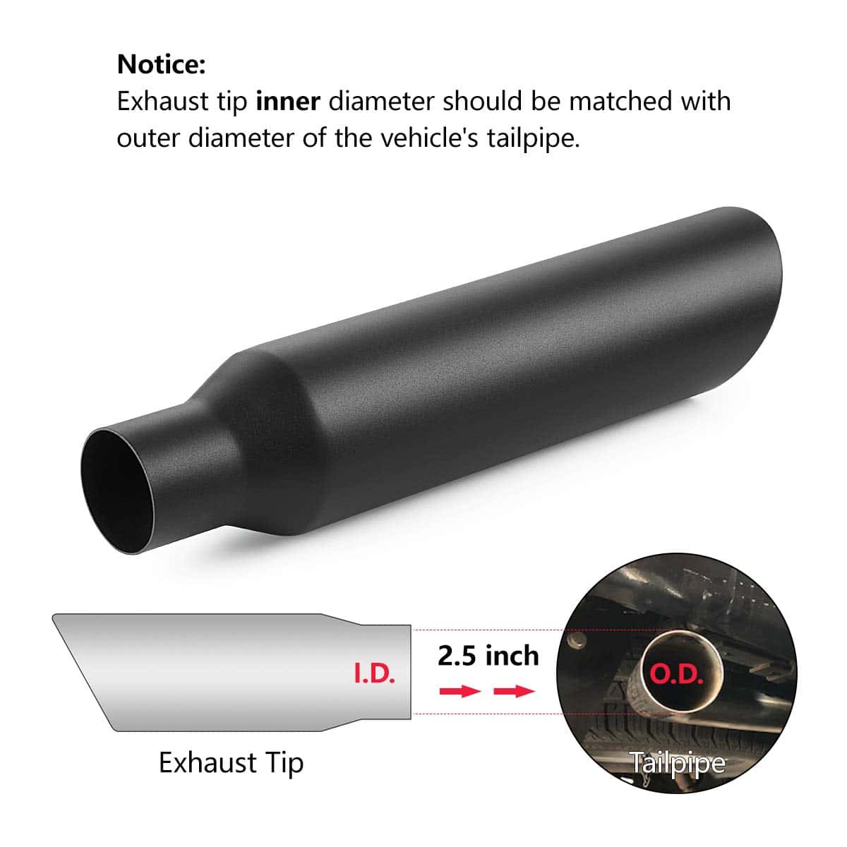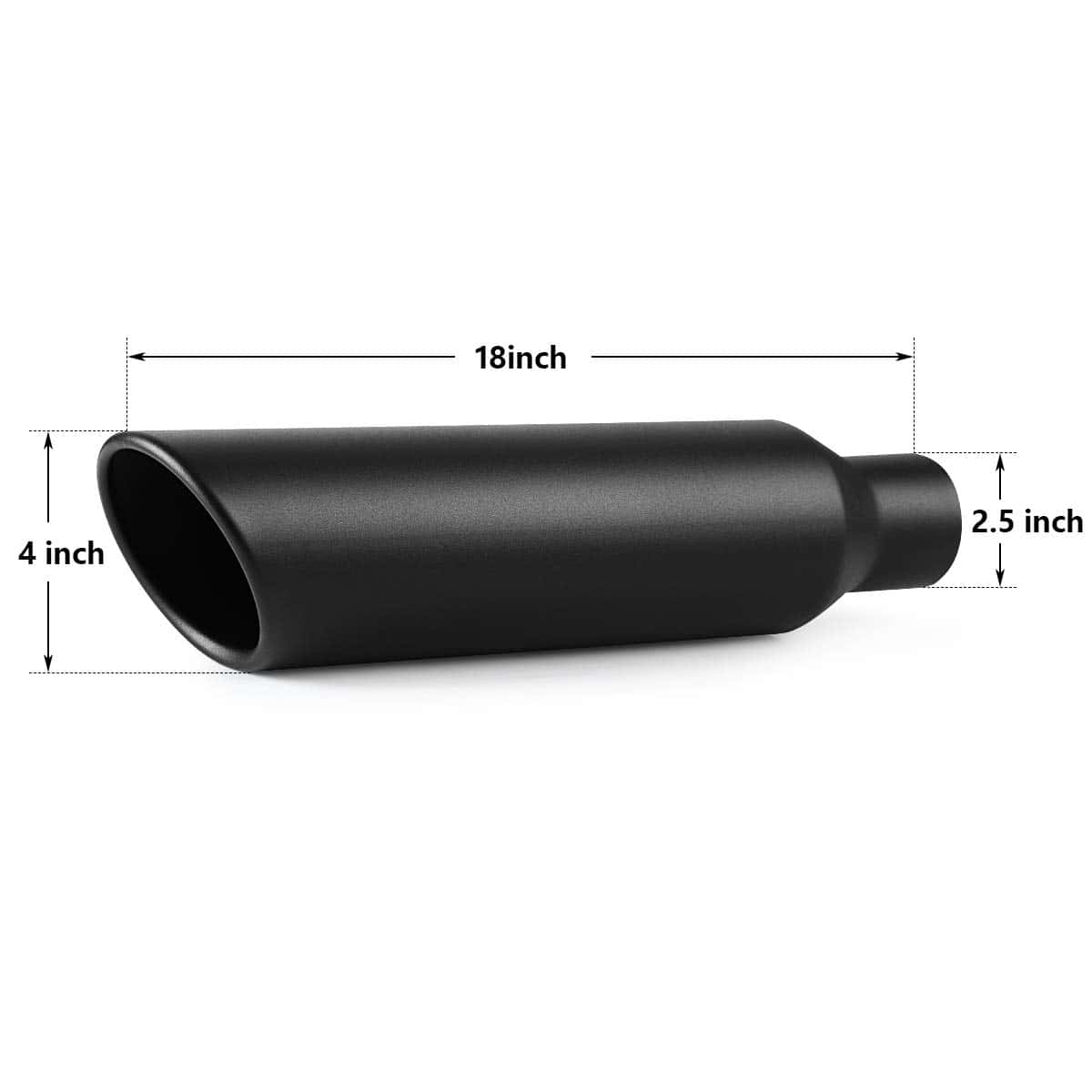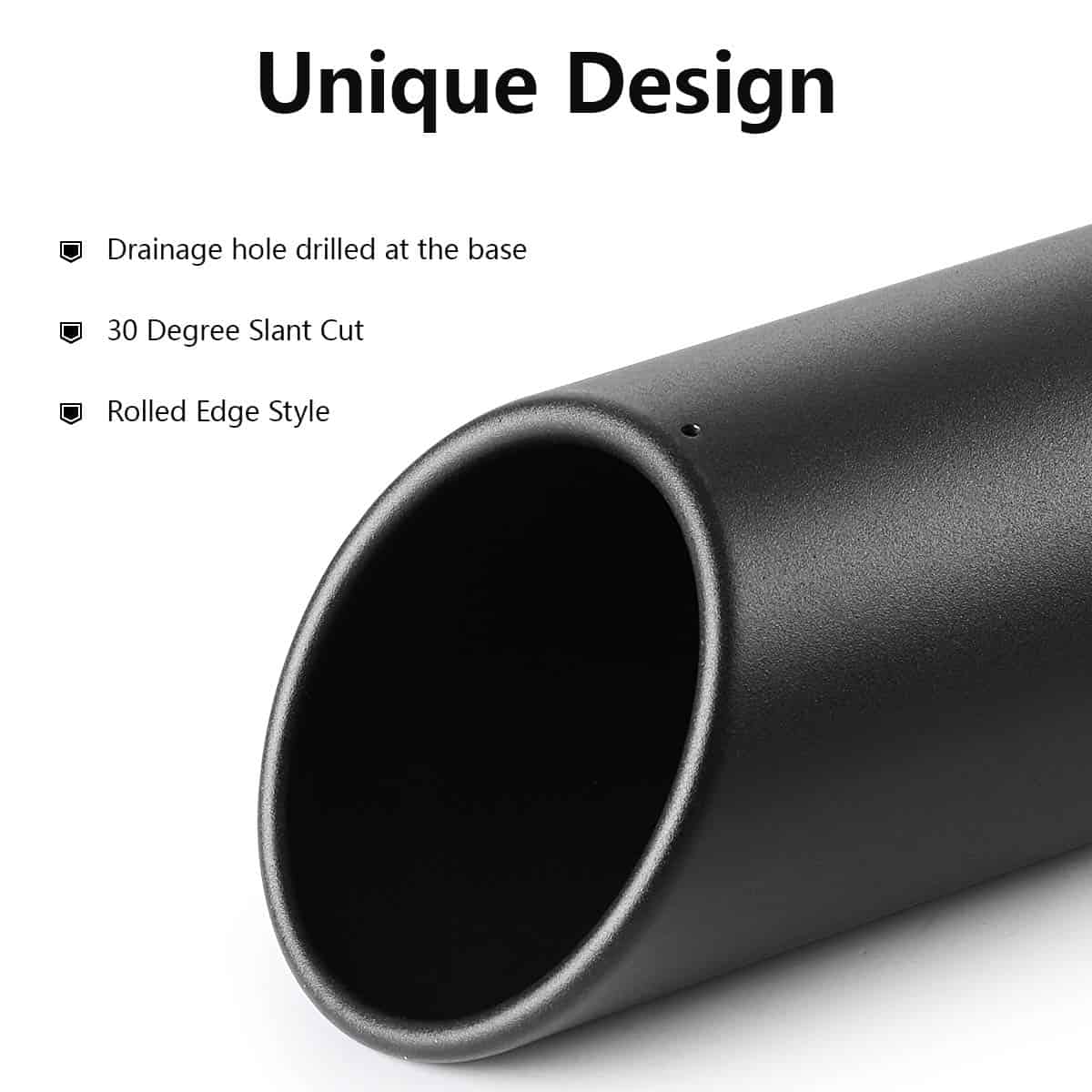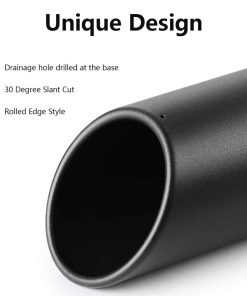 Punta de escape con entrada de 2.5″ y salida de 4″ diseñada para adaptarse a tubos de escape con un diámetro exterior de 2.5″. Fabricada en acero inoxidable para proteger el tubo de escape existente contra la corrosión y la deformación. El recubrimiento negro evita la erosión causada por la lluvia, asegurando una larga vida útil. Su exterior negro puro y elegante puede embellecer y mejorar la apariencia de su vehículo. La instalación soldada garantiza una fijación segura, evitando que la punta de escape se caiga durante recorridos todoterreno o urbanos. Además, su diseño único incluye un agujero de drenaje en la parte inferior para garantizar un drenaje suave y evitar la acumulación de óxido.