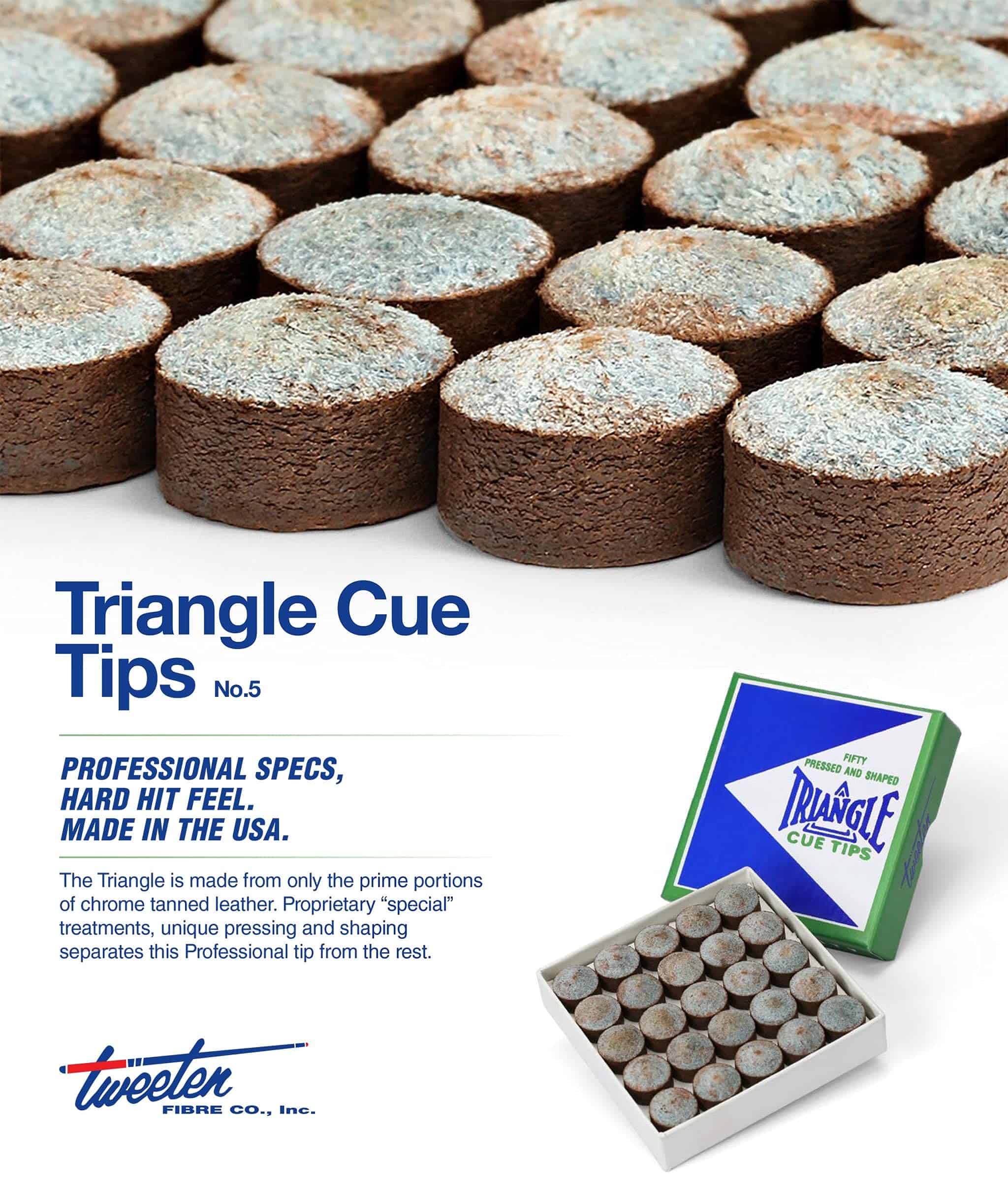 Hecho en EE. UU. por Tweeten Fibre Company. Tipo de punta: Juego. La punta de taco Triangle es reconocida como una de las más firmes, de alta calidad y consistentes de la industria. Diámetros de punta: 9-14 mm. El precio es por 50 puntas (1 caja).
