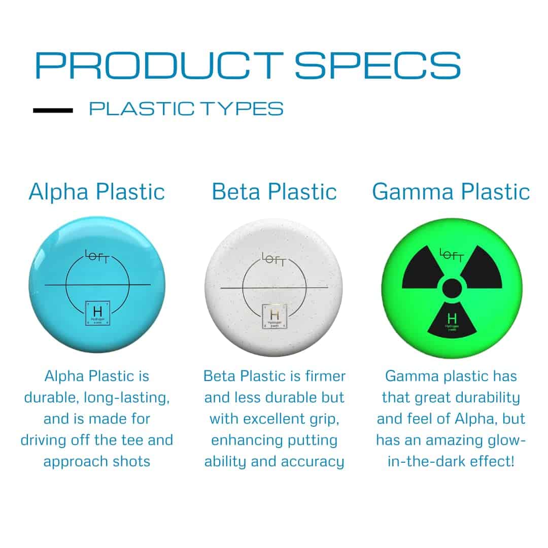 4. SOBRE EL PLÁSTICO – El plástico Alpha es el plástico premium de Loft. Es extremadamente duradero y adherente pero con una apariencia muy suave y hermosa. Beta es más rígido, mejor para el putt, y se desgasta más rápido. Glow es similar a Alpha, pero con efecto Gamma Glow añadido! Supernova también es similar a Alpha, pero es súper veteado y hermoso!.