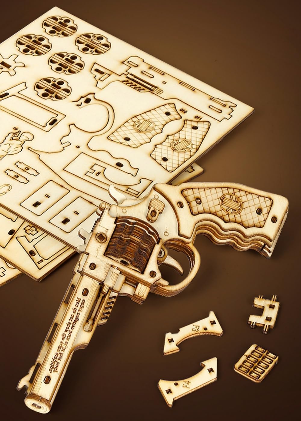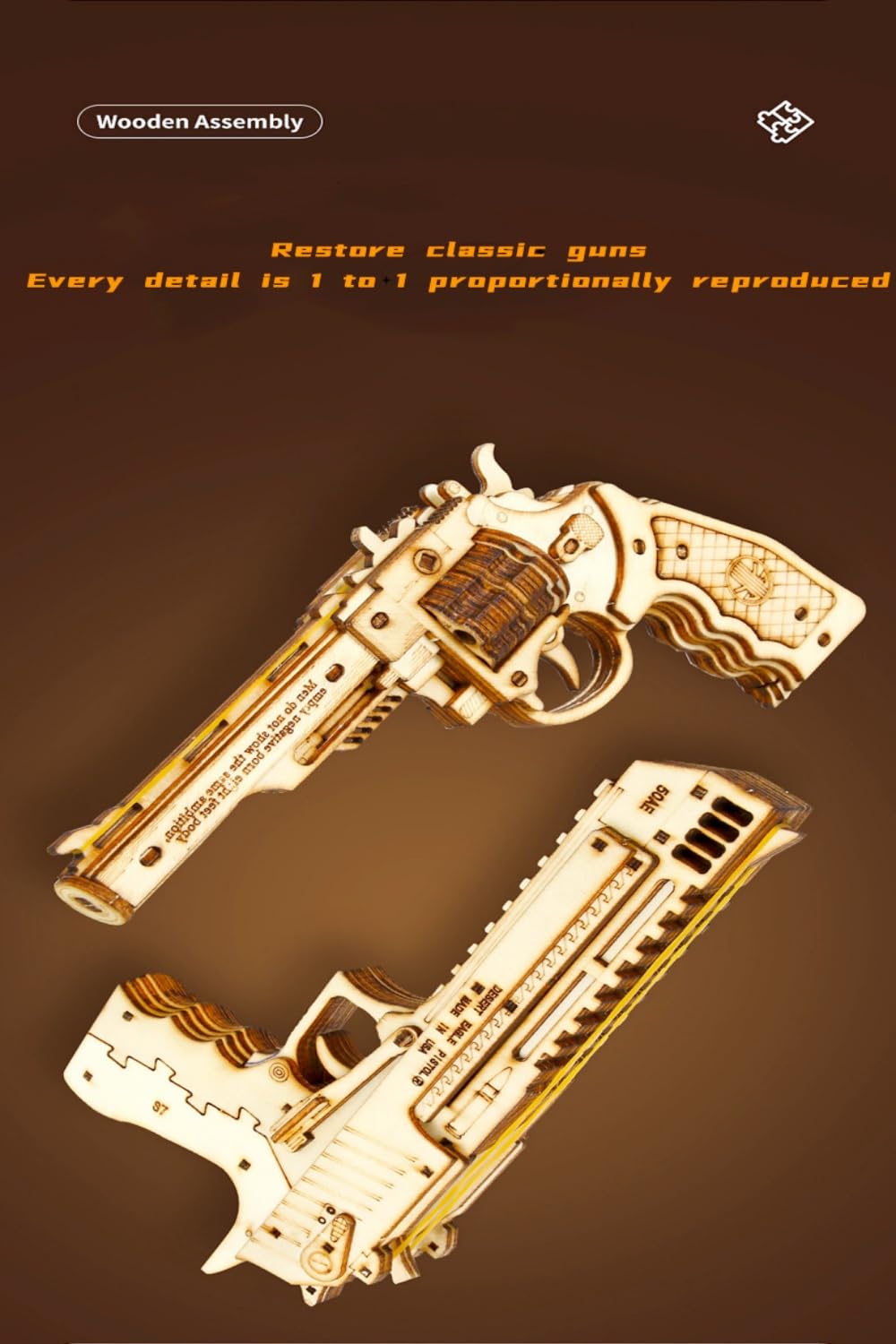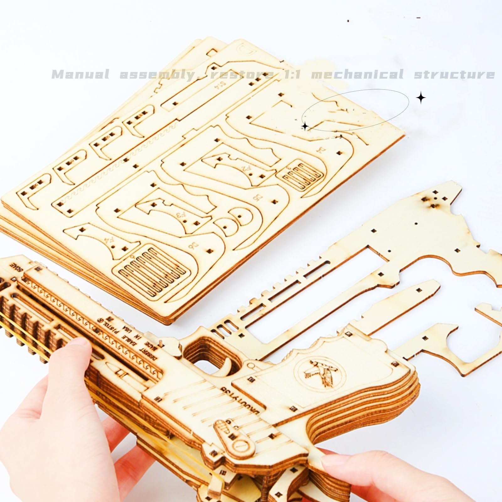 2. Obras maestras mecánicas a escala 1:1: Estas pistolas de gomas de madera 3D están hechas a escala 1:1, replicando complejas estructuras mecánicas de la vida real. El uso de madera de abedul de alta calidad, tecnología de corte CNC de precisión y un mecanismo de liberación realista garantizan durabilidad y estética refinada, así como munición de gomas inofensiva.