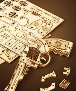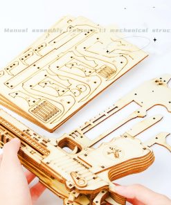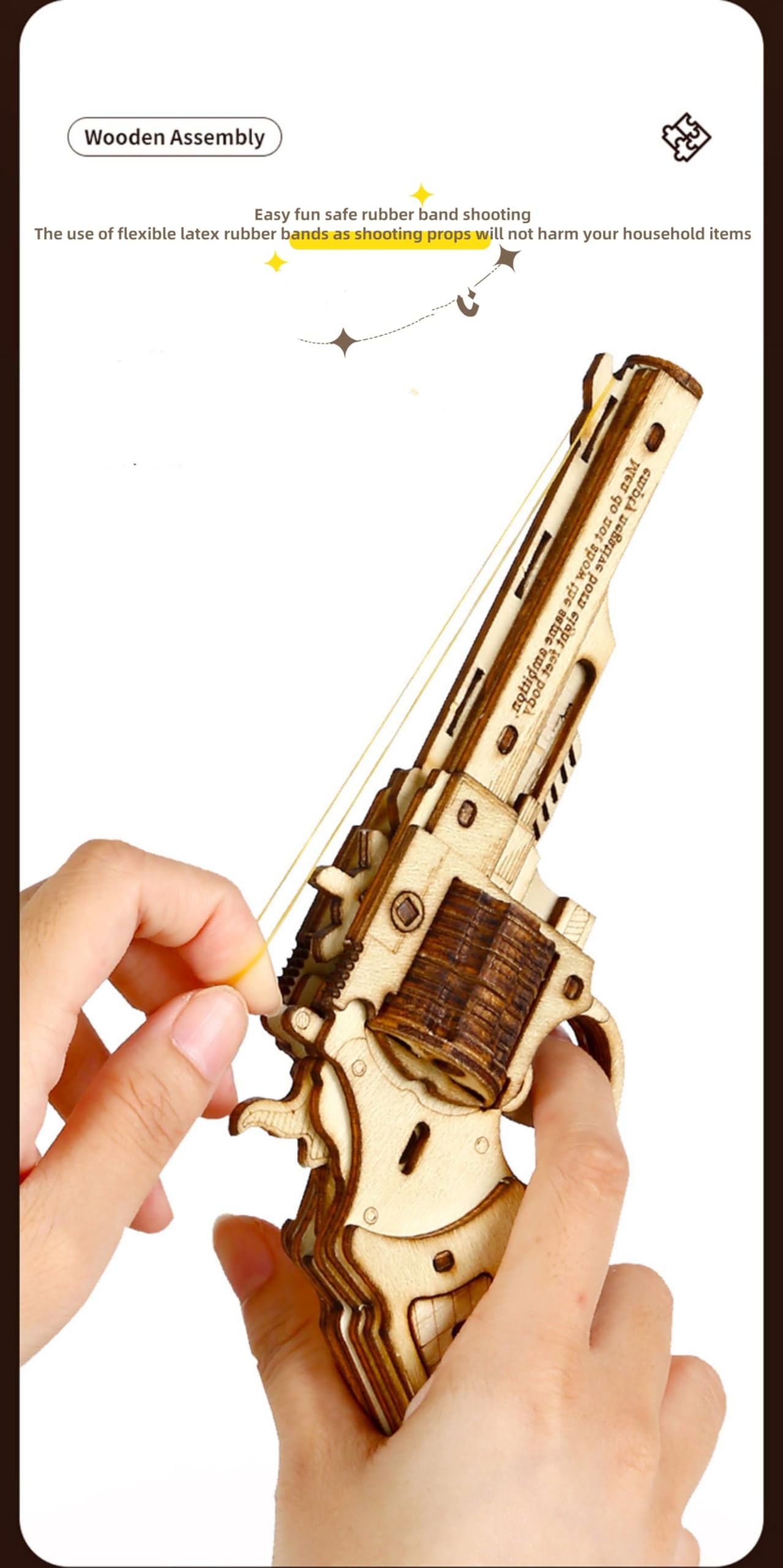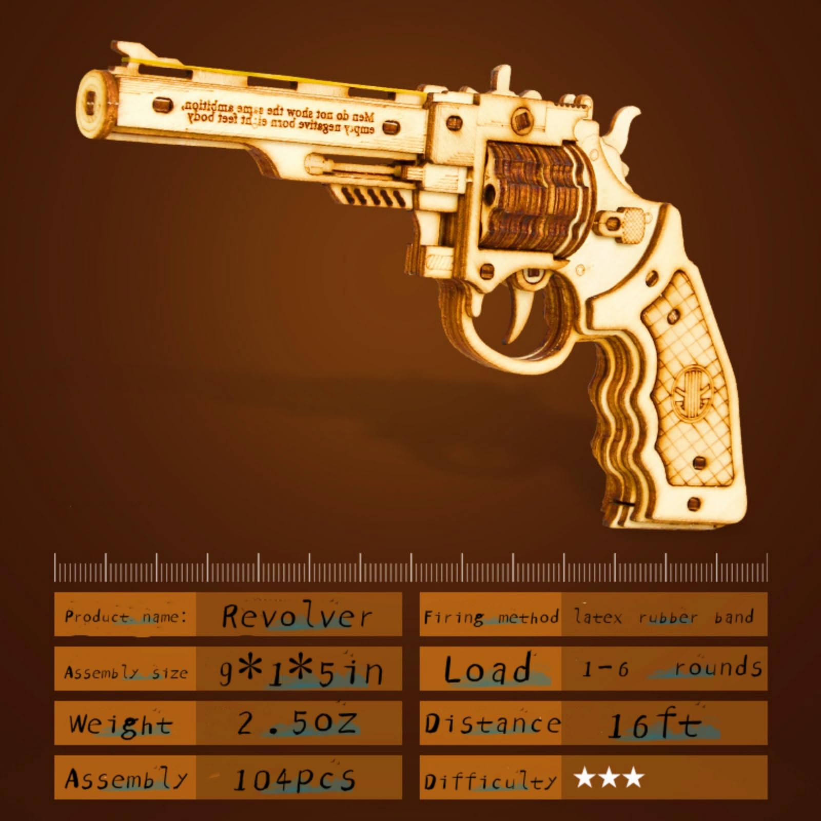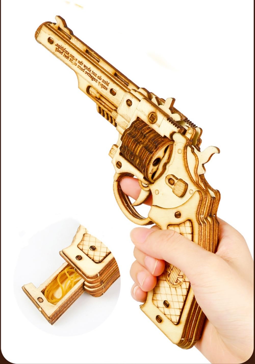 2. Obras maestras mecánicas a escala 1:1: Estas pistolas de gomas de madera 3D están hechas a escala 1:1, replicando complejas estructuras mecánicas de la vida real. El uso de madera de abedul de alta calidad, tecnología de corte CNC de precisión y un mecanismo de liberación realista garantizan durabilidad y estética refinada, así como munición de gomas inofensiva.