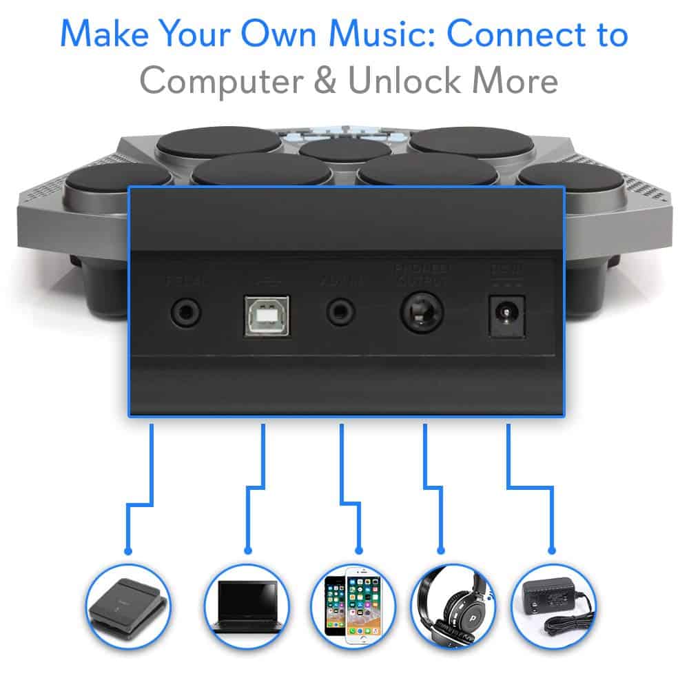 El Kit de Batería Electrónica Pyle es un todo en uno maravilloso. Disfruta de sonido personalizable y portabilidad compacta con esta versátil máquina de percusión. Está cargada con cientos de sonidos, canciones y kits de batería incorporados: cada una de las siete almohadillas de batería sensibles al tacto es capaz de producir una amplia gama de audio realista de batería. También tendrás la capacidad de hacer tu propia música. Conéctate al ordenador, graba, guarda y edita tus grabaciones de batería. Altavoces integrados para reproducir tu audio o sumérgete en ritmos percutivos conectando tus propios auriculares. El sistema también incluye dos pedales digitales para que puedas tener la sensación real de un pedal de bombo y hi-hat. Las características adicionales incluyen el Modo de Entrenamiento de Batería perfecto para principiantes, Modo de Percusión Manual, metrónomo incorporado, centro de control de botones de visualización LED digital, junto con ajustes de configuración de sonido para el tempo, el ritmo, el compás y los ajustes de ecualización. El sistema también es opcionalmente alimentado, requiriendo (6) x baterías C, lo que lo hace conveniente para sesiones de batería inalámbricas y portátiles. ¡Toca, o crea tu propia canción, con la Máquina de Batería Digital de Mesa Pyle PTED06!