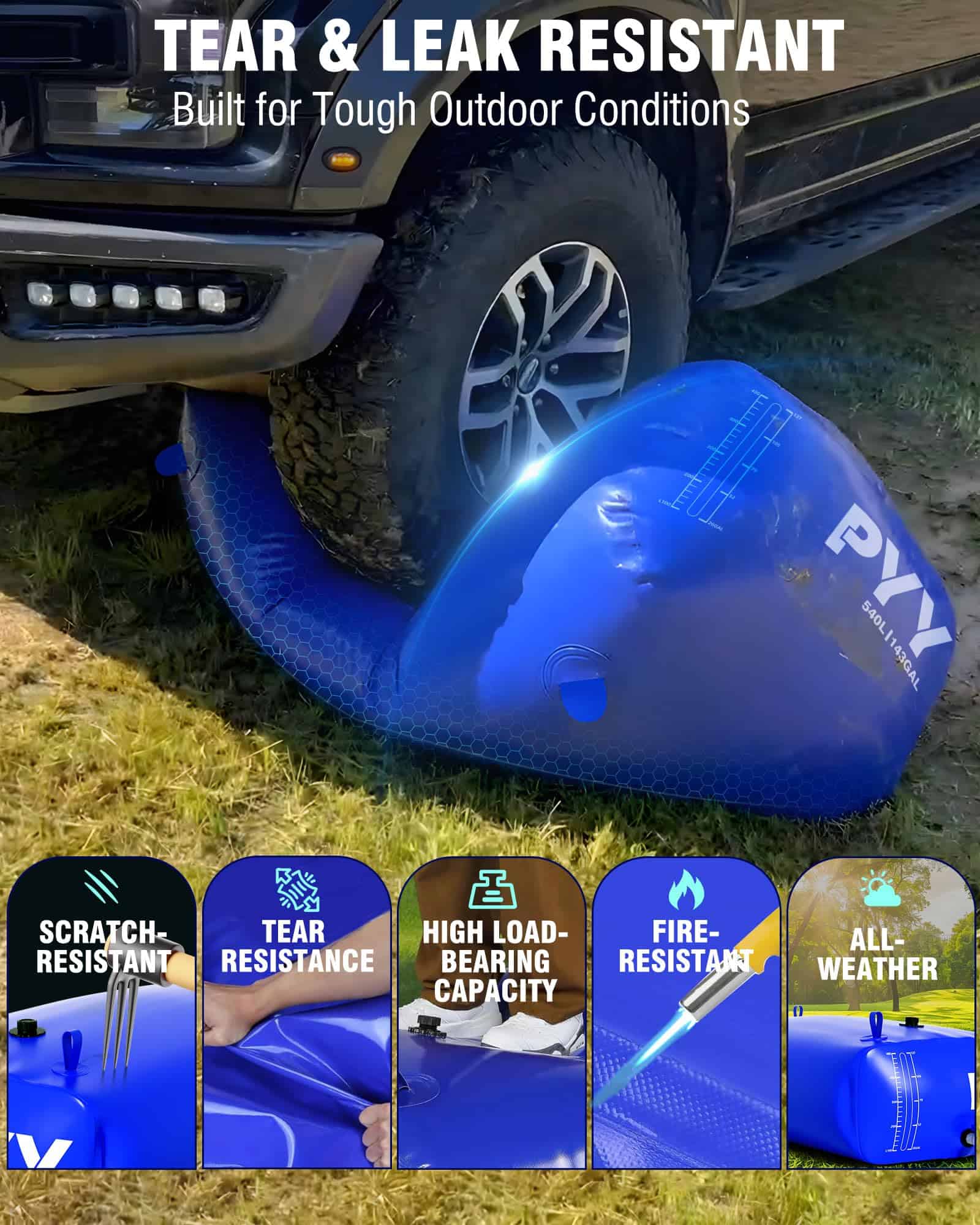 1. Resistencia tecnológica: Esta bolsa de agua está construida con material de malla resistente de PVC recubierto de doble cara de 1/20 de pulgada de grosor y alta densidad 1000D, garantizando resistencia a las fugas, resistencia a los desgarros, resistencia al envejecimiento, resistencia a los rayos UV, resistencia a la corrosión y resistencia a la abrasión. Con una capacidad de 143 galones, cubre diversas necesidades de agua no potable en diferentes escenarios, convirtiéndola en una opción confiable para el suministro de emergencia de agua en el hogar, riego de jardines, etc.