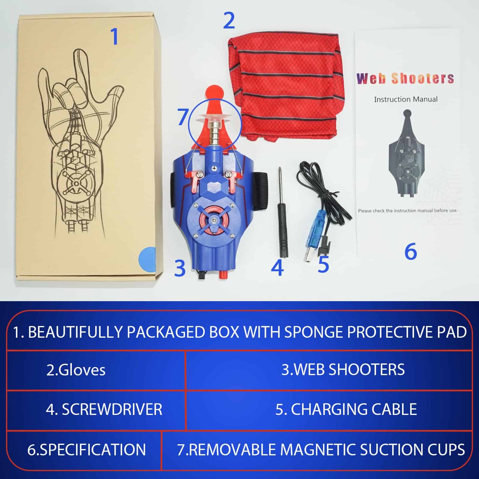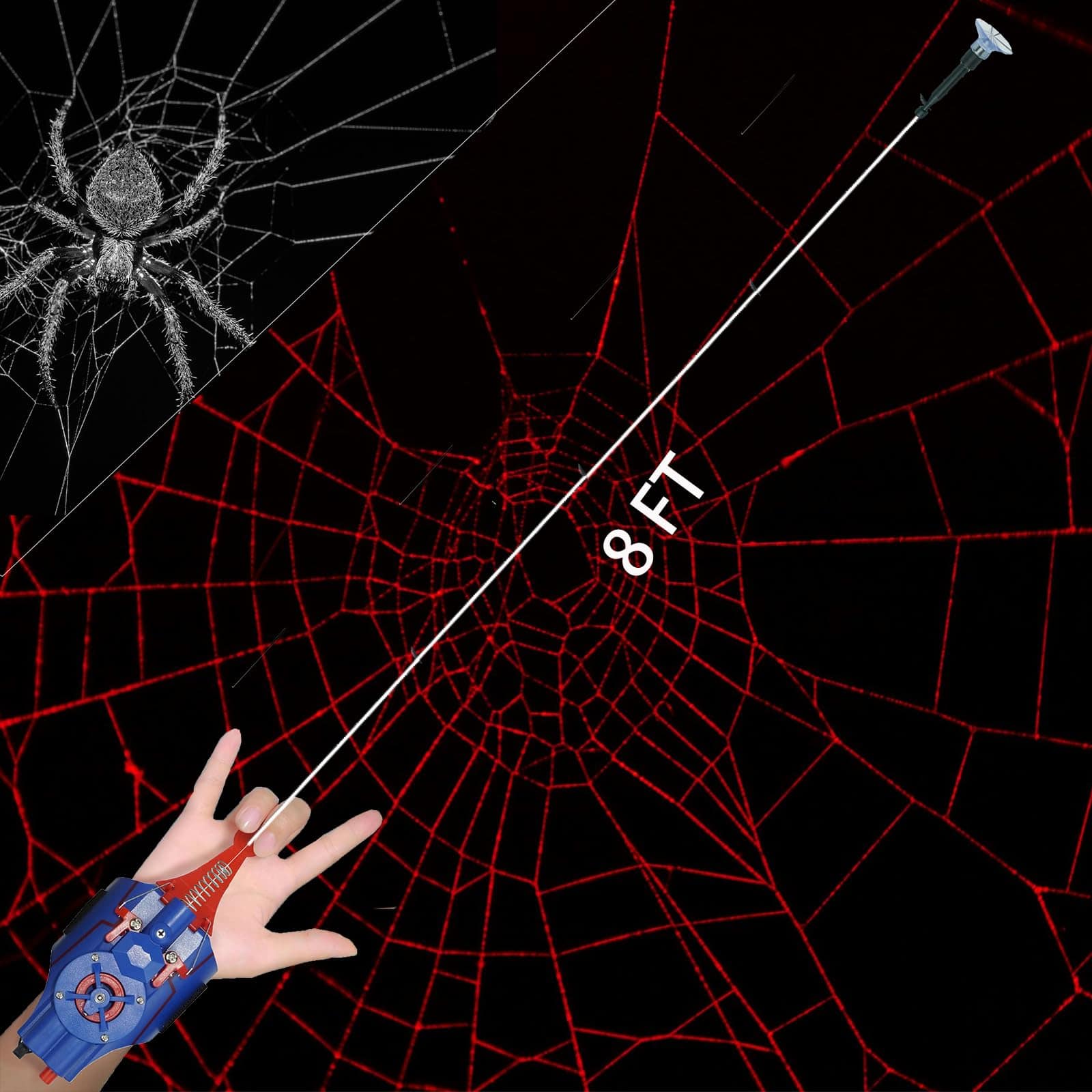 4. ¡JUEGO MÚLTIPLE! Hemos preparado un set adicional de ventosas e imanes para tu lanzador de telarañas. la cabeza magnética con un imán se puede pegar a productos de hierro después del lanzamiento, y la succión es super fuerte, por lo que no hay que preocuparse por perderlo. Usando ventosas en lugar de imanes, la cabeza se puede pegar a superficies lisas (como baldosas o vidrio).
