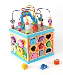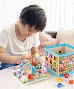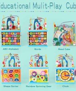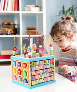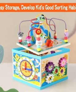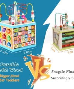1. Cubo de Actividades de Madera 5 en 1: Este cubo de actividades de madera para niños pequeños de 1-3 años tiene cinco lados diferentes de juegos, incluyendo engranaje giratorio arcoíris, Abecedario-123 Abacus, Laberinto de Cuentas, Clasificador de Formas y reloj. Desde bebés hasta niños pequeños, ¡tu bebé nunca se cansará de este juguete de cubo de actividades! ¡Ahorra dinero y reduce el desorden!.