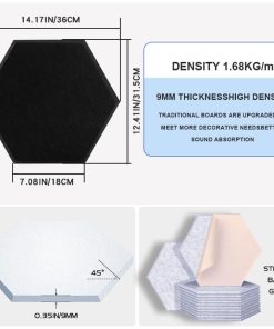Transforma tu espacio en un área acústicamente mejorada con los 12 Pack de Paneles Acústicos Hexagonales de QINGFANGLI. Estos paneles de espuma insonorizante autoadhesivos están diseñados para proporcionar una absorción de sonido efectiva, haciéndolos ideales para su uso en estudios de grabación, oficinas, teatros en casa y más. El método de pelar y pegar fácil de instalar garantiza un proceso de instalación sin complicaciones, sin necesidad de herramientas adicionales. Con una forma hexagonal única y un diseño biselado, estos paneles no solo mejoran la calidad acústica, sino que también añaden un toque de elegancia a cualquier habitación. Hechos de fibra de poliéster de alta densidad con una densidad de 250 kg/metro cúbico, estos paneles tienen un coeficiente de reducción de ruido (NRC) de 1,3, absorbiendo eficazmente sonidos de alta frecuencia generados por voces humanas o dispositivos electrónicos. También pueden usarse con trampas de baja frecuencia para absorber un rango más amplio de frecuencias. Nuestros materiales insonorizantes son ecológicos y seguros al tacto y a la respiración, sin olores desagradables. Ya sea que estés buscando reducir el eco en tu estudio de grabación o crear un espacio de trabajo más tranquilo en casa, estos paneles de espuma insonorizante ofrecen la solución perfecta. Elige entre una variedad de colores para crear tus propias combinaciones DIY y disfruta de una calidad de sonido mejorada con un toque de estilo.