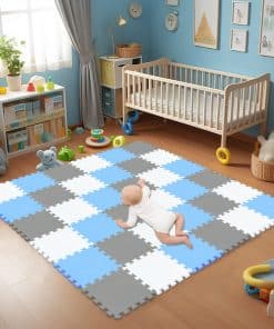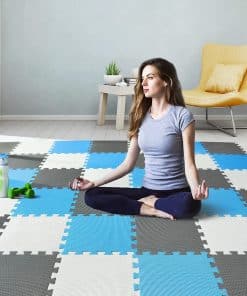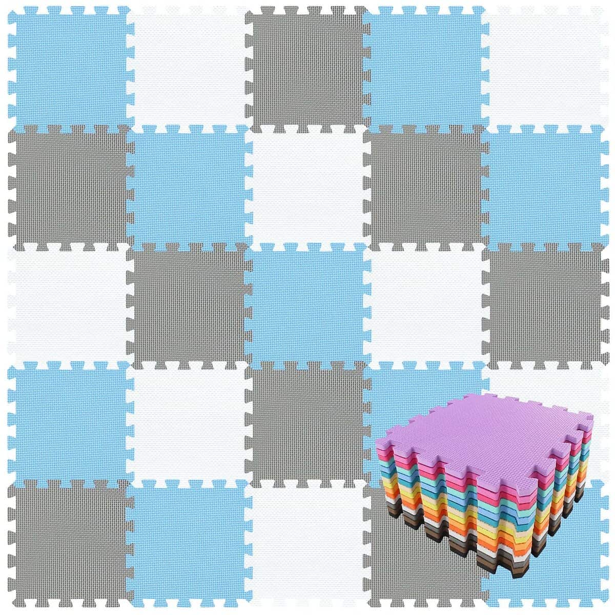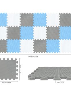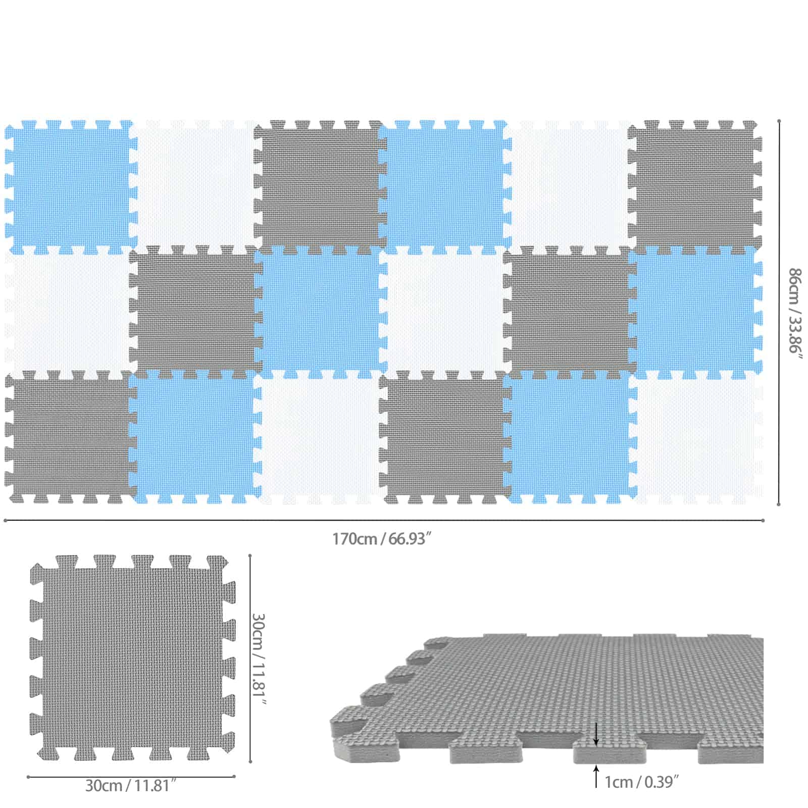 PROTECTIVE FLOOR MAT COLOR – Blanco, Azul, Gris. La alfombrilla de EVA qqpp está hecha de materiales de alta calidad para garantizar el color y el brillo del producto. SAFETY PUZZLE MAT – Hecho de espuma segura, suave y duradera. Libre de BPA, ftalatos, plomo, respetuoso con el medio ambiente y no tóxico. MULTIFUNCTIONAL INTERLOCKING MAT – Utilizado para proteger el suelo, construir un área de juego cómoda y segura para bebés, como alfombrilla protectora para yoga, ejercicio, etc. Adecuado para salas de estar, habitaciones de niños, guarderías, gimnasios, garajes, sótanos, etc. FÁCIL DE LIMPIAR Y ENSAMBLAR – Se puede limpiar fácilmente con un paño húmedo y jabón neutro, la función de ensamblaje y la portabilidad hacen que sea muy fácil de montar.