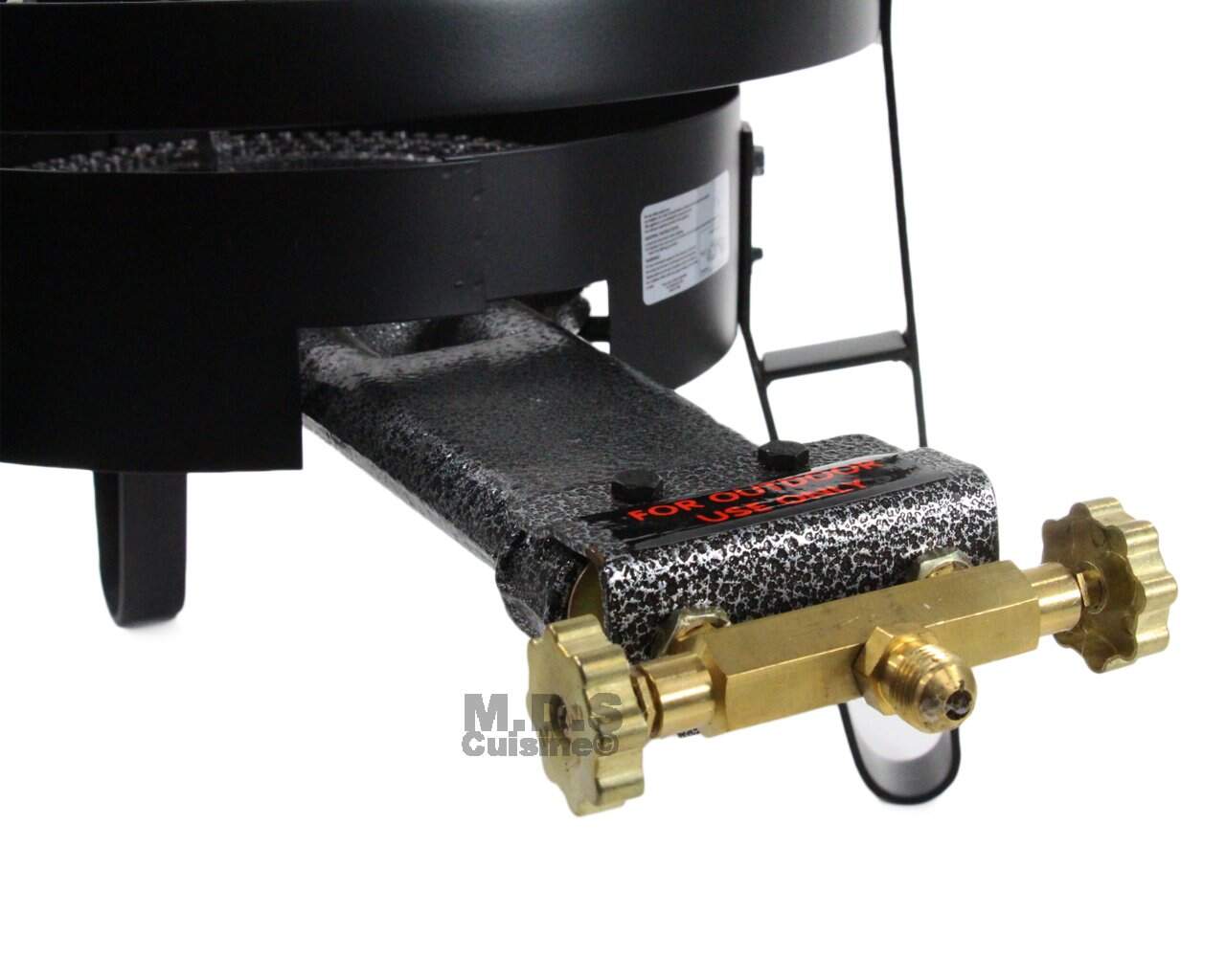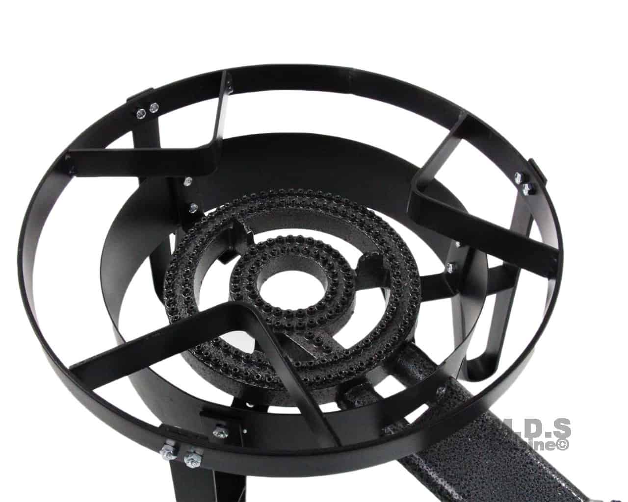 Ideal para paseos en bote, campamentos, tailgating, patio trasero o incluso cocina en casa, ningún quemador de gas portátil puede prescindir de un resistente soporte de hierro fundido. Mide aproximadamente 19″ de altura y 19-1/4″ de diámetro, esta conveniente base de estufa tiene la capacidad de acomodar quemadores de gas individuales y quemadores de alta presión. Excelente rendimiento para aplicaciones de cocción rápida cocinar en wok y mucho poder de sobra. Doble válvulas de latón para control de quemador interior y exterior separado. Ajustadores de proporción de oxígeno separados para evitar que tus ollas se oxiden. Salida de llama ajustable individualmente de muy baja a alta. Manguera de alta presión de calidad global fácil de conectar y regulador que se conecta fácilmente a cualquier tanque de propano. Quemador de gas propano muy fácil. Hierro fundido con acabado en polvo. Se puede colocar en el suelo, en una mesa o con soportes para quemador. Dimensiones: 16.5″ de diámetro x 12.5″ de alto y 9″ de diámetro quemador