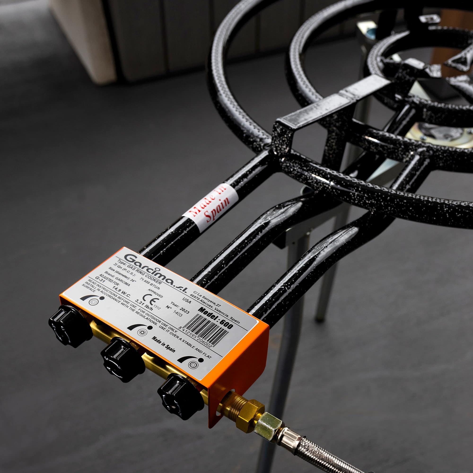 El quemador de gas propano para paella al aire libre modelo 600 ofrece una tremenda flexibilidad porque tiene tres perillas. Los diámetros de los anillos son: 8 , 16 , y 24 . Utilice el anillo interior para sartenes de hasta 14 pulgadas. Agregue el segundo anillo para sartenes de hasta 24 pulgadas. El anillo exterior se adapta a sartenes de hasta 32 pulgadas. Cada anillo es controlado por su propia perilla, para que pueda ajustar el calor donde y cuando sea necesario, e incluso apagar un anillo y mantener el otro encendido.