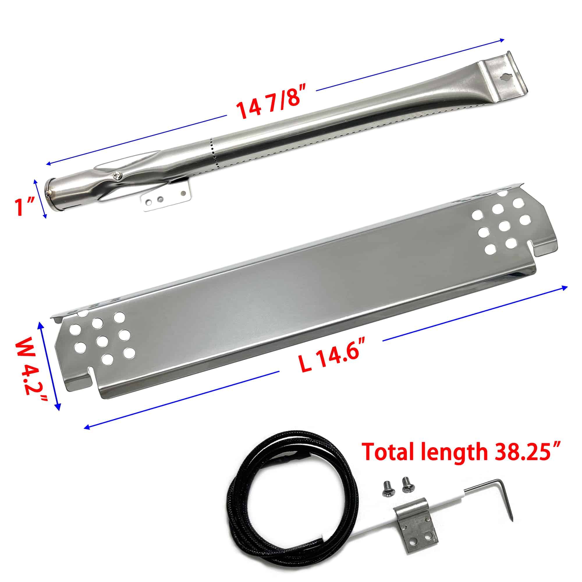 Quemador de parrilla Direct Store Parts DG262 de 14 7/8″, placas de calor de 14.6″ x 4.2″, kit de encendido compatible con Nexgrill 720-0830H, 720-0888N/S, 720-0783E, 720-0830X, para Nexgrill 4 quemadores 720-0830H de Home Depot. Kit de reparación Direct Store Parts incluye quemador de parrilla de acero inoxidable x 4 piezas, placas de calor de acero inoxidable x 4 piezas, encendedores x 4 piezas. Quemador: 14 7/8″ x 1″, Material: Acero inoxidable resistente. Placa de calor: L 14.6″ x A 4.2″ x H 1.5, Material: Acero inoxidable resistente, Antiadherente. Encendedor: Longitud total 38.25″. Repuesto para Home Depot Nexgrill 720-0830H, 720-0830D, 720-0783E, 720-0830A, 720-0864, 720-0864M, 720-0882S, 720-0888, 720-0888A, 720-0888N, 720-0894F, 720-0896CA, 720-0958A, 720-0864R, 720-0925S, 720-0898 730-0898, para parrilla Members Mark 720-0882D, 720-0830F, 720-0830G, para parrilla Backyard Grill 720-0888M, para parrilla BBQ Pro Grill 122.47207610, 122.57901710, 720-0894R, para parrilla BHG 720-0783W 720-0783H. Nota: Por favor confirme el número en el conjunto de partes y la cantidad que necesita antes de ordenar.