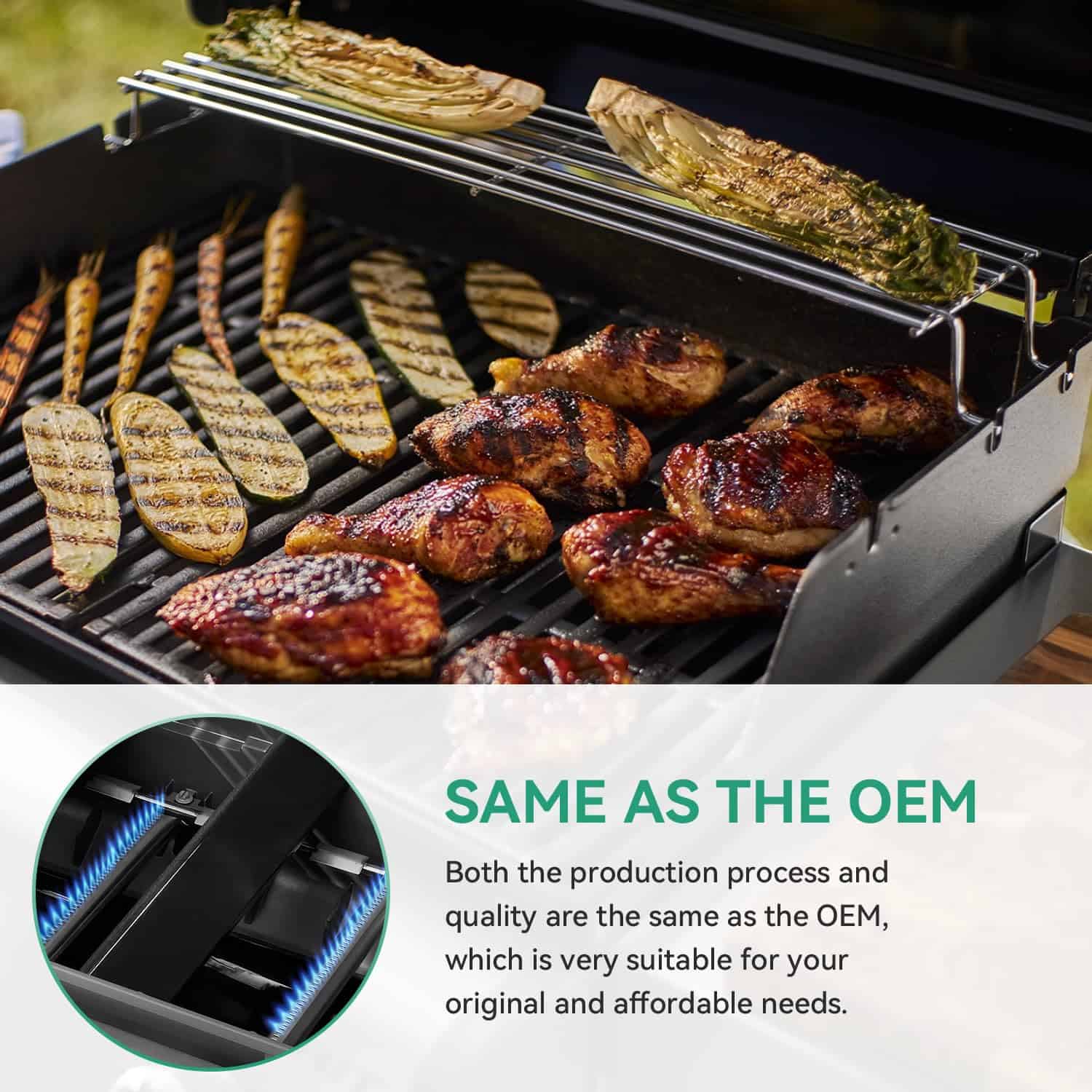5. Disfruta de la Parrilla con Nuestras Piezas Los quemadores están diseñados para llevar un flujo de gas constante a lo largo de la parrilla, para que puedas cocinar los alimentos de manera uniforme en toda la parrilla de cocción; la Tienda de Protección de Calor de la Parrilla puede disipar el calor de manera uniforme, lo que significa que tu comida puede calentarse de manera uniforme, dándole un delicioso sabor a la barbacoa a los alimentos.