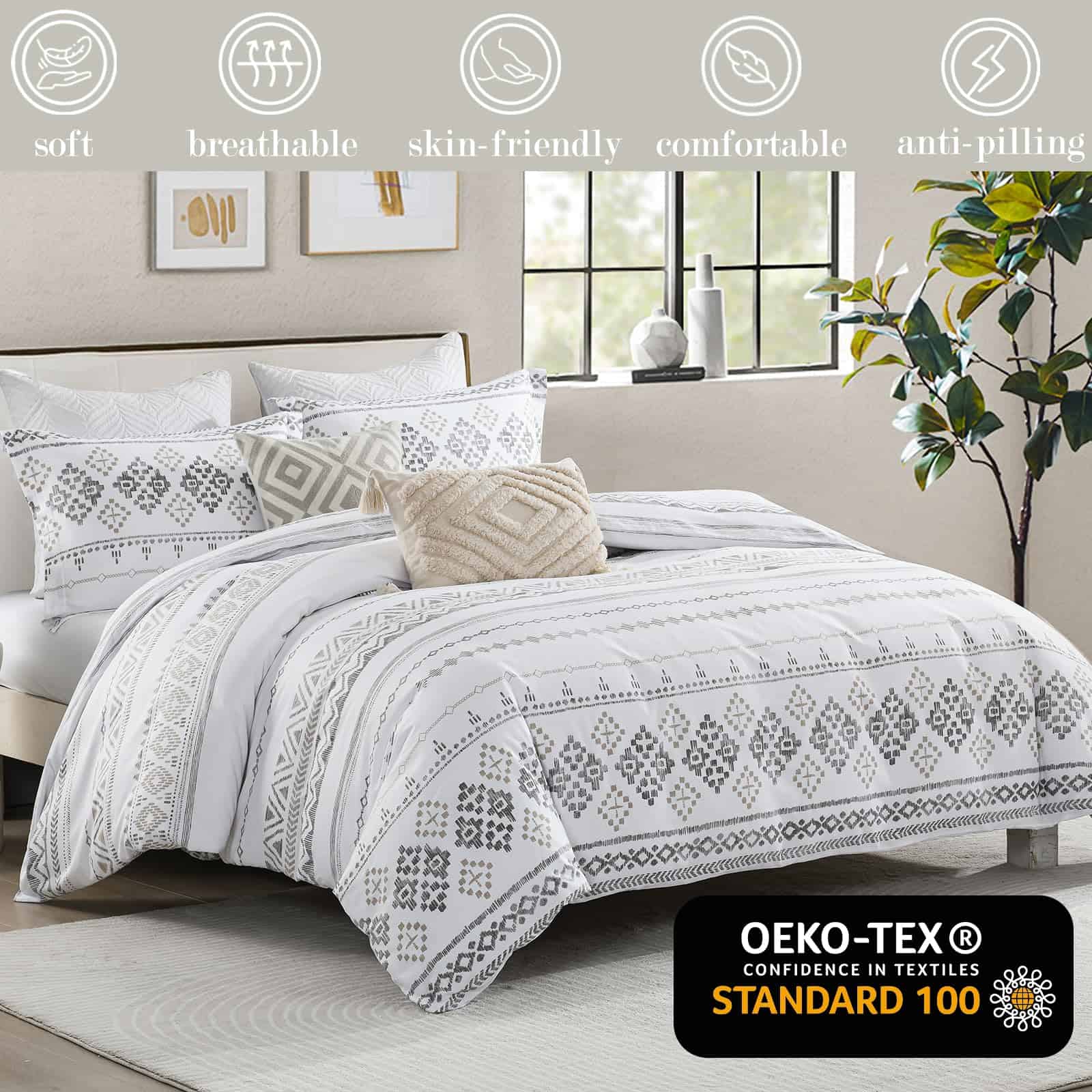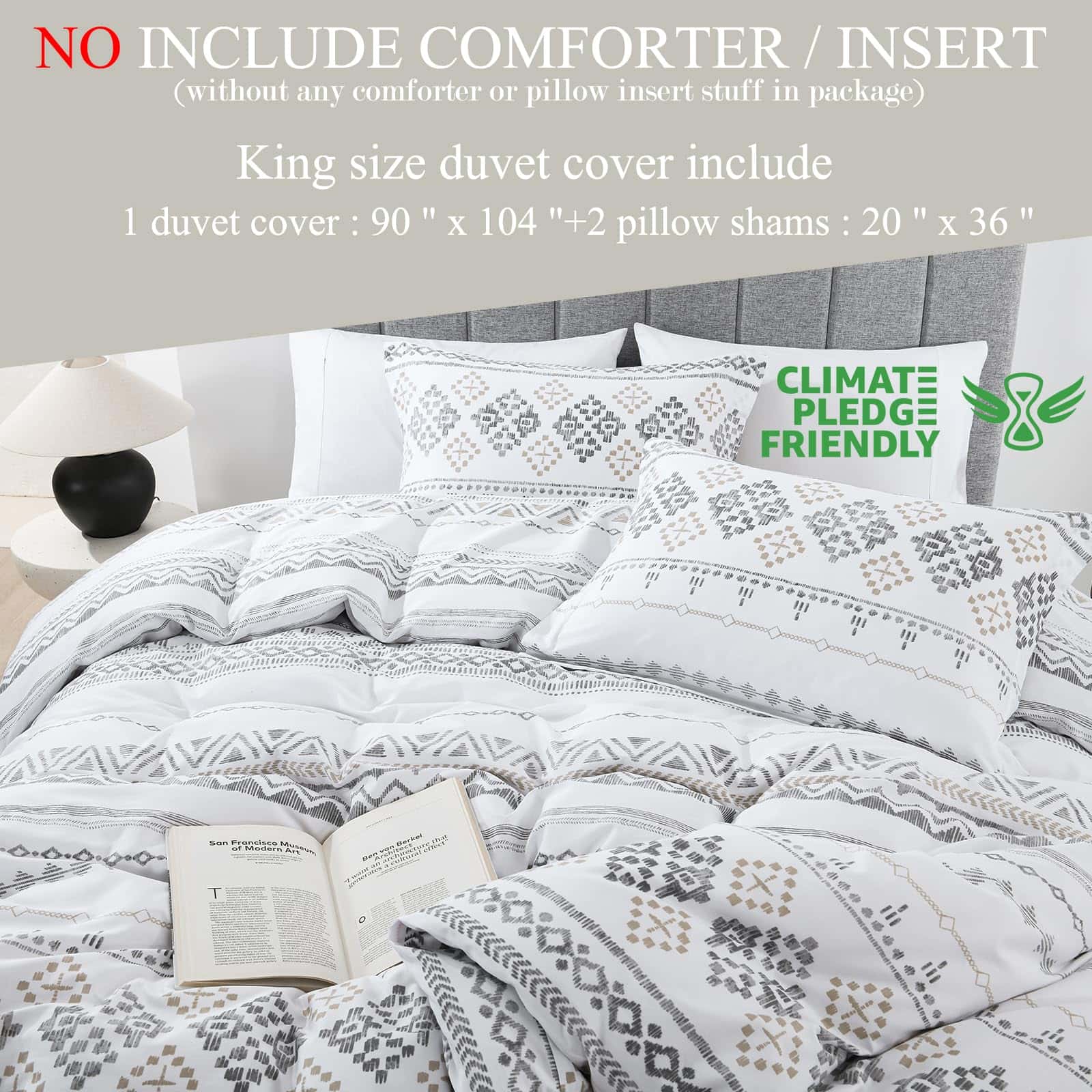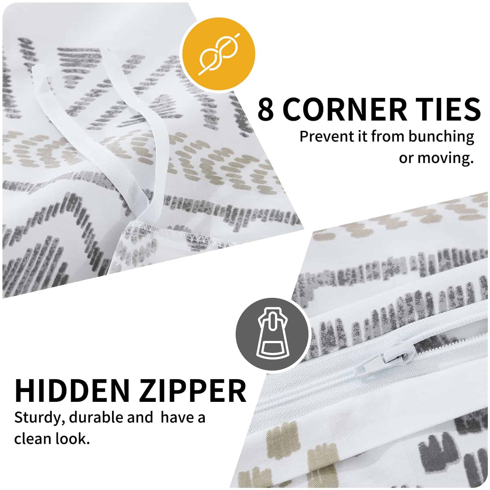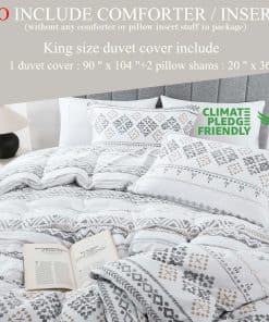 1. JUEGO DE FUNDA DE EDREDÓN DE ALGODÓN 100% La funda de edredón king size de Quilta está hecha de algodón puro de alta densidad de 400TC, es amigable con la piel, cómoda y transpirable, suave, no se apelmasa, sin arrugas, fácil de lavar en lavadora y nunca se desvanece. El alto nivel de suavidad y confort te permite dormir tranquilamente y cómodamente toda la noche. El set de funda de edredón king con temperatura adecuada es adecuado para todas las estaciones. 2. CIERRE CON CREMALLERA Y 8 LAZOS DE ESQUINA En comparación con los botones tradicionales, la cremallera lateral invisible de metal es más rígida, por lo que puedes insertar y quitar el edredón con más facilidad. Los ocho lazos de esquina con material natural pueden mantener el edredón fijo en la funda y en su lugar, el lazo no se caerá y se puede utilizar de forma segura. Nuestro juego de funda de edredón king size puede proteger eficazmente tu edredón y almohada de arañazos y rasgaduras. 3. FUNDA DE EDREDÓN BOHO El patrón de nuestra funda de edredón king presenta un patrón bohemio de varias formas de diamante y líneas. El alto nivel de tecnología de teñido permite que el patrón de color se fije permanentemente, permanezca brillante y nunca se desvanezca. El estilo bohemio simple pero magnífico es un arte de moda, que le da a tu habitación una sensación de lujo. Cuando abres la habitación después de un día ajetreado, sentirás una sensación de felicidad. 4. ESTÁNDAR 100 de OEKO-TEX Tenemos la certificación OEKO-TEX Standard 100. El proceso de producción de la funda de edredón king size cumple con los estándares internacionales. Nos aseguramos que la calidad del set de funda de edredón es de primera calidad y los consumidores pueden utilizarlo con seguridad. 5. INSTRUCCIONES DE CUIDADO Para mantener tu set de funda de edredón de algodón boho luciendo lo mejor posible, lávalo a máquina por separado en agua fría y sécalo a baja temperatura. No uses blanqueador, ya que puede dañar la tela. 6. ¿QUÉ RECIBIRÁS? 1 funda de edredón king size: 90″ x 104″ + 2 fundas de almohada: 20″ x 36″ (Sin edredón). El set de funda de edredón king no es un set de edredón, sin ningún relleno de edredón o almohada en el paquete. El set de funda de edredón de Quilta con un embalaje exquisito también es un excelente regalo para bodas, cumpleaños, Navidad, vacaciones y más.