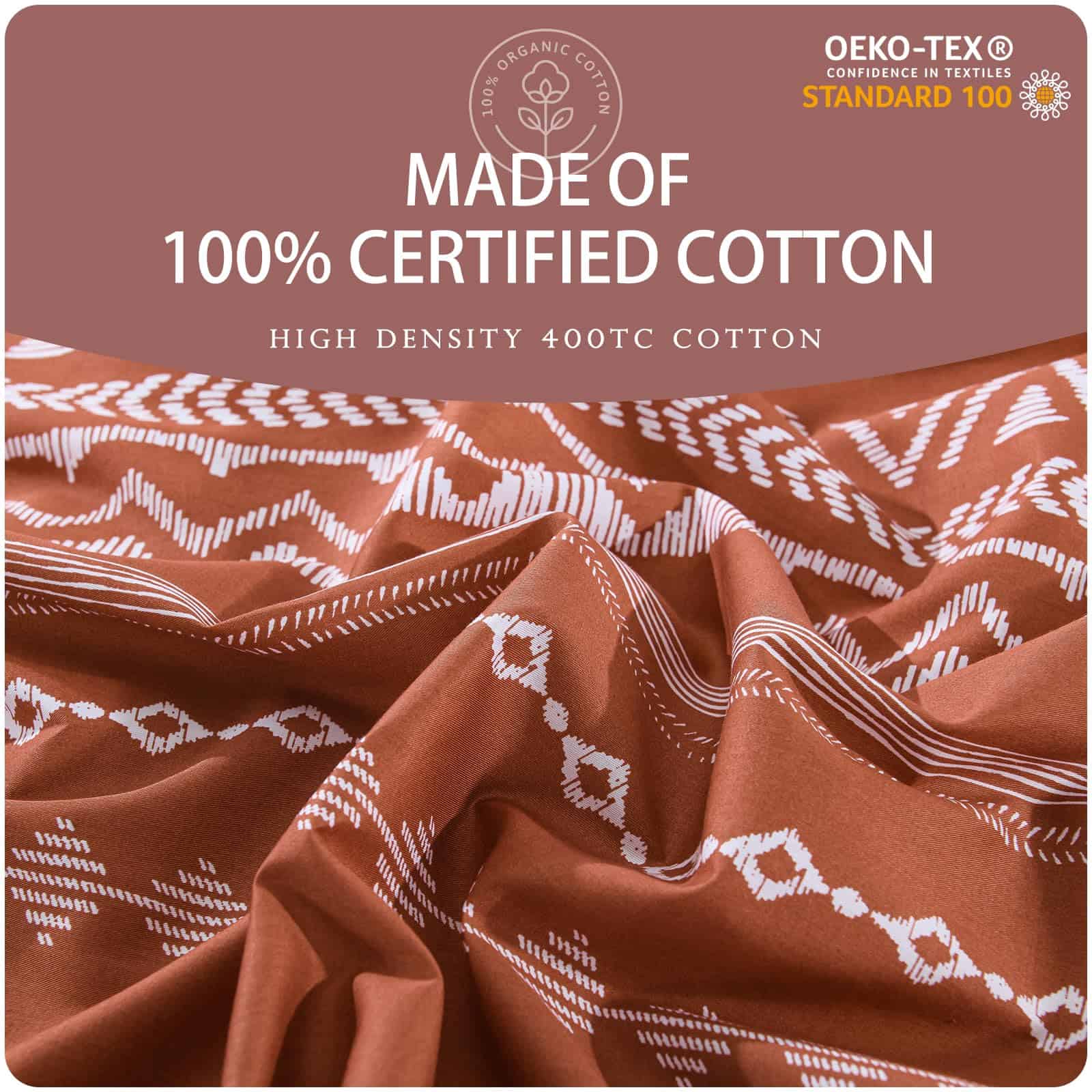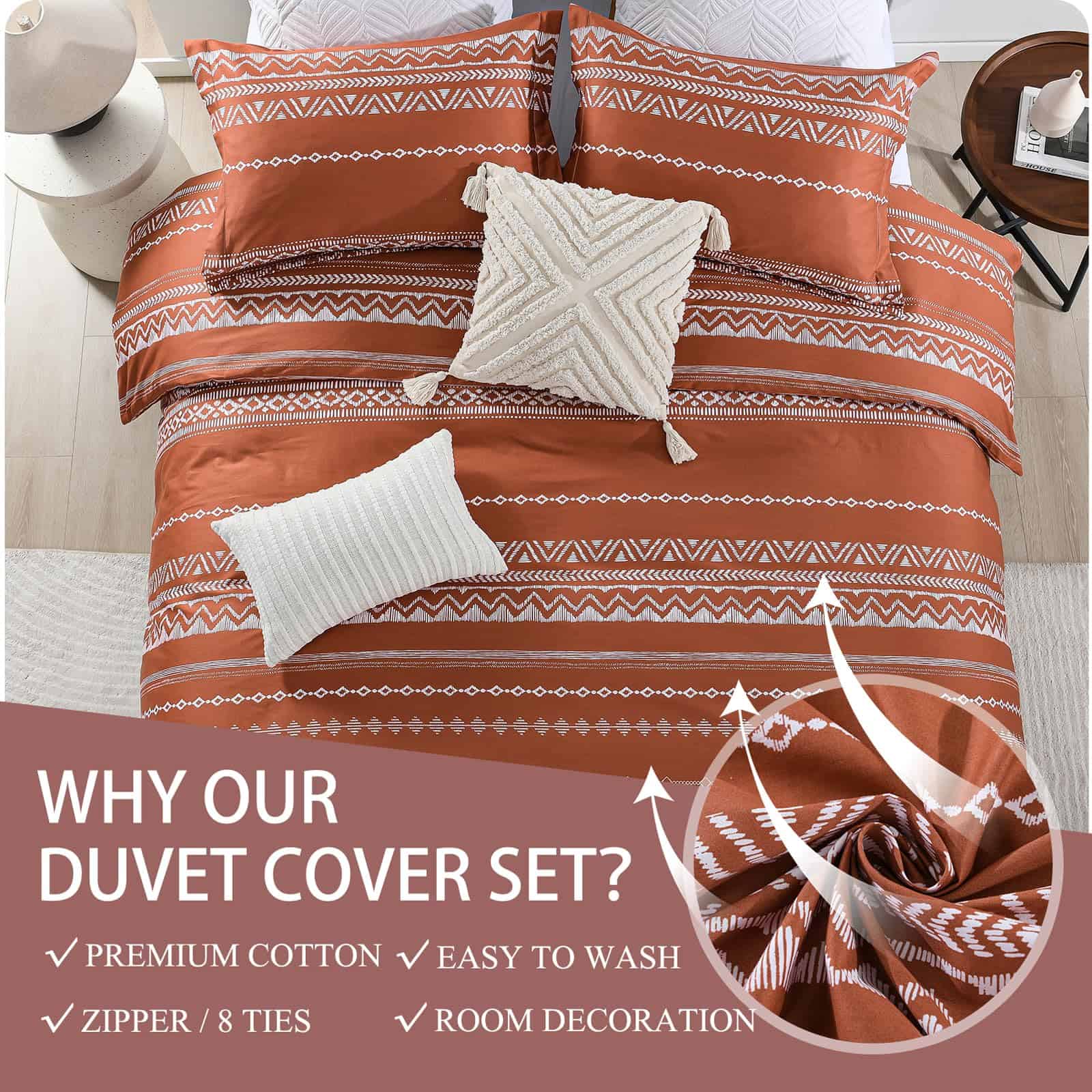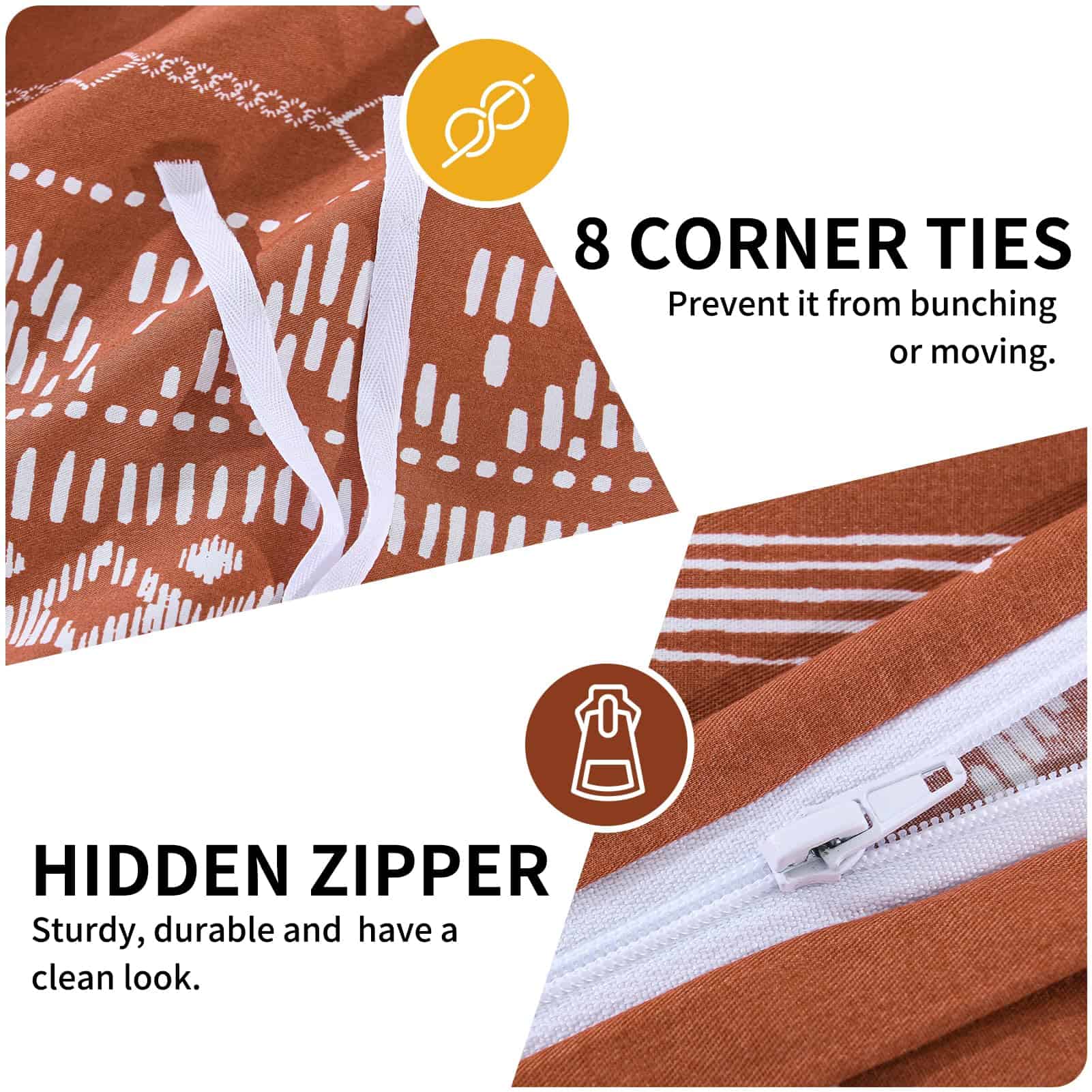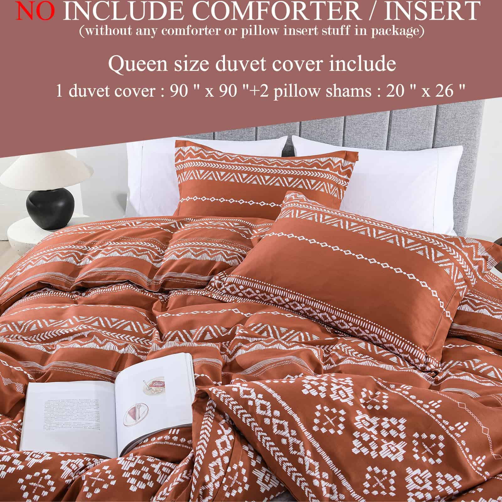 1. 100% ALGODÓN: La funda de edredón Quilta tamaño queen está hecha de 100% algodón puro de alta densidad 400TC, es amigable con la piel, cómoda y transpirable, suave, nunca se agrupa, sin arrugas, lavado conveniente, lavable a máquina y nunca se desvanece. El alto nivel de suavidad y comodidad te permite dormir pacíficamente y cómodamente toda la noche. El set de funda de edredón queen con temperatura adecuada es adecuado para todas las estaciones. 2. CIERRE DE CREMALLERA Y 8 LAZOS DE ESQUINA: En comparación con los botones tradicionales, la cremallera lateral invisible de metal es más rígida, por lo que puedes insertar y quitar el edredón más fácilmente. Los ocho lazos de esquina con material natural pueden mantener el edredón fijo en la funda y en su lugar el lazo no se caerá y se puede usar de forma segura. Nuestro juego de funda de edredón tamaño queen puede proteger efectivamente tu edredón y almohada de arañazos y roturas. 3. FUNDA DE EDREDÓN BOHO: El patrón de nuestra funda de edredón queen presenta un patrón bohemio de diversas formas de diamante y líneas. El alto nivel de tecnología de teñido permite que el patrón de color se fije permanentemente, permanezca brillante y nunca se desvanezca. El estilo bohemio simple pero magnífico es un arte de moda, que le da a tu habitación una sensación de lujo. Cuando abres la habitación después de un día ajetreado, sentirás una sensación de felicidad. 4. ESTÁNDAR 100 por OEKO-TEX: Tenemos la certificación OEKO-TEX Standard 100. El proceso de producción de la funda de edredón queen cumple con las normas internacionales. Nos aseguramos de que la calidad del juego de funda de edredón sea premium y los consumidores puedan usarlo de forma segura. 5. INSTRUCCIONES DE CUIDADO: Para mantener tu juego de funda de edredón boho de algodón luciendo lo mejor posible, lávalo a máquina por separado en agua fría y sécalo a fuego lento. No uses lejía, ya que esto puede dañar la tela. 6. ¿QUÉ RECIBIRÁS? 1 funda de edredón tamaño queen: 90″ x 90″ + 2 fundas de almohada: 20″ x 26″ (Sin edredón). El juego de funda de edredón queen no es un set de edredón, sin ningún edredón o relleno de almohada incluido en el paquete. El set de funda de edredón de Quilta con un embalaje exquisito también es un gran regalo para bodas, cumpleaños, Navidad, fiestas y más.