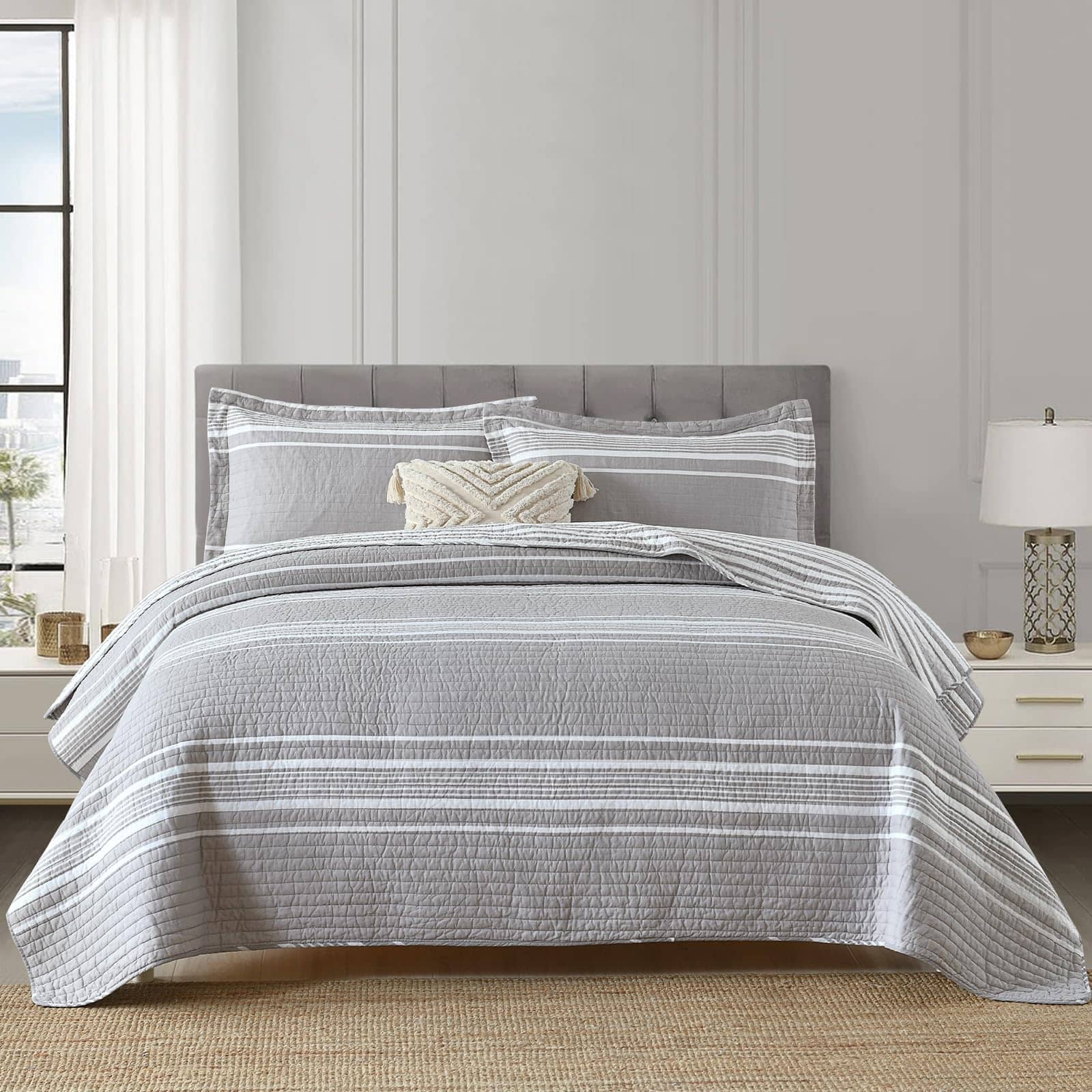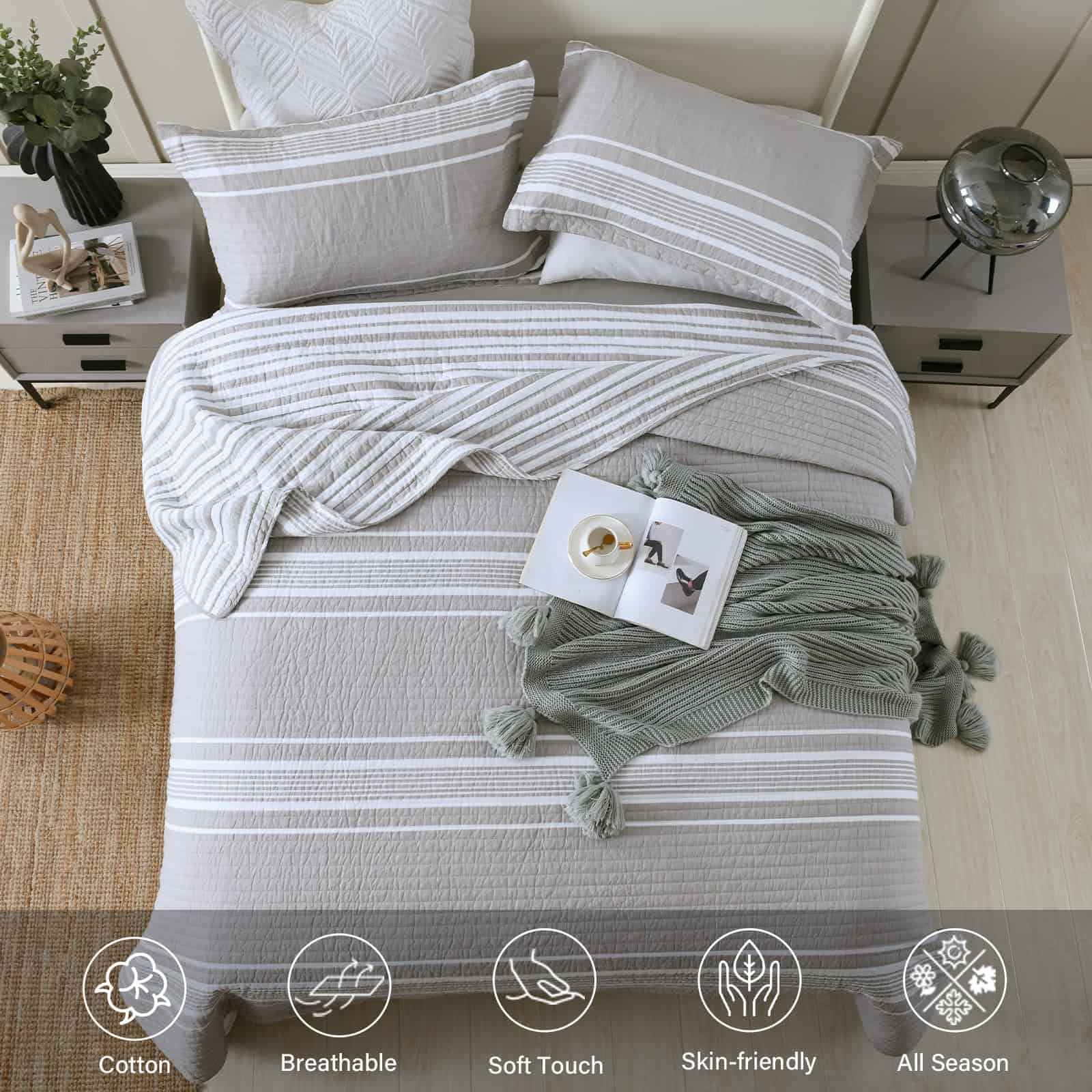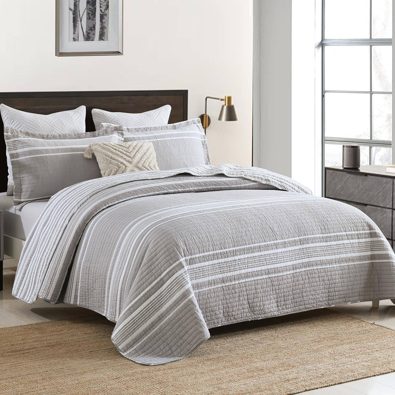 Quilta Juego de Edredón 100% Algodón Tamaño Queen – Colcha Ligera Acolchada, Gris/Blanco
