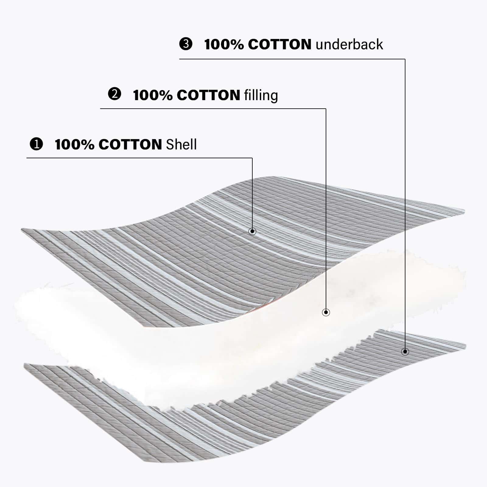 Este juego de edredón de Quilta está hecho de 100% algodón natural de alta calidad, tanto en las cubiertas como en los rellenos. Certificado por OEKO-TEX STANDARD 100, este juego de edredón garantiza tu seguridad, un toque suave satisfactorio y transpirabilidad. Puedes utilizarlo como colcha, edredón, juego de cubrecamas, funda de sofá, cubrecamas de cama, mantas y mucho más.