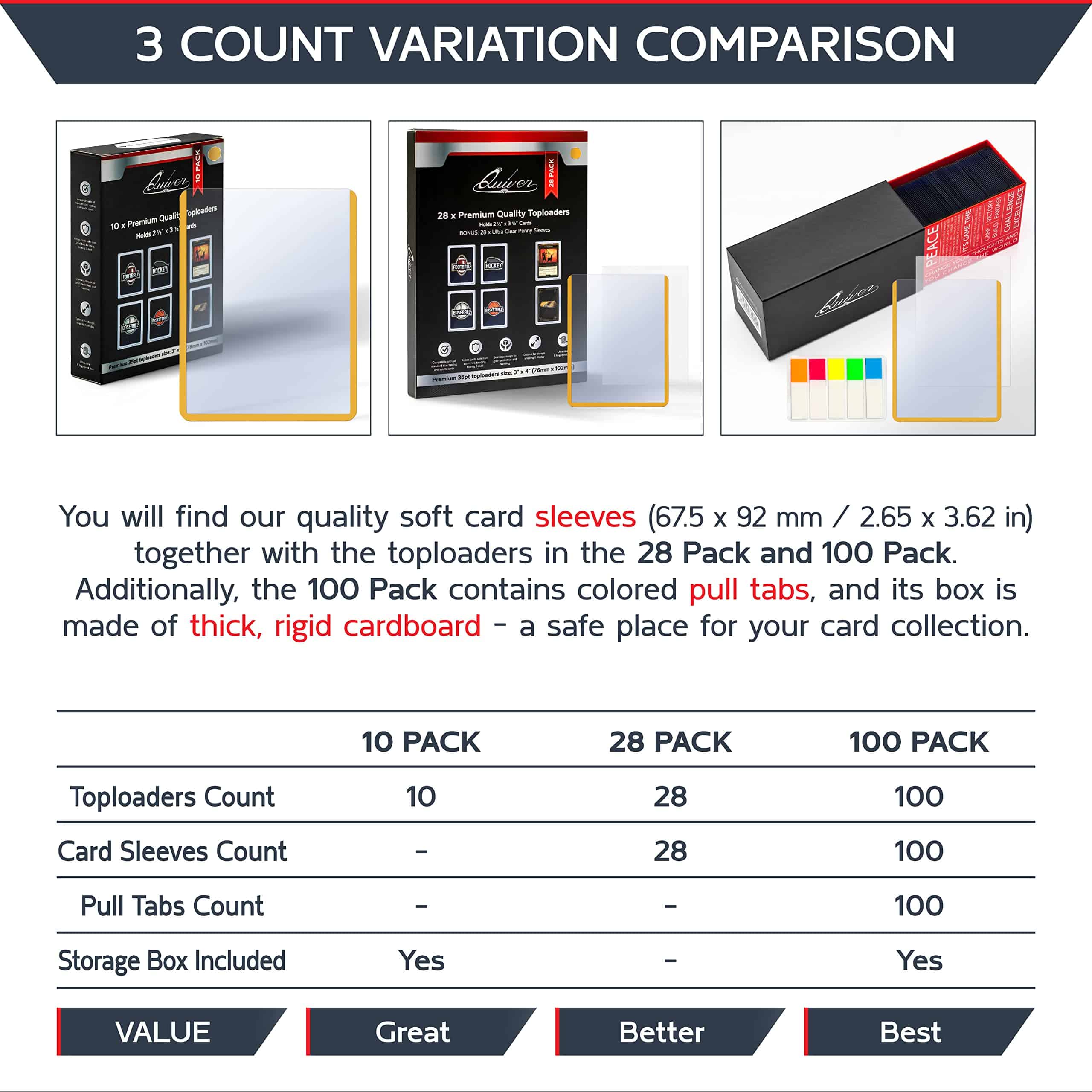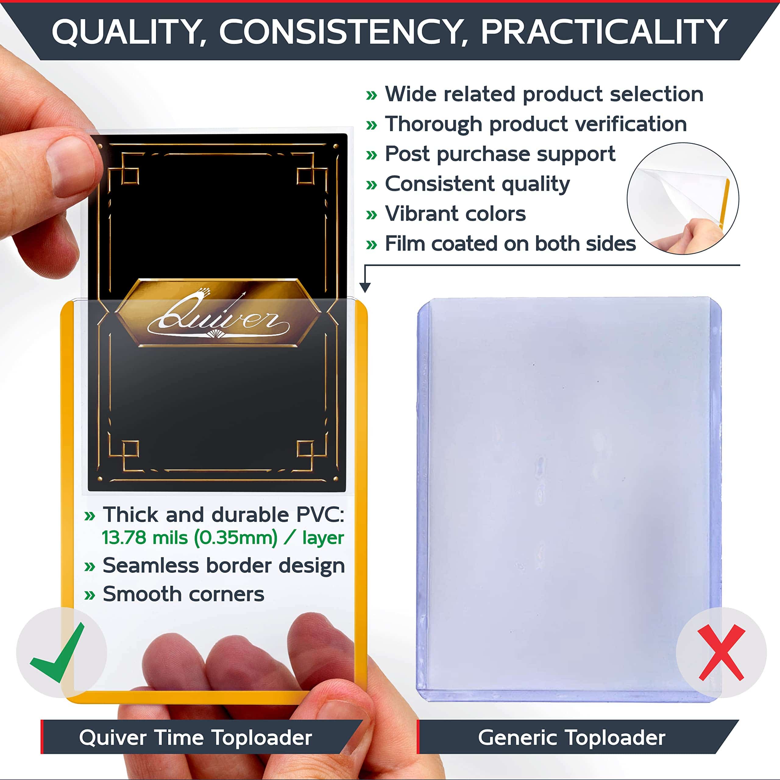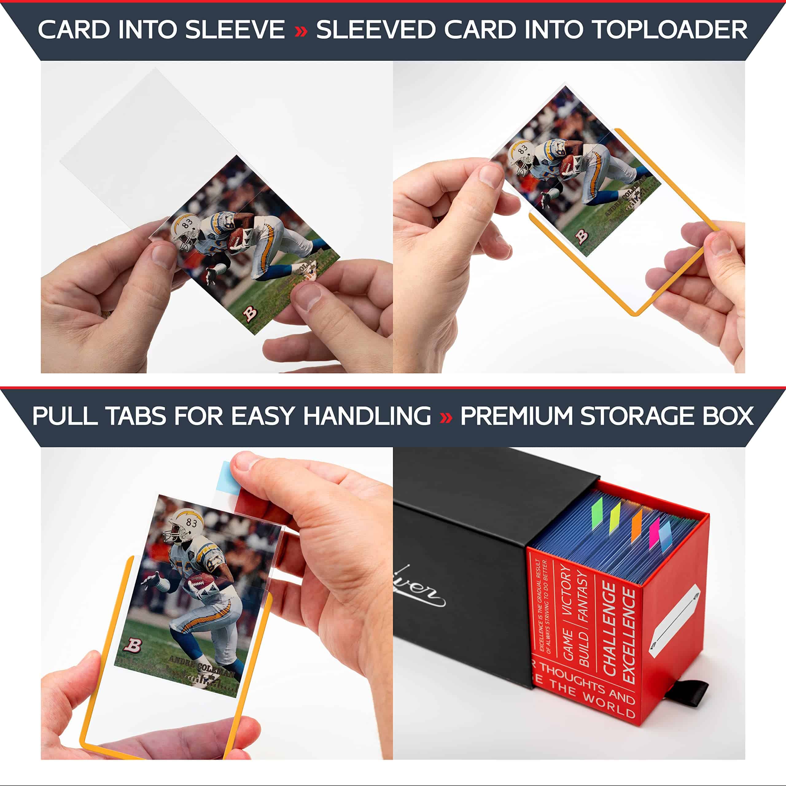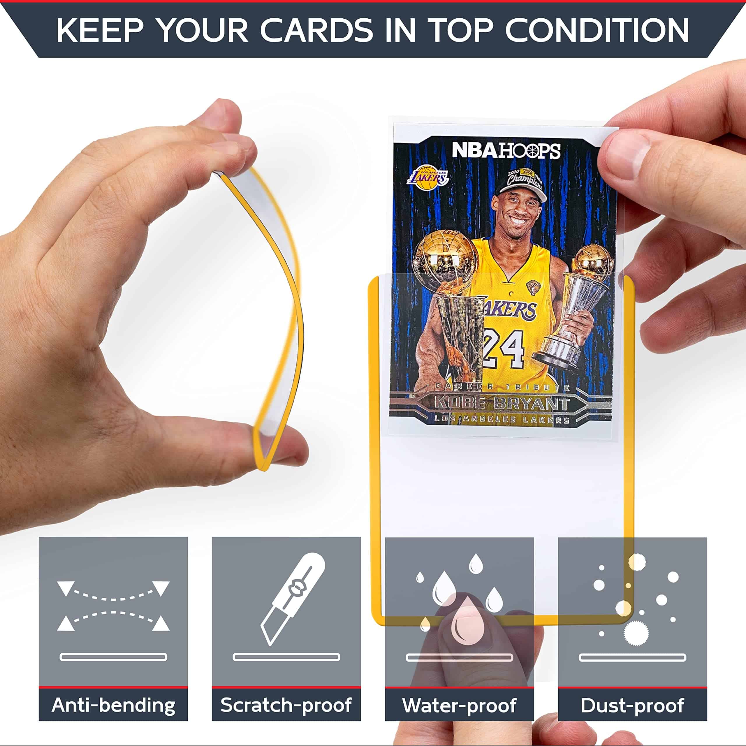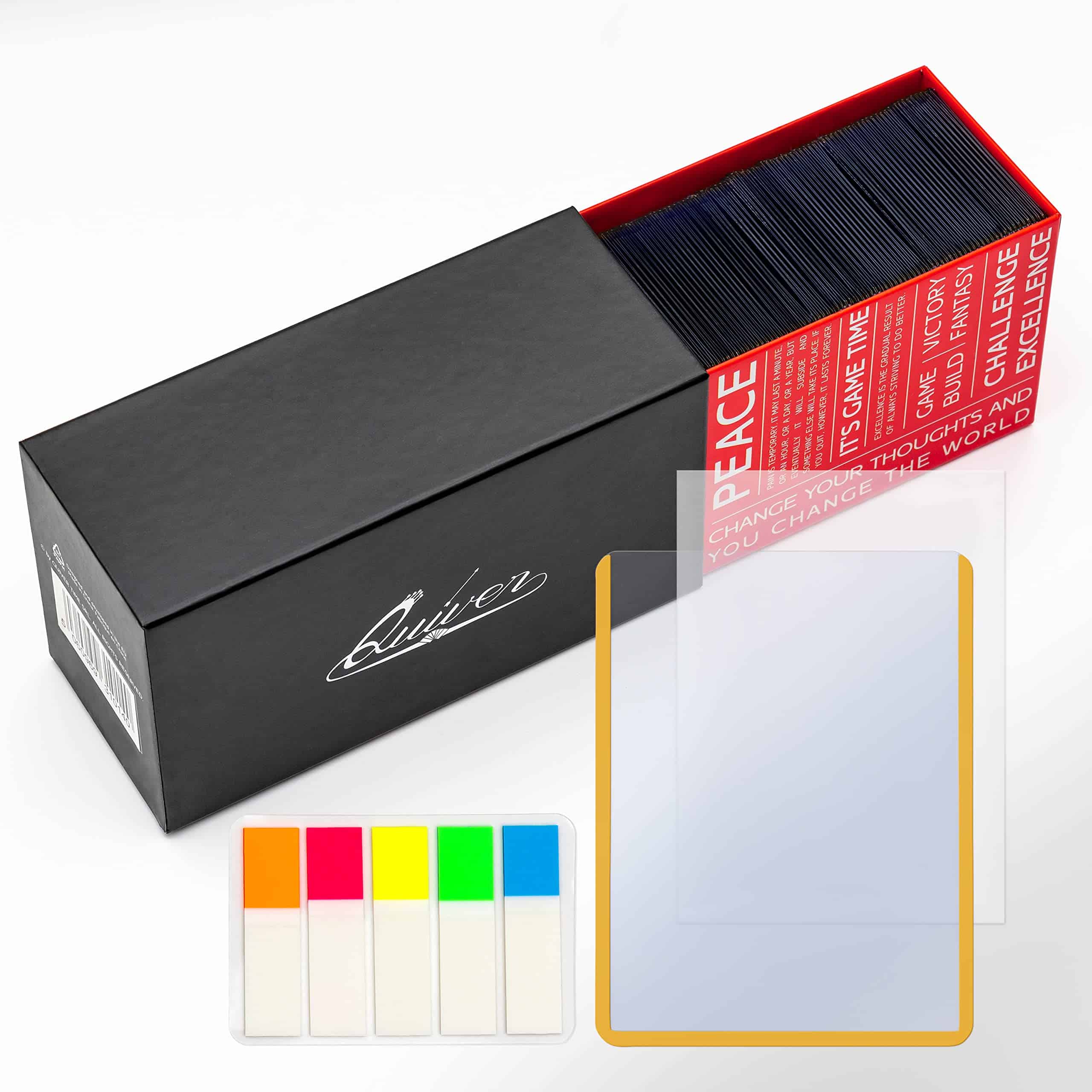 1. El paquete contiene: 100 fundas amarillas (3×4 pulgadas, 35 pts) + 100 fundas protectoras + 100 tiras de extracción + 1 elegante caja de almacenamiento. 2. Solución óptima para tus cartas deportivas: Las fundas rígidas de PVC de Quiver Time son un accesorio práctico y duradero que te permite proteger tus cartas deportivas más valiosas y cuidar mejor tus cartas deportivas. 3. Diseñado para tus cartas coleccionables: Estas fundas para cartas de intercambio vienen en un tamaño amplio de 3×4 pulgadas (76 x 102 mm) que es compatible con cartas coleccionables estándar como las cartas de MtG y también para cartas japonesas como Yu-gi-Oh. 4. Material extra grueso para una protección premium: Lo que destaca de las fundas de PVC de Quiver Time es el material de PVC de 0.35mm de grosor que garantiza una excelente protección contra rasguños, dobleces, marcas, polvo, residuos y otros. 5. Excelentes fundas duras para cartas: No solo nuestras fundas superiores para cartas de intercambio cuentan con una variedad de bordes de colores. Las fundas de PVC para cartas de colores también están recubiertas de película en ambos lados.