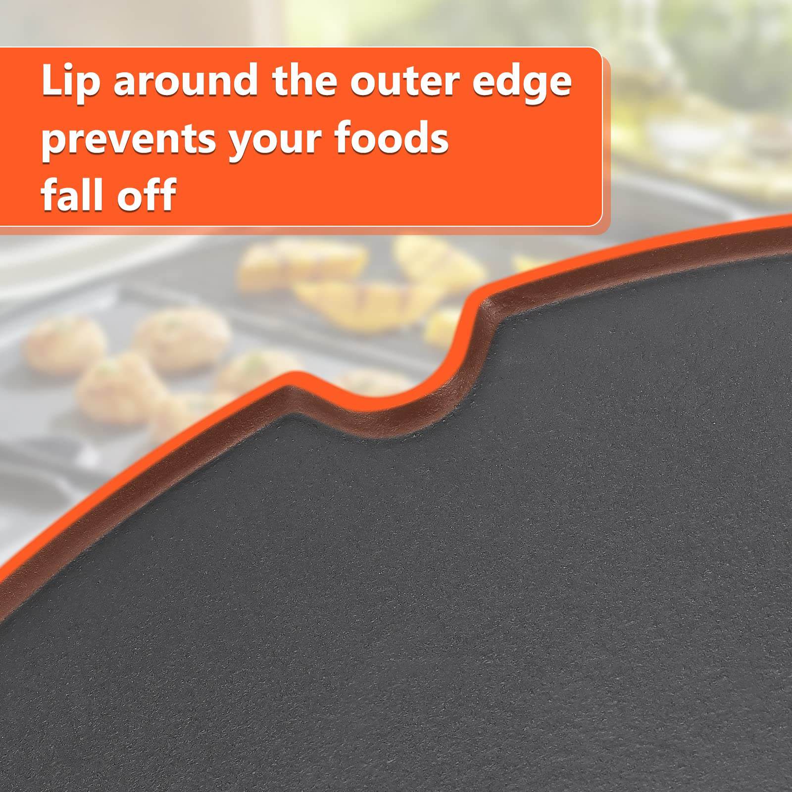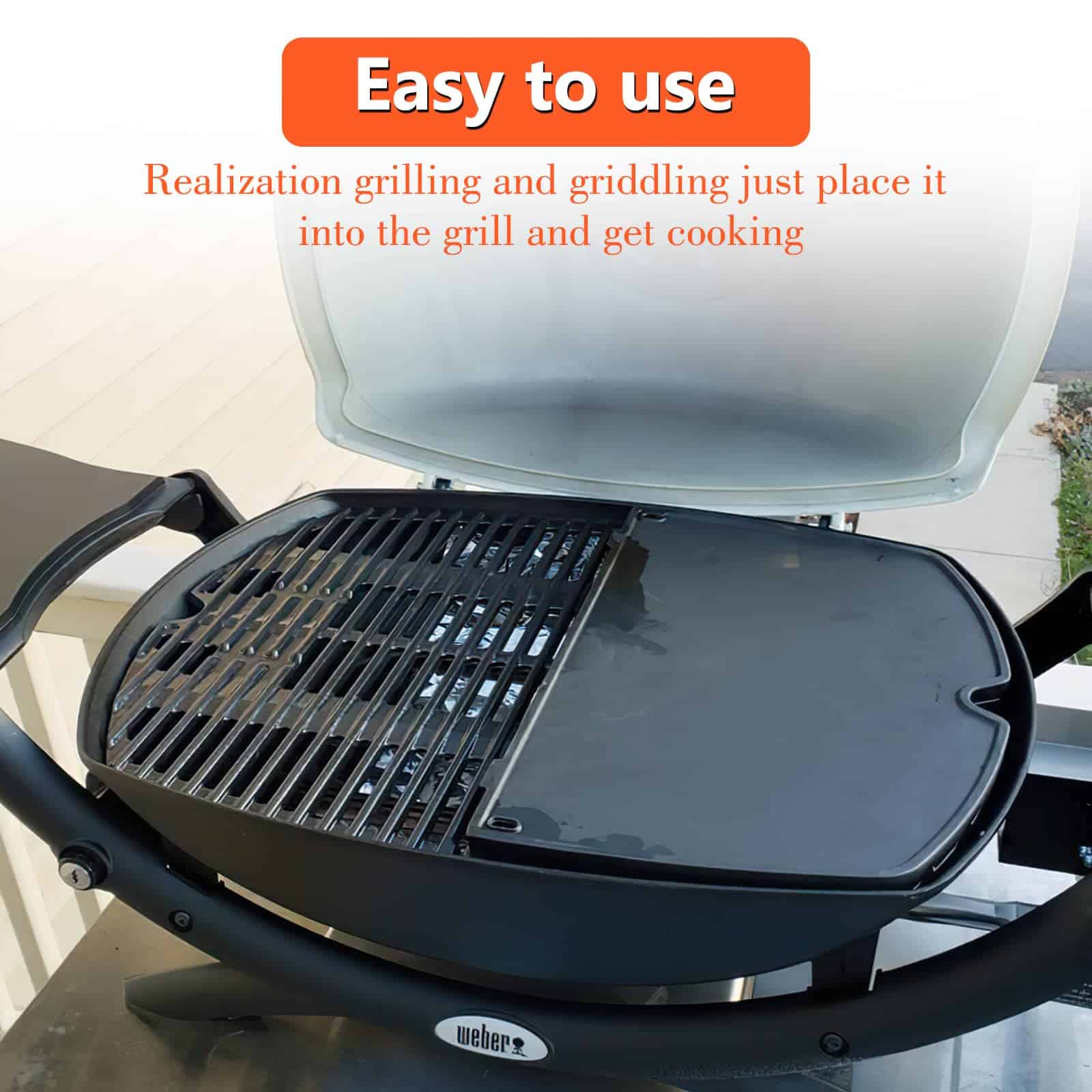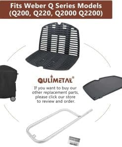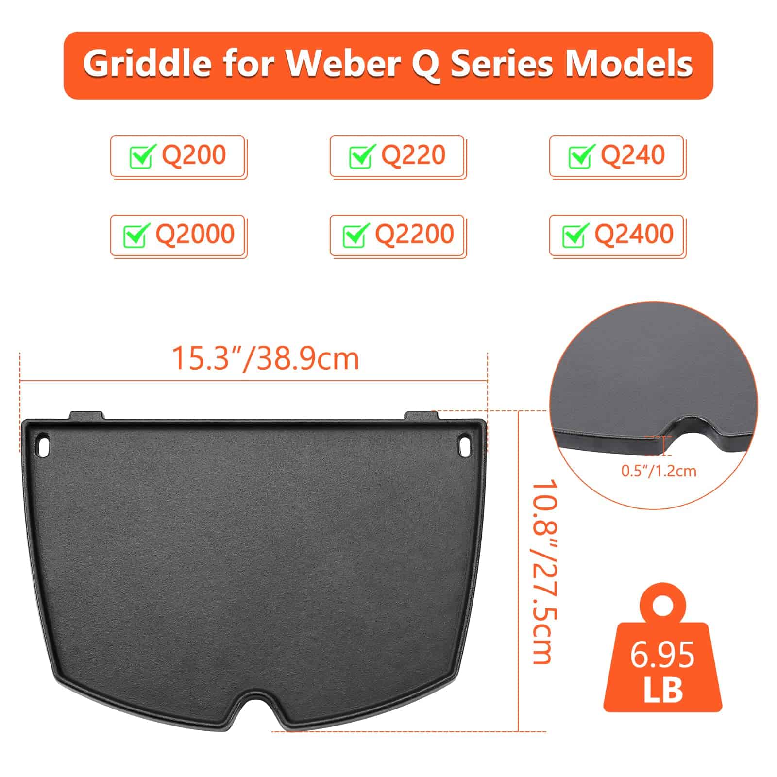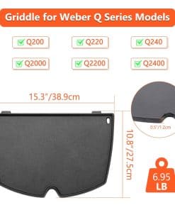 Este producto es una plancha de hierro fundido diseñada específicamente para adaptarse a las parrillas de las series Weber Q200, Q220, Q240, Q260, Q2000, Q2200, Q2400. También es compatible con los modelos Weber 396001, 396002, 394001, 566014, 566002, 566001, 55020001, 53060001, 54060001, 54060301. La plancha está construida con hierro fundido de alta calidad, lo que garantiza una durabilidad duradera y un rendimiento superior. El hierro fundido es conocido por su excelente retención de calor y distribución uniforme, lo que le permite lograr resultados de cocción consistentes cada vez, ya sea asando, sellando o preparando platos delicados. Se trata de un accesorio ideal para mejorar la experiencia de parrilla, permitiéndole cocinar una variedad de deliciosas comidas directamente en la parrilla sin la necesidad de reemplazar ninguna pieza existente. La plancha cuenta con un rebaje alrededor del borde exterior para evitar que los alimentos se caigan durante la cocción. Además, retiene el calor durante más tiempo, garantizando una cocción uniforme y siendo perfecta para preparar desayuno o piezas más pequeñas como tocino, vieiras, camarones, verduras, y más. Fácil de instalar y usar, esta plancha es una excelente adición a su parrilla Weber Q, ofreciendo una superficie de cocción versátil para todos sus platillos favoritos. Para evitar que se oxide, se recomienda raspar las parrillas después de cada uso, condimentarlas cepillando con aceite, dejar los reguladores de aire abiertos para evitar la acumulación de condensación, poner la tapa en la parrilla cuando no esté en uso, cubrir la parrilla cuando no esté en uso, y si necesita almacenar la parrilla por un largo período de tiempo, recubrir las parrillas con aceite de cocina, envolverlas en una bolsa de plástico y almacenarlas en la parrilla cubierta.