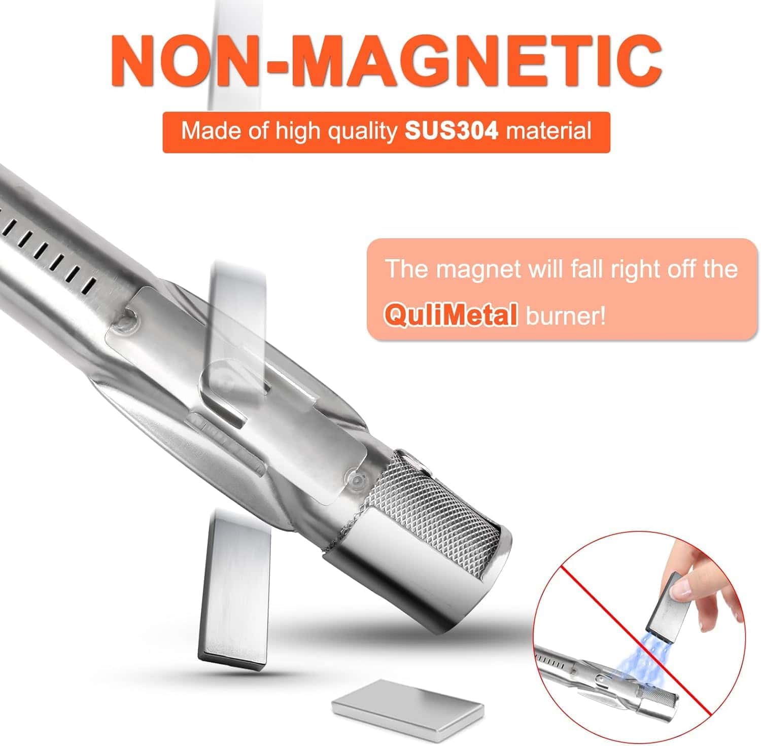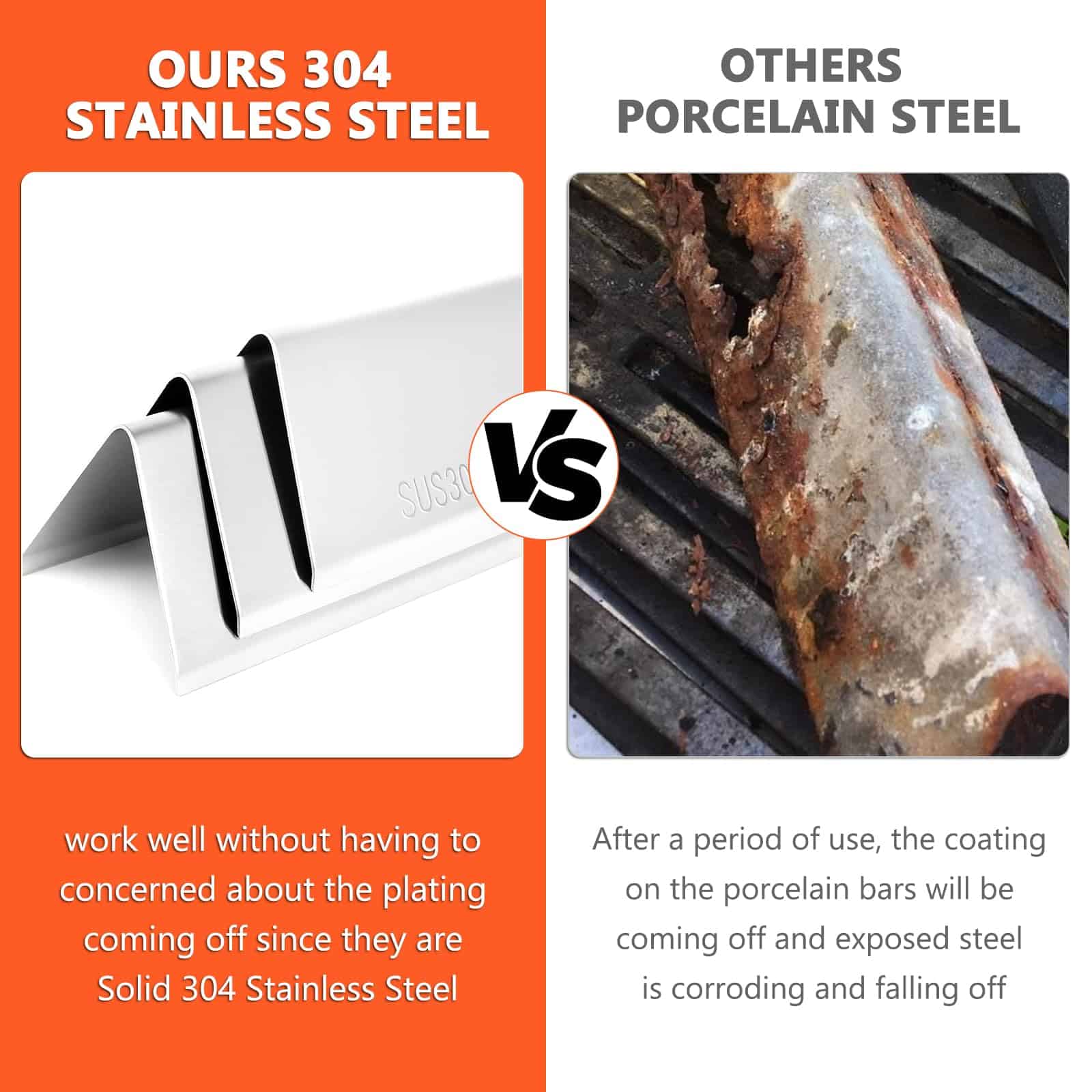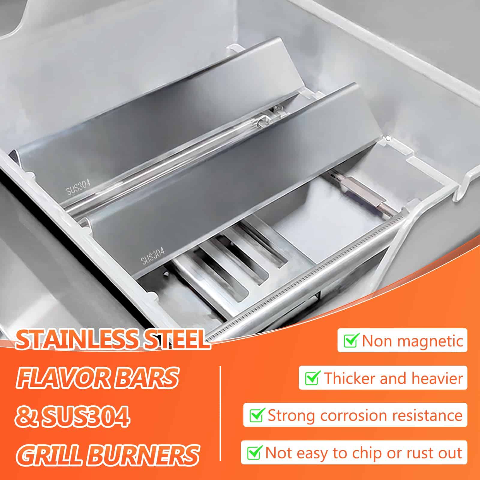 3. Acero Inoxidable Real No Magnético SUS304 Tanto las Barras Saborizantes Weber Spirit E-210 como los quemadores de parrilla están hechos de acero inoxidable 304 resistente, NO MAGNÉTICO, ofreciendo una fuerte resistencia a la corrosión y al calor. No se astillarán ni oxidarán, asegurando durabilidad y fácil limpieza.