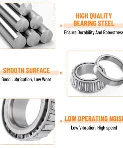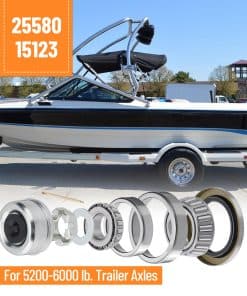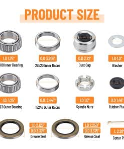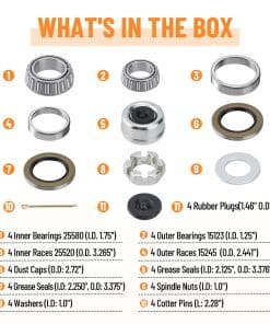 Nuestros kits de rodamientos para cubo de ejes de remolque garantizan un ajuste perfecto para su remolque con ejes tándem de 1.25″ a 1.75″ de 5200-6000 lb. D42 Husillo. En comparación con otros, ofrecemos tapones para polvo adicionales, tapones de goma y tuercas de husillo. Incluso se proporcionaron calzos y arandelas. El kit de rodamientos para ruedas de remolque cumple con su uso diario y un kit de rodamientos extra será una reserva. Fabricación de rodamientos de precisión, bajo ruido de trabajo. Nuestro sello de grasa cuenta con un diseño de doble labio, garantizando un rendimiento sin fugas. Todos los kits de rodamientos de eje de remolque de barco están hechos de materiales de acero de aleación de alta calidad. Juego de lujo completo: 4x rodamientos interiores 25580 (diámetro interno 1.75″) 4x carreras interiores 25520 4x rodamientos exteriores 15123 (diámetro interno 1.25″) 4x carreras exteriores 15245 8x sellos de grasa 22333TB 4x pasadores de chaveta 4x tapas de polvo 4x tapones de goma 4x tuercas de husillo 4x arandelas. Garantía de satisfacción: ¿Tiene alguna sugerencia o pregunta sobre los kits de rodamientos para remolque Si por alguna razón no está satisfecho, puede solicitar un reemplazo o un reembolso completo. Proporcionaremos una solución satisfactoria.