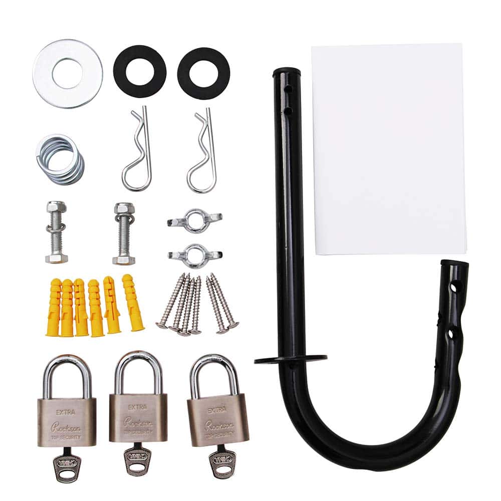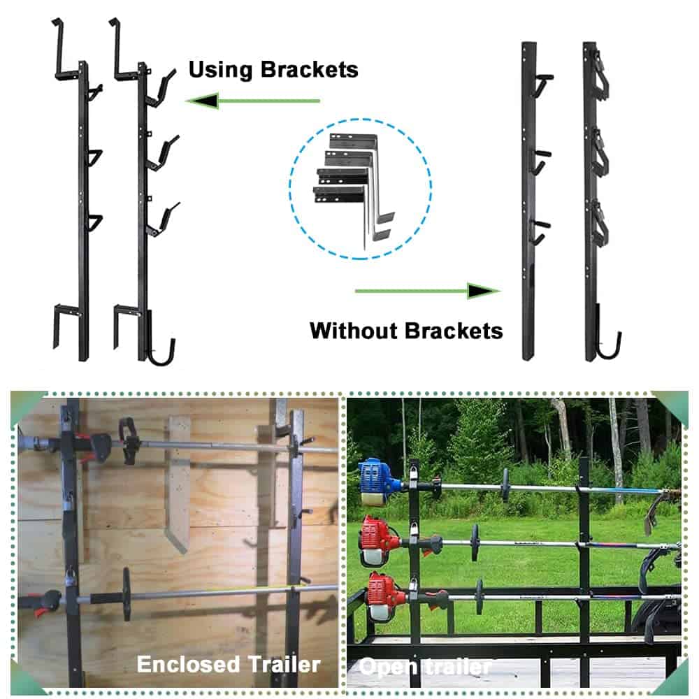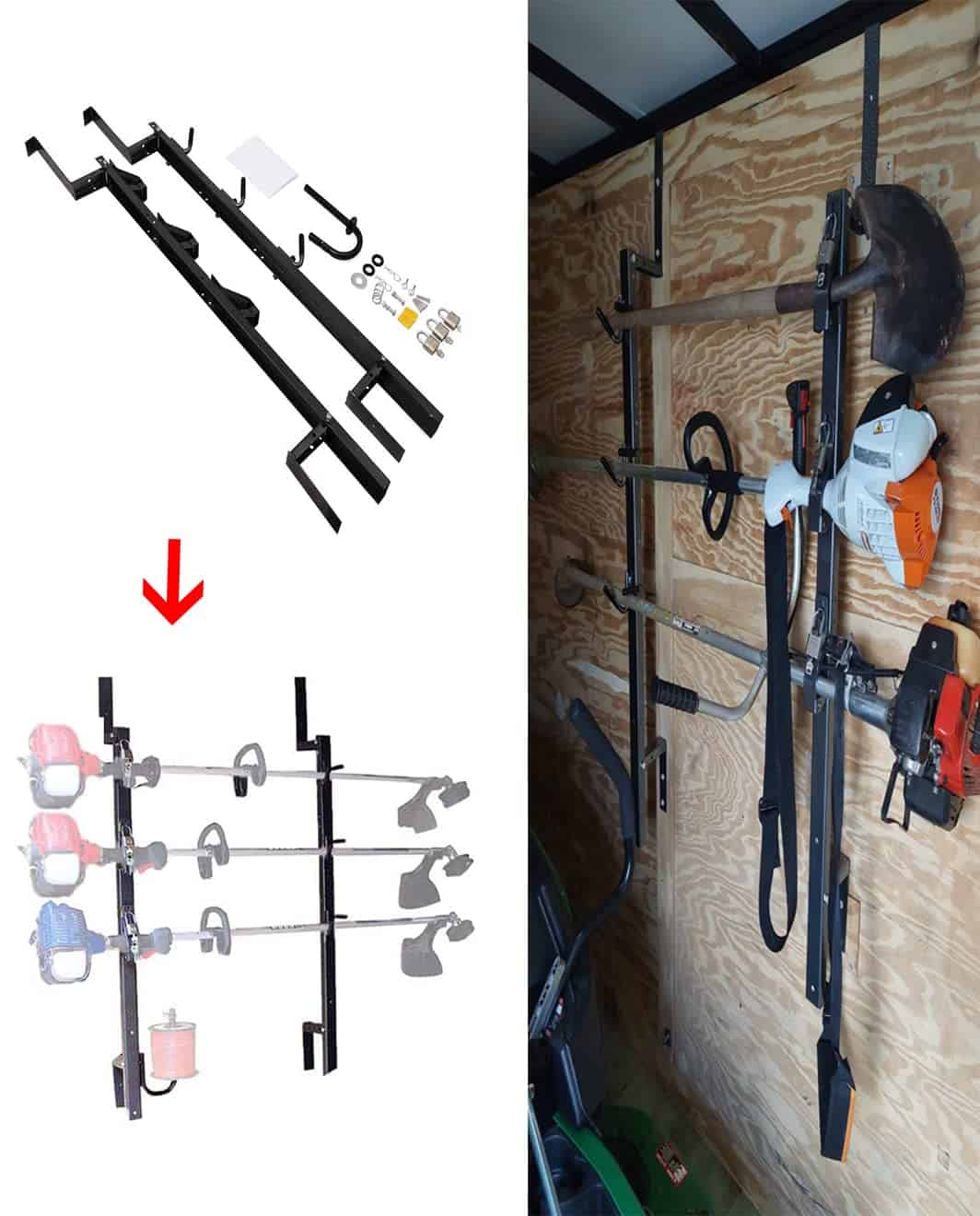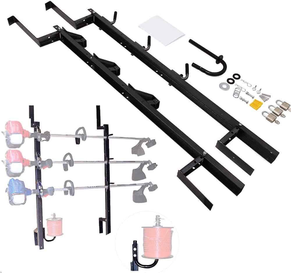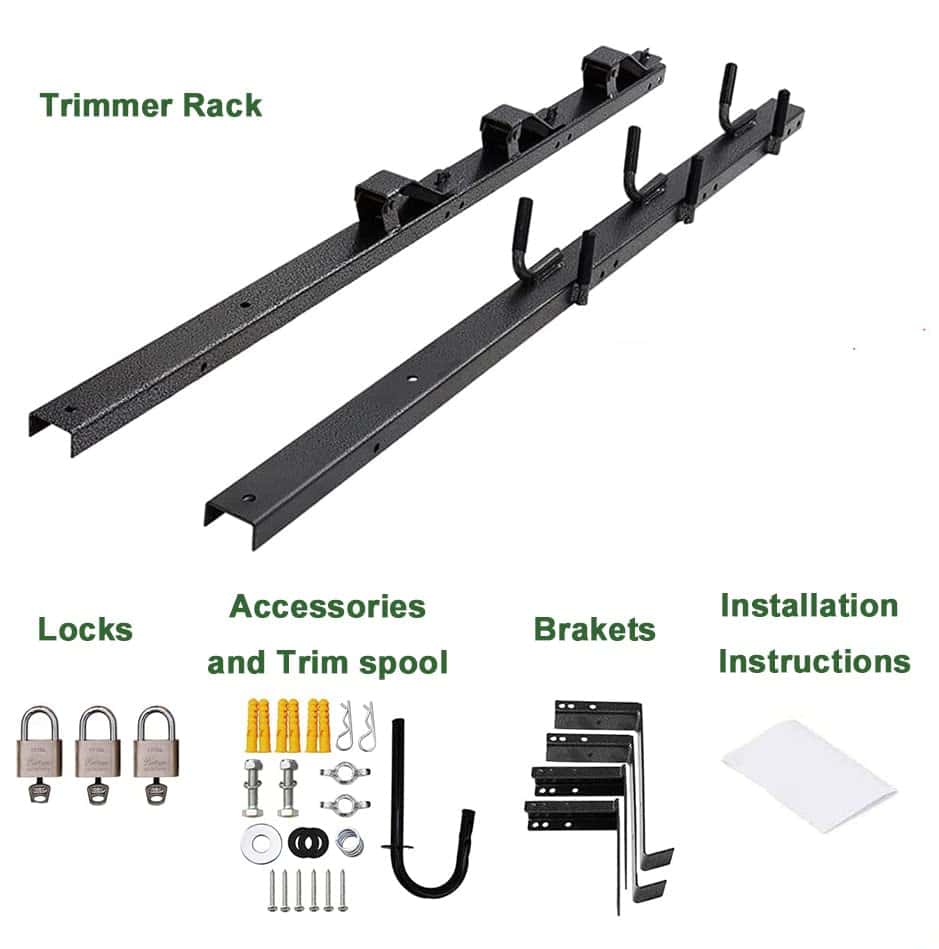 Materiales del Rack de Cortadora de Césped: Fabricado en acero resistente con acabado en martillo gris y recubrimiento en polvo negro. Incluye: Un soporte para línea de corte de 3 libras viene con 3 cerraduras con llave iguales, cortadoras no incluidas (como se muestra en la imagen). Compatibilidad con Vehículos: Se ajustará a la mayoría de las cortadoras de eje recto. Diseño del gancho del rack de cortadora en la parte superior que permite colgarlo del remolque para mayor resistencia. Fácil de Instalar: No requiere corte, el rack se puede atornillar de forma segura a la pared. Con instrucciones de instalación.