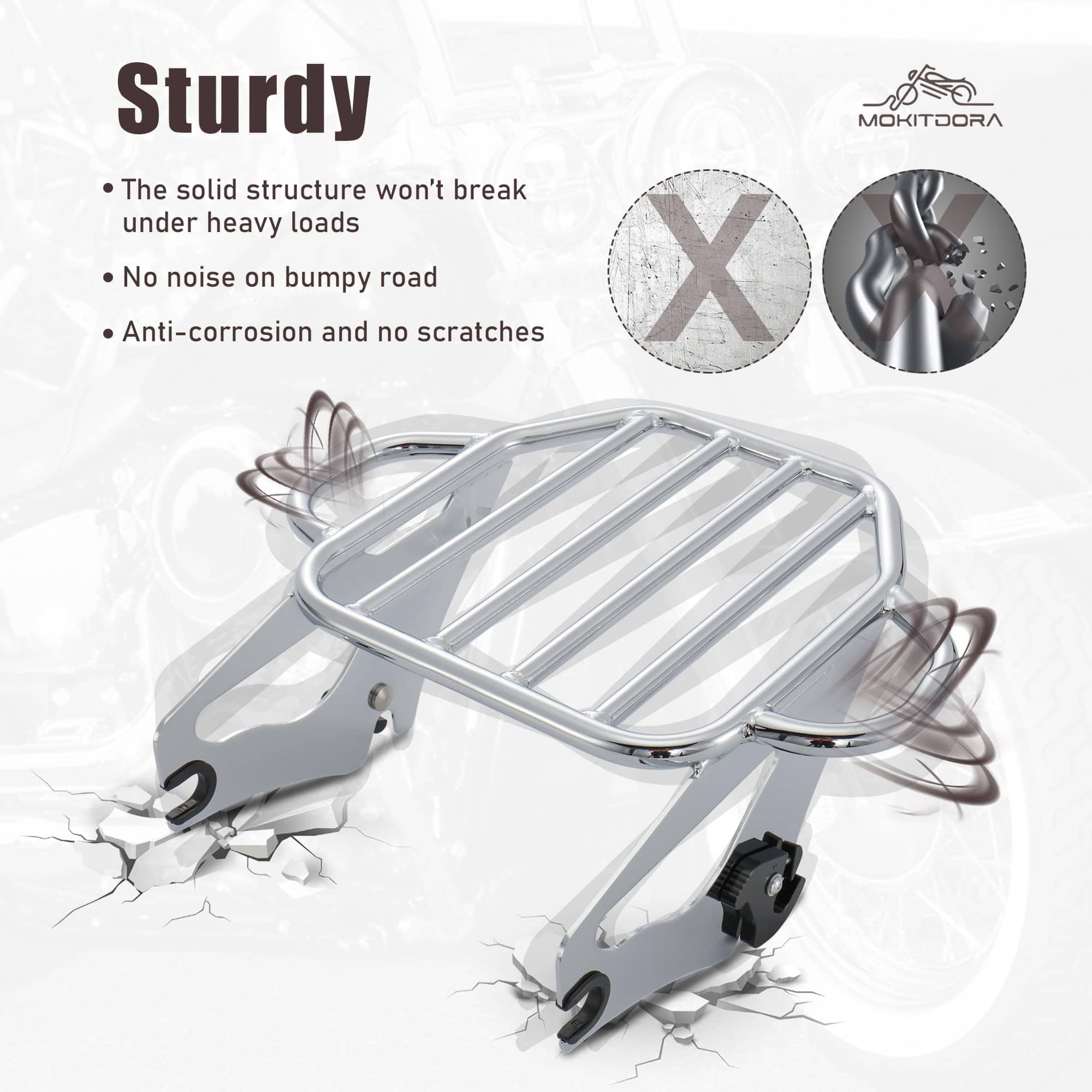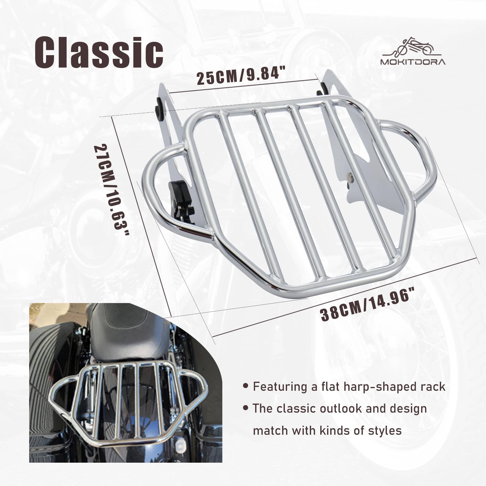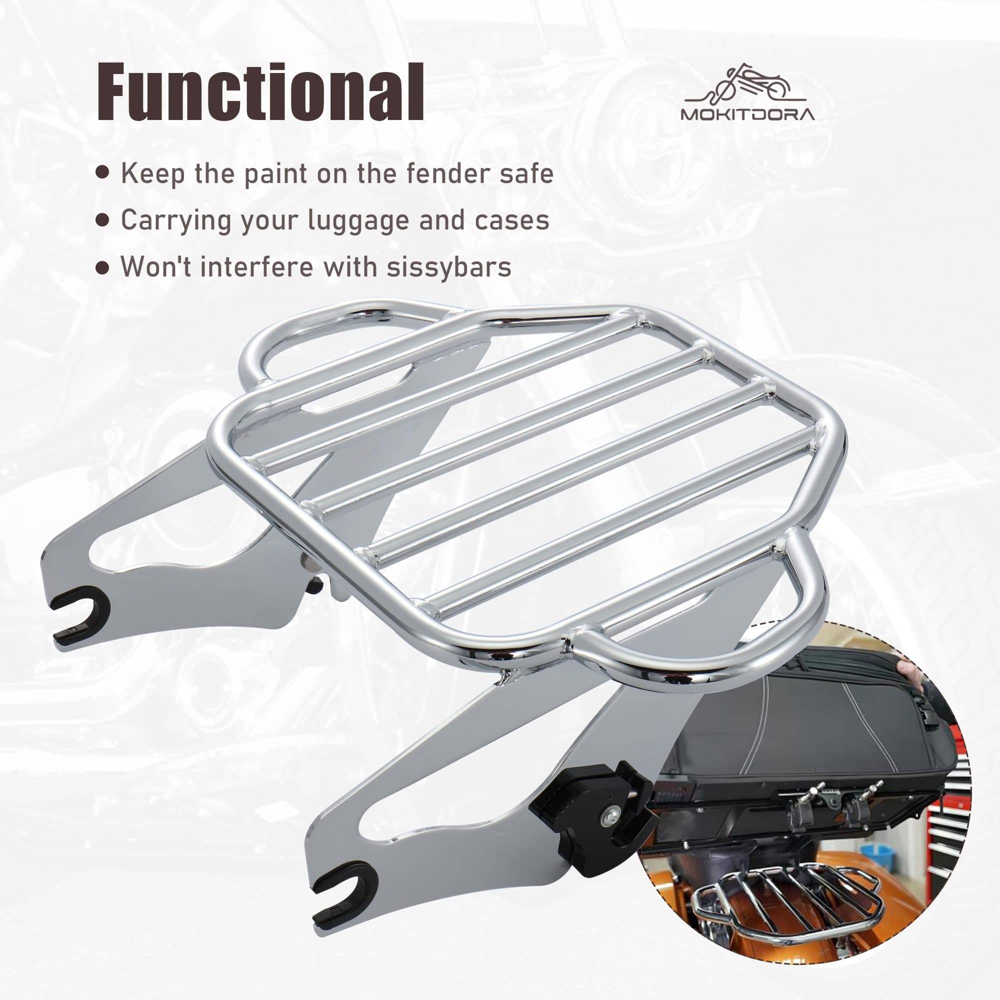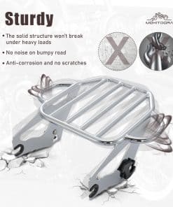 Reemplazo premium de mercado secundario ajustable estante de equipaje desmontable de dos plazas compatible con Harley Touring 2009 en adelante Road King, Road Glide, Street Glide y Electra Glide Models (excepto ’24-later FLTRXSTSE). Este estante de equipaje es perfecto para aquellos que buscan una solución duradera y confiable para transportar equipaje durante sus viajes en motocicleta. Construido con acero al carbono y una superficie recubierta en polvo, este estante de equipaje garantiza una resistencia a la corrosión y una durabilidad excepcionales para soportar los rigores de la carretera. Su diseño versátil en forma de arpa plana ofrece la posibilidad de asegurar varios tipos de equipaje de forma segura, brindando a los motociclistas una solución práctica y fácil de usar para sus necesidades de transporte. Compatible con el hardware de acoplamiento de 4 puntos de Harley, la instalación de este estante de equipaje es rápida y sencilla, lo que permite a los usuarios personalizar su motocicleta de manera conveniente. Con una capacidad de equipaje de 30lb, este estante de equipaje proporciona suficiente espacio para las necesidades diarias sin comprometer la seguridad. La superficie cromada no solo mejora la resistencia a la corrosión, sino que también realza la estética general de la motocicleta, protegiendo el estante de la oxidación y manteniendo un aspecto pulido. La construcción robusta de acero al carbono garantiza la estabilidad y resistencia del estante durante los paseos, proporcionando a los motociclistas la confianza en la seguridad de su carga. Además, el diseño aerodinámico de este estante de equipaje minimiza la resistencia al viento, mejorando la eficiencia de combustible y el manejo de la motocicleta. Respaldado por un servicio al cliente disponible las 24 horas, los clientes pueden contar con asistencia y soluciones satisfactorias para cualquier pregunta o problema que puedan surgir durante el uso de este estante de equipaje.