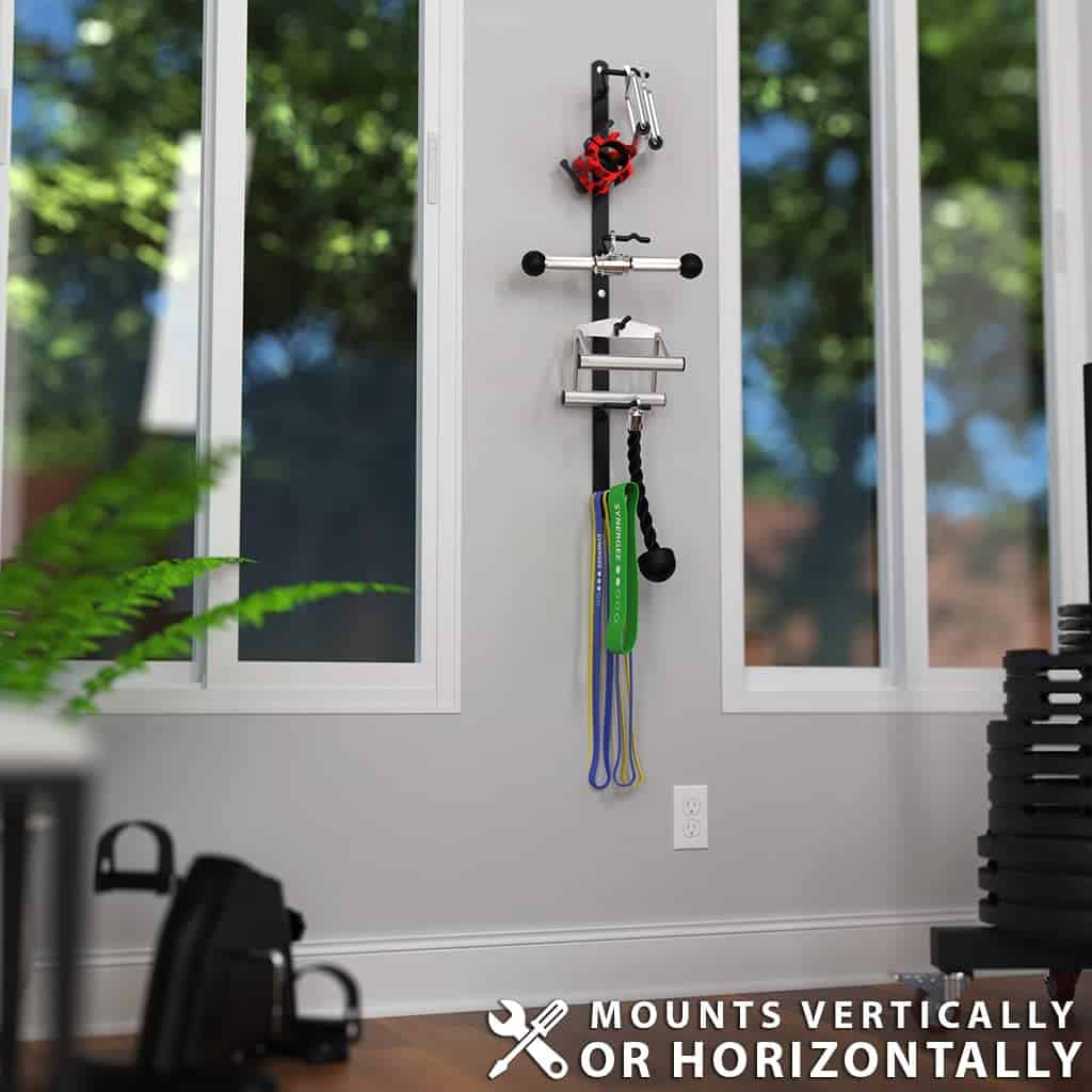 Organiza tus manijas de máquina de cable con este Rack de Montaje en Pared de Synergee. Este rack es perfecto para almacenar una amplia gama de manijas de máquina de polea, barras de lats, manijas en D, barras rectas, barras en V, cuerdas de tríceps y más. Con 6 postes de almacenamiento recubiertos de polvo negro, este rack está diseñado para mantener tu equipo alejado de las paredes y evitar daños, al tiempo que acomoda el punto de anclaje universal en las manijas de acoplamiento de cable estándar. El rack se puede montar vertical u horizontalmente en tu pared con 3 pernos, proporcionando un amplio almacenamiento sin ocupar espacio en el suelo. Con una capacidad de peso máxima de 100 lbs y una fácil instalación, este rack es una solución conveniente para mantener tu equipo organizado y accesible en tu gimnasio en casa. ¡Compra en Synergee y disfruta de un servicio al cliente rápido y atento para garantizar la satisfacción del cliente!