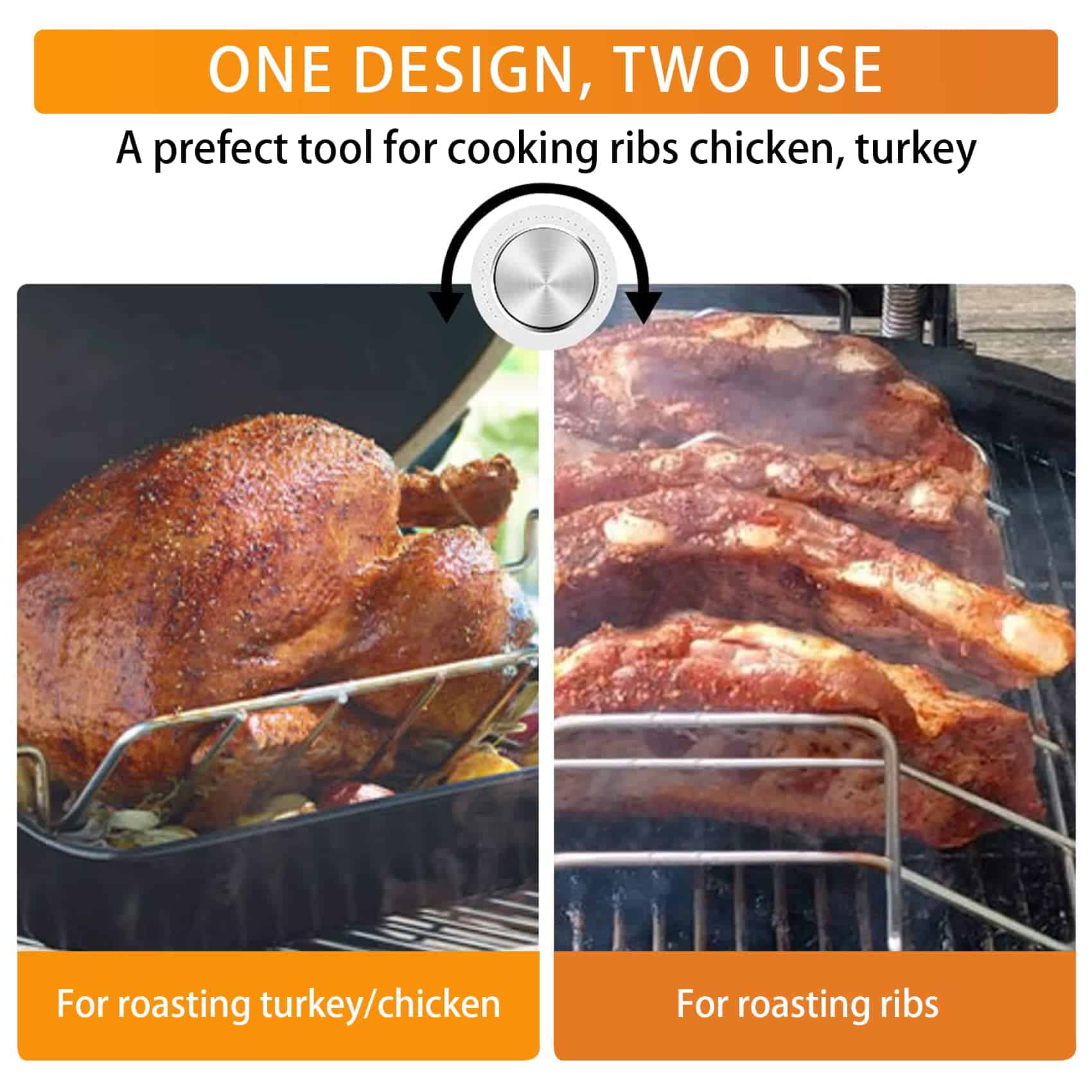 1. Diseño 2 en 1: El diseño práctico hace el trabajo sin necesidad de múltiples accesorios; se puede utilizar un lado para el pavo mediano y voltearlo para utilizar el otro lado para hacer costillas. ¡Podrás hacer costillas, un pollo entero, solomillo de cerdo, lomo de res, y mucho más, todo con solo este rack! Un gran accesorio para tu parrilla.