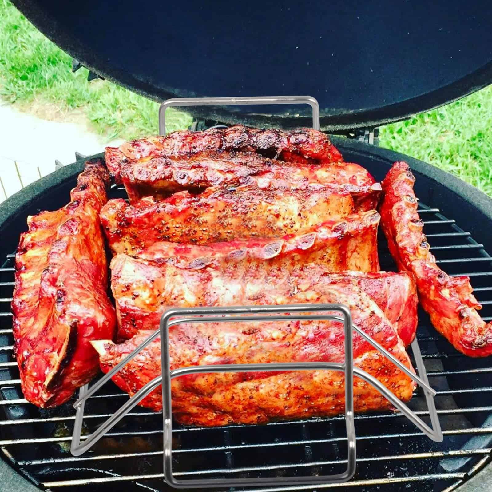 2. Cocina 6 estantes de costillas perfectos a la vez: ¡El rack permite un calor por convección para cocinar uniformemente 6 estantes de costillas a la vez! Este rack hace la parrilla rápida y fácil, puedes usarlo para cocinar más comida cuando no hay mucho espacio en la parrilla. ¡Se sugiere usar con una bandeja de goteo!